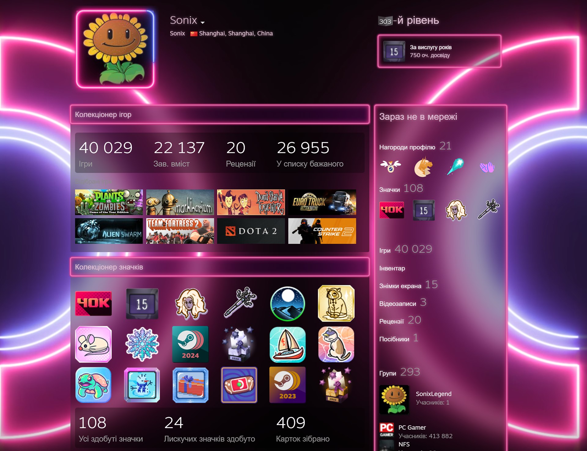 Согласно данным открытого профиля пользователь под ником Sonix проживает в китайском Шанхае. Сейчас в его библиотеке 40029 игр, 22136 дополнений и еще 26956 игр находится в списке желаемого. Такую коллекцию он собрал за 15 лет. Любимая игра — это мультиплеерная Alien Swarm 2010 года, в которой он провел 551 час. Но также Sonix оказался любителем Counter-Strike 2, Dota 2, Team Fortress 2, Euro Truck Simulator 2, Don’t Starve Together, Plants vs. Zombies и Machinarium. Сервис SteamDB позволяет примерно оценить стоимость всех игр на аккаунте, и для этого пользователя он выдает сумму около $250 тысяч.