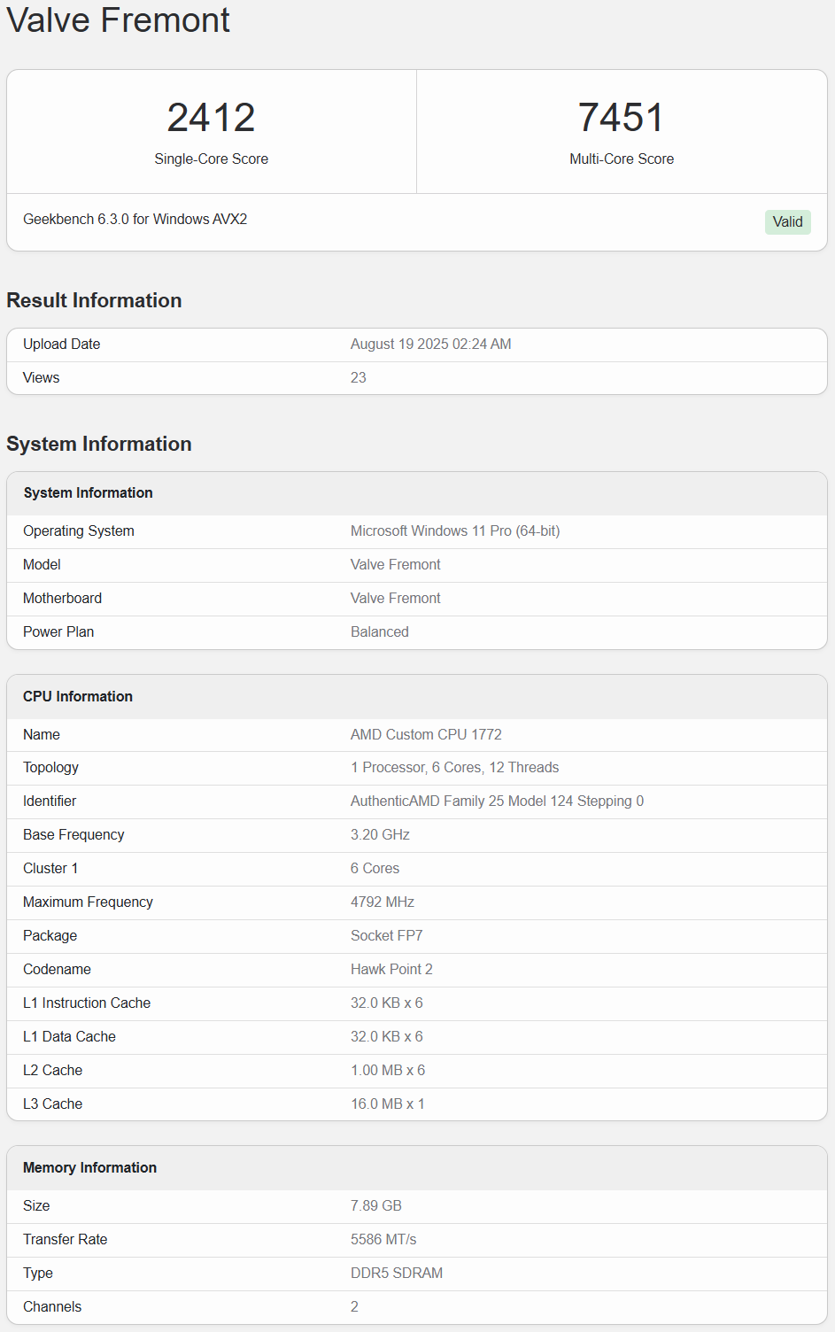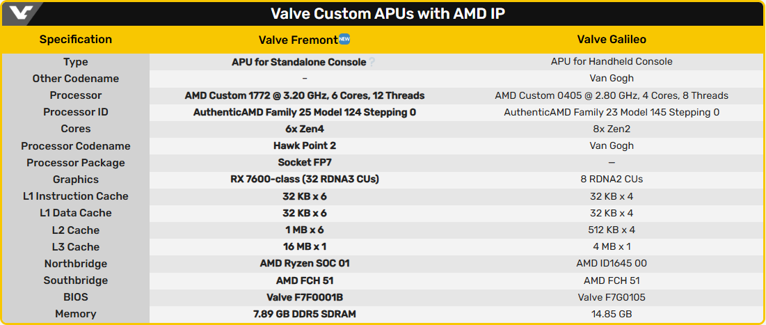 В бенчмарке была замечена тестовая платформа Valve Fremont. Она сочетает 6‑ядерный/12-поточный процессор семейства AMD Hawk Point (архитектура Zen 4), разработанный по отдельному заказу, и, что самое интересное, графику класса Radeon RX 7600. Эта видеокарта, напомним, предлагает 32 Compute Units или 2048 потоковых процессоров с архитектурой RDNA 3, 128-разрядную шину и восемь гигабайтов памяти GDDR6.