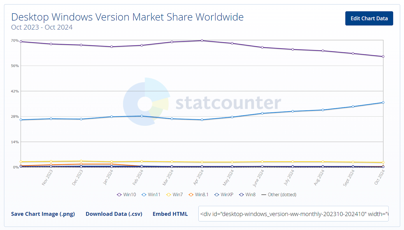Компания Microsoft активно продвигает свою операционную систему Windows 11, но многие консервативные пользователи предпочитают использовать предыдущую версию. Это подтверждает новая статистика от StatCounter. Согласно глобальным данным в дескоптном сегменте доля Windows 11 стабильно растет и по итогам октября уже вплотную приблизилась к 36%. Но это все еще меньше количества ПК с Windows 10, доля которых в мире достигает 61%. Windows 7 c 2,6% удерживает третье место.