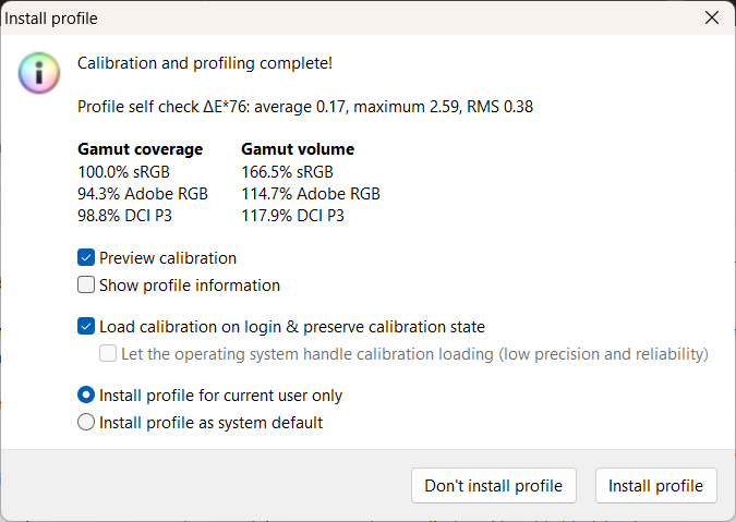 Пиковая яркость 500 кд/м² и сертификация VESA DisplayHDR True Black 500 делают экран пригодным для использования в ярко освещенных помещениях. Фактические показатели тестов несколько ниже, но также неплохие: