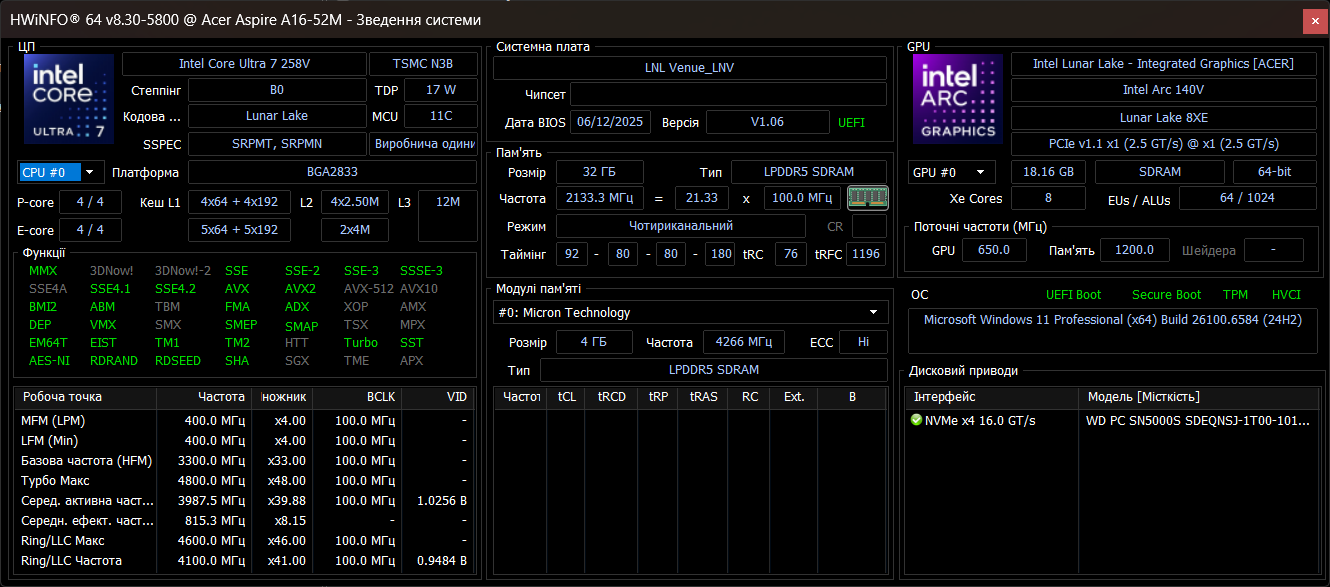 Основой Acer Aspire 16 AI (A16-52M) являются процессоры Intel Core Ultra Series 2 (Lunar Lake), которые представляют «уже не такую и новую» философию Intel с приоритетом энергоэффективности. Доступные варианты включают Core Ultra 5 226V для базовых моделей и Core Ultra 7 256V/258V для топовых конфигураций, как на тесте. Архитектура процессоров включает восемь ядер без Hyper-Threading: четыре производительных ядра Lion Cove и четыре энергоэффективных Skymont. Отказ от многопоточности упрощает планирование задач и снижает энергопотребление, хотя ограничивает максимальную многопоточную производительность. Максимальная частота достигает 4,8 ГГц. Ключевым компонентом для статуса Copilot+ PC является нейронный процессор Intel AI Boost. NPU эффективно обрабатывает локальные AI-задачи, включая Windows Studio Effects, автоматические субтитры и функцию Recall. Текущая экосистема приложений, оптимизированных для NPU, остается ограниченной, делая эту функцию инвестицией в будущее.