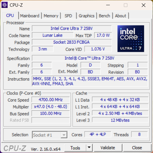 Оперативная память LPDDR5X объемом 16 или 32 ГБ распаяна на материнской плате без возможности апгрейда. Это критическое ограничение для долгосрочного использования, поскольку выбранная конфигурация остается неизменной на весь срок службы устройства. Собственно, именно объем памяти является различием между Core Ultra 7 256V и 258V — «высший» процессор поддерживает 32 ГБ вместо 16 ГБ и, соответственно, ноутбук также.