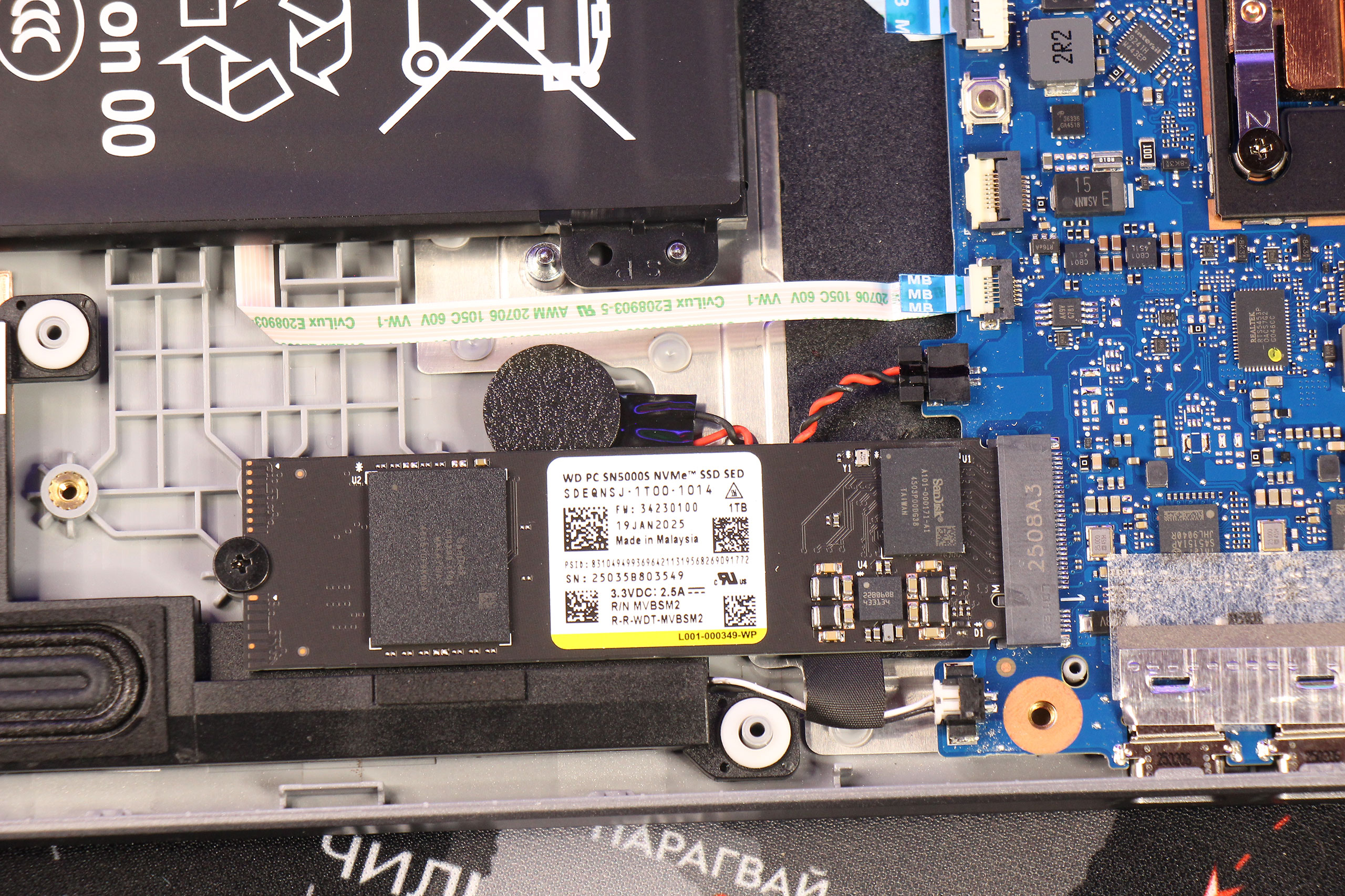 Накопитель NVMe PCIe 4.0 емкостью 1 ТБ производства WD установлен в стандартный слот M.2 и может быть заменен пользователем. Это единственный компонент, доступный для апгрейда, который позволит расширить объем хранилища в будущем.