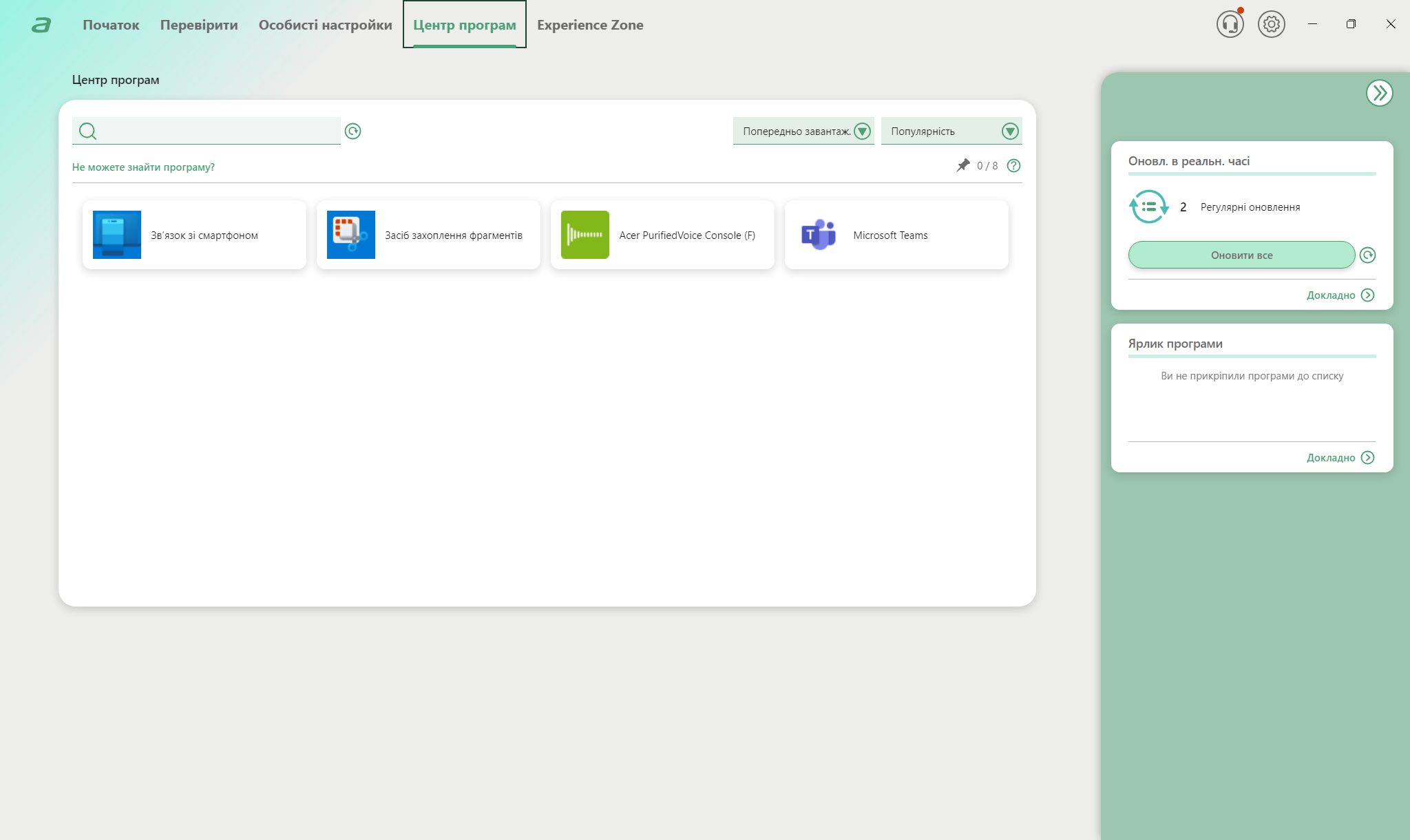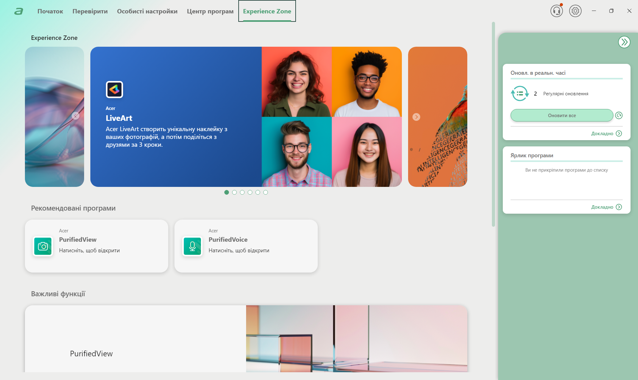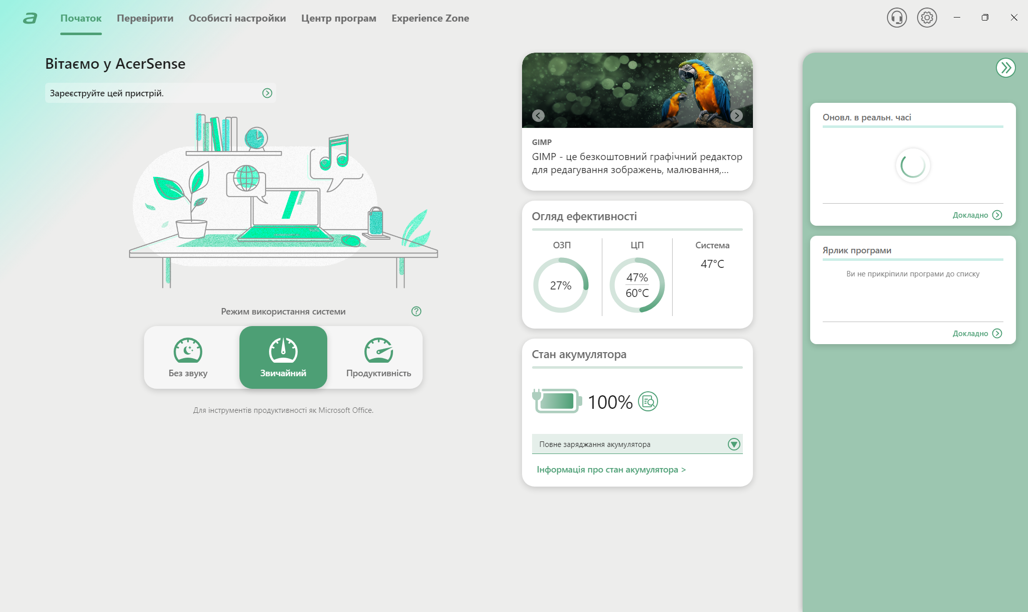 Центральной утилитой управления системой выступает AcerSense, для вызова которой есть даже отдельная кнопка на клавиатуре. Интерфейс предоставляет доступ к профилям производительности, мониторингу температур, настройкам дисплея и батареи. Технология PurifiedVoice 2.0 использует AI для фильтрации фонового шума во время разговоров, улучшая качество звука от встроенных микрофонов. Предустановленное ПО минимальное, что положительно отличает Acer от некоторых конкурентов. Кроме AcerSense и стандартных приложений Windows 11, система относительно чистая.