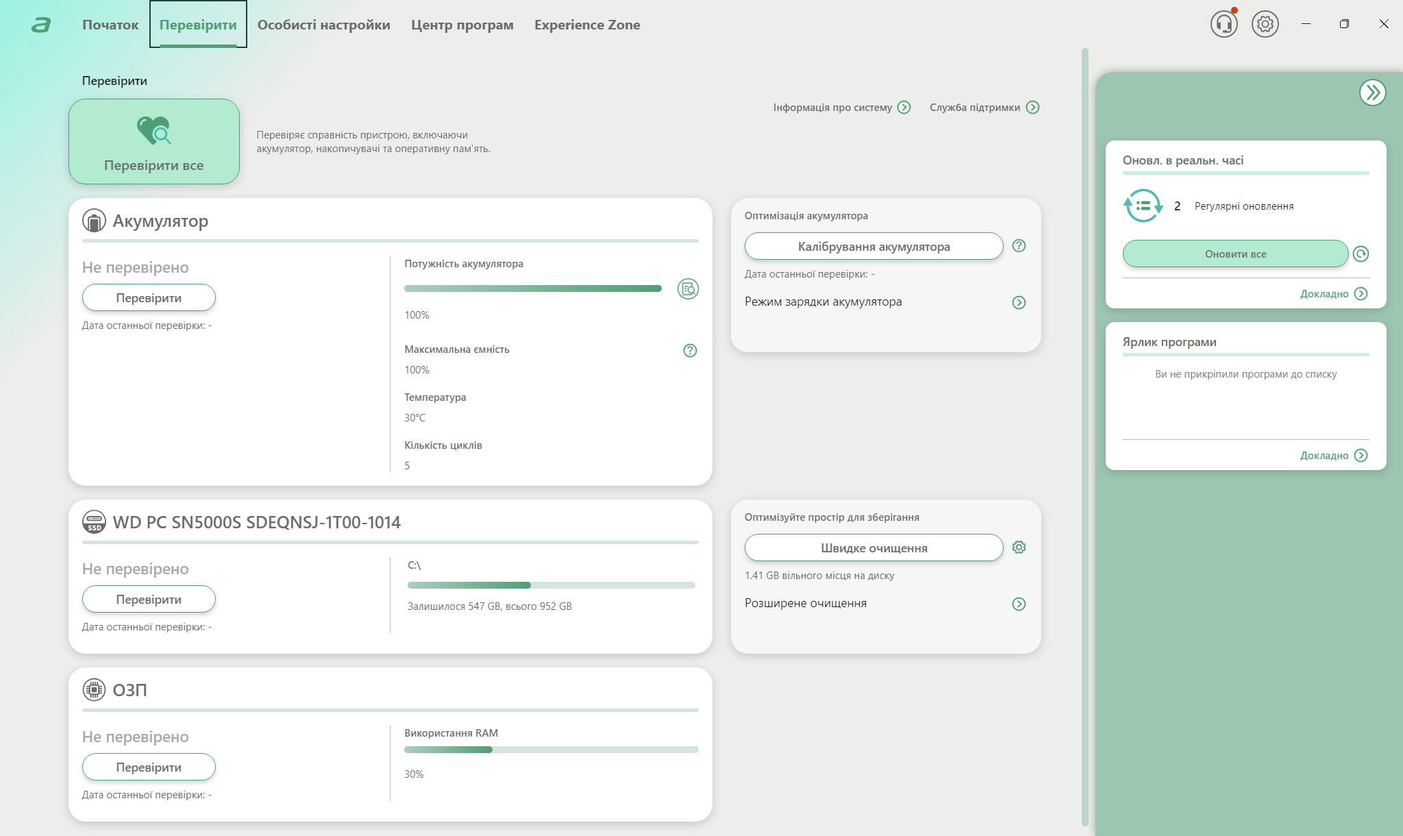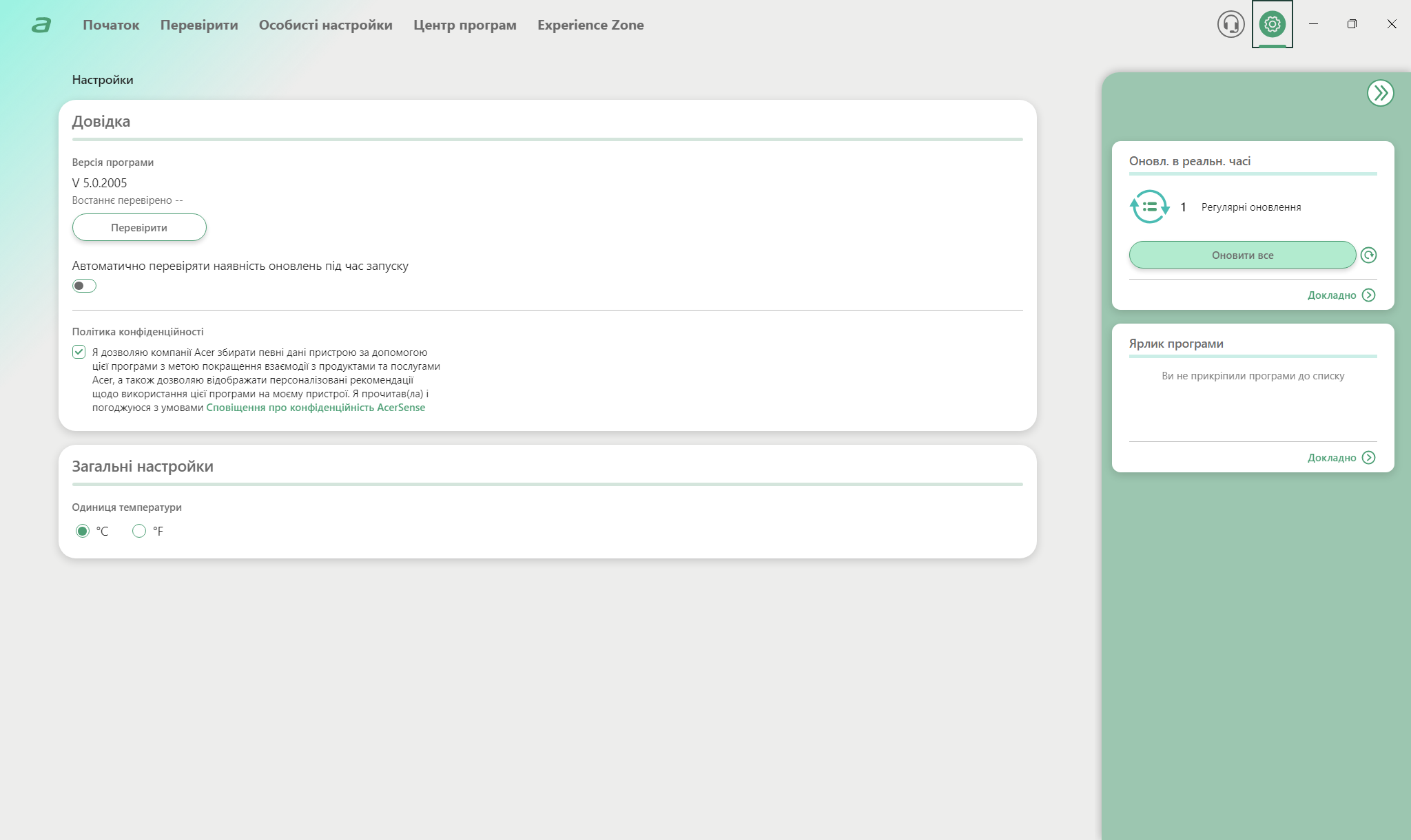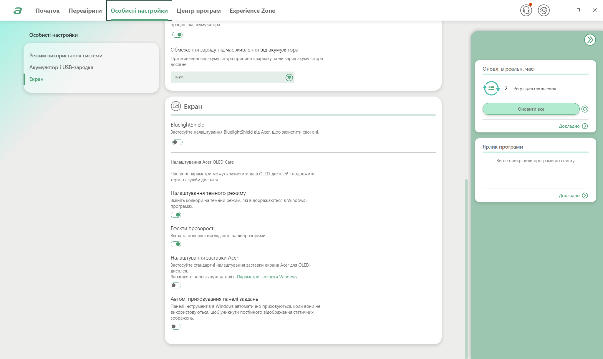 Центральной утилитой управления системой выступает AcerSense, для вызова которой есть даже отдельная кнопка на клавиатуре. Интерфейс предоставляет доступ к профилям производительности, мониторингу температур, настройкам дисплея и батареи. Технология PurifiedVoice 2.0 использует AI для фильтрации фонового шума во время разговоров, улучшая качество звука от встроенных микрофонов. Предустановленное ПО минимальное, что положительно отличает Acer от некоторых конкурентов. Кроме AcerSense и стандартных приложений Windows 11, система относительно чистая.