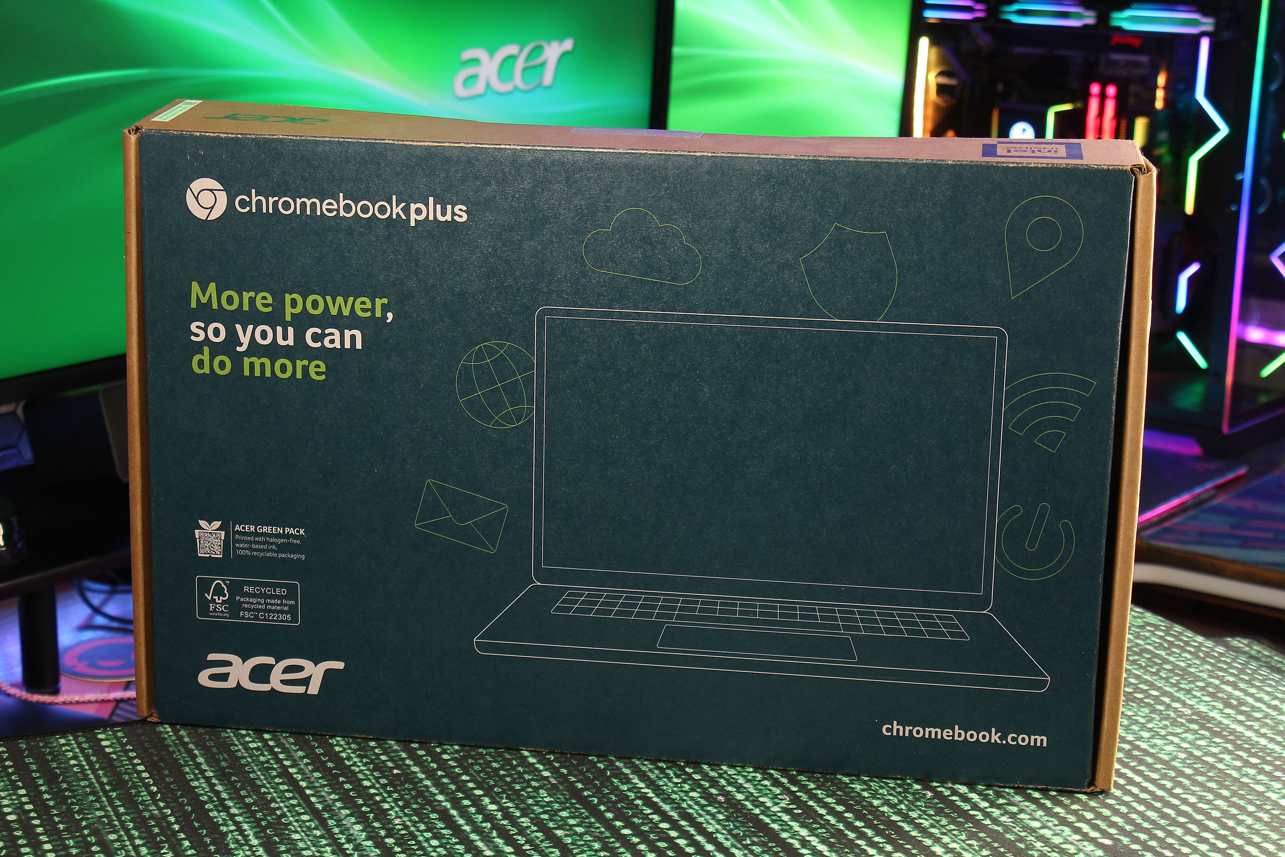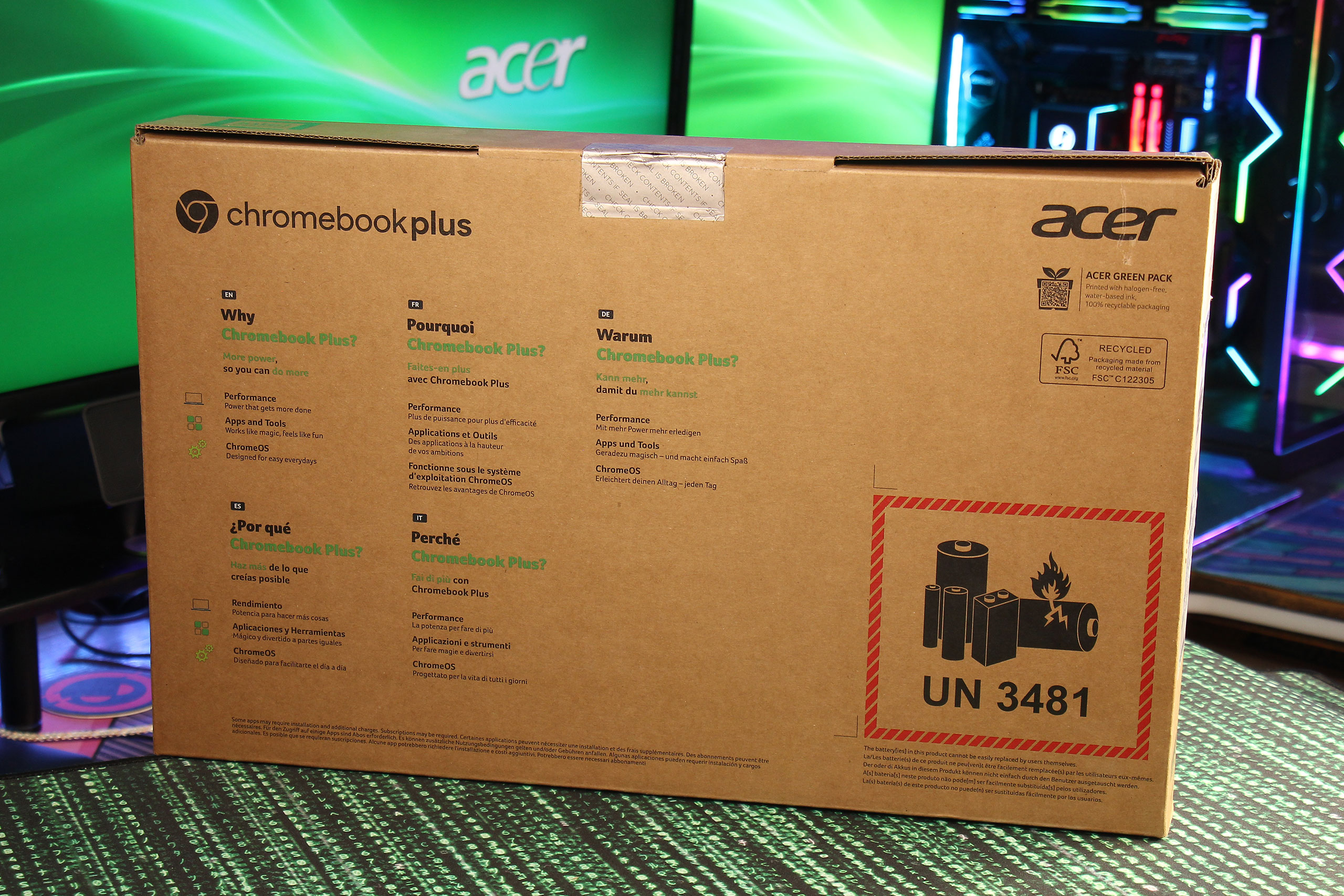 Коробка Acer Chromebook Spin 514 выполнена в минималистичном стиле, типичном для продуктов категории Chromebook. В отличие от громких игровых решений, здесь все сдержанно и с акцентом на экологичность.
