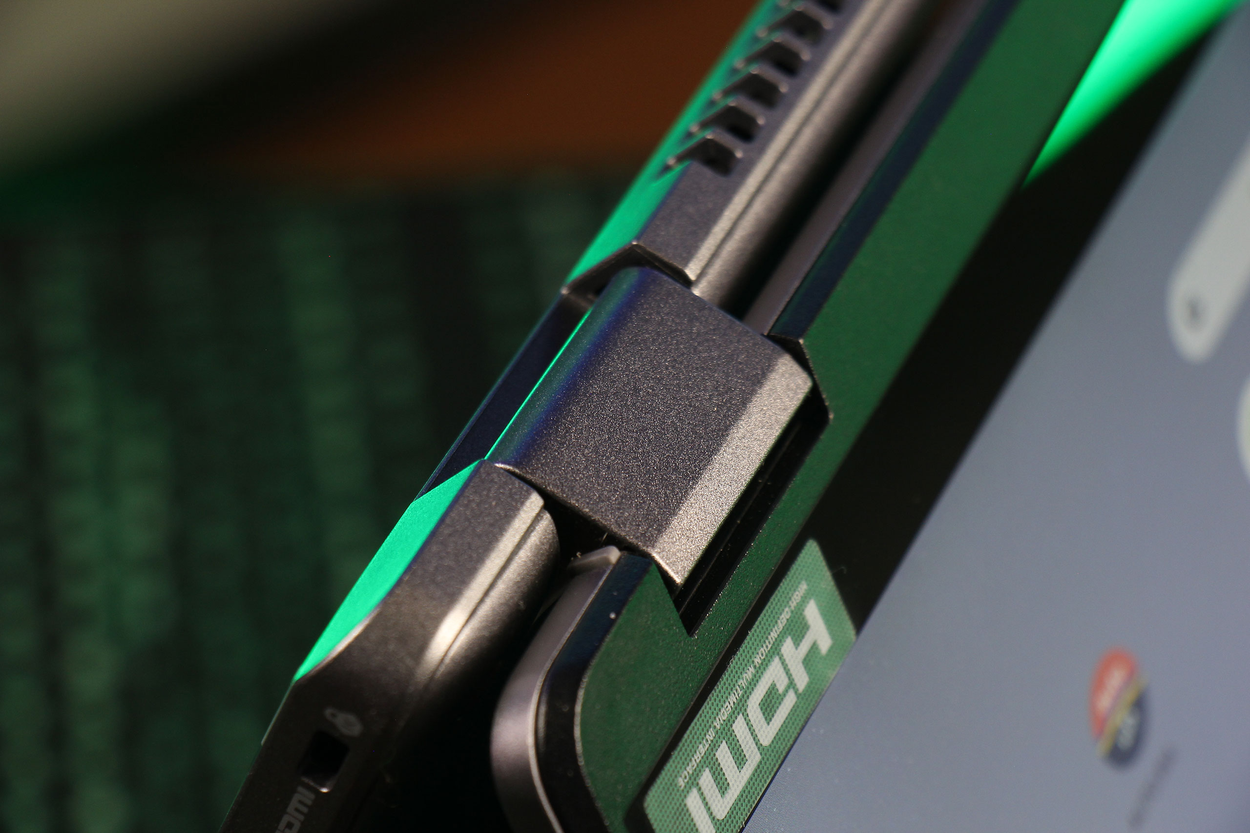 Главной особенностью конструкции являются шарниры, позволяющие экрану вращаться на 360 градусов. Они массивные, но хорошо вписываются в общий дизайн. Их механизм достаточно упругий, чтобы удерживать экран в любом положении и при этом не слишком тугой, чтобы трансформация была комфортной.