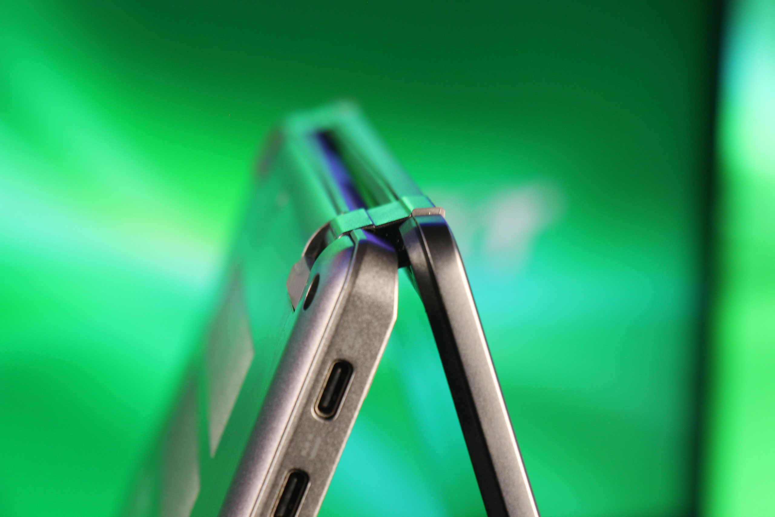 Порты расположены по обеим сторонам корпуса. Слева находятся два порта USB‑C 3.2 Gen 2 и комбинированный аудио-разъем 3,5 мм. Оба порта USB‑C поддерживают технологию Power Delivery, поэтому зарядку можно подключать с любой стороны, что удобно в различных сценариях использования. Оба порта USB‑C можно использовать для подключения внешних мониторов через DisplayPort Alternate Mode. Также здесь присутствует приятная хромированная кнопка включения со встроенным светодиодным индикатором работы или зарядки. Замечательная деталь во времена поголовного использования клавиатуры для размещения кнопки Power, но также необходимая вещь именно для формата трансформера, ведь включать хромбук в режиме планшета с кнопки возле клавиатуры было бы просто неудобно. Вместо этого в правом верхнем углу клавиатуры размещена кнопка Lock, возвращающая устройство на lock-экран.