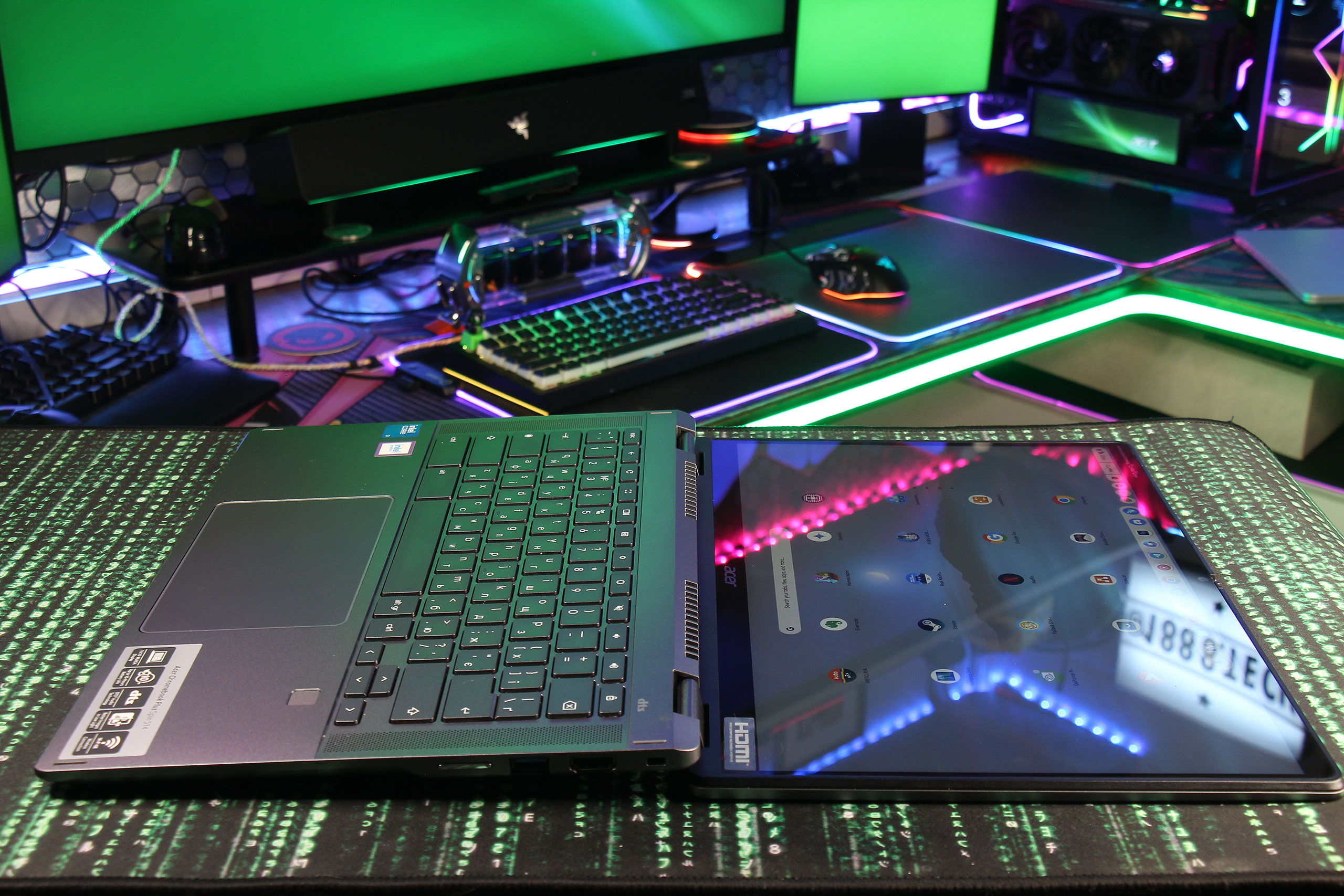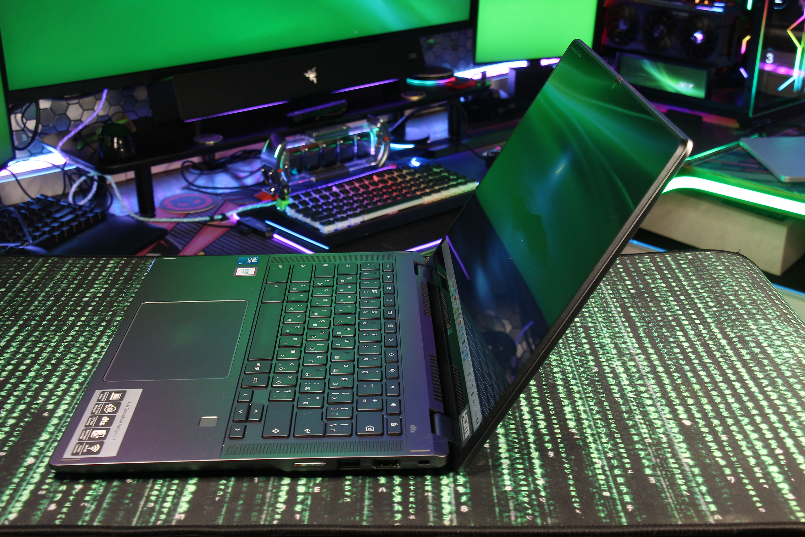 Экран Chromebook Spin 514 имеет разрешение 1920×1200 пикселей при соотношении сторон 16:10, что дает больше вертикального пространства по сравнению со стандартными 16:9 дисплеями. Это особенно ценно при работе с документами или веб-страницами. Сенсорный экран защищен стеклом Gorilla Glass с антимикробным покрытием, что актуально для устройства, которое часто будут касаться пальцами. Покрытие, соответственно, глянцевое.