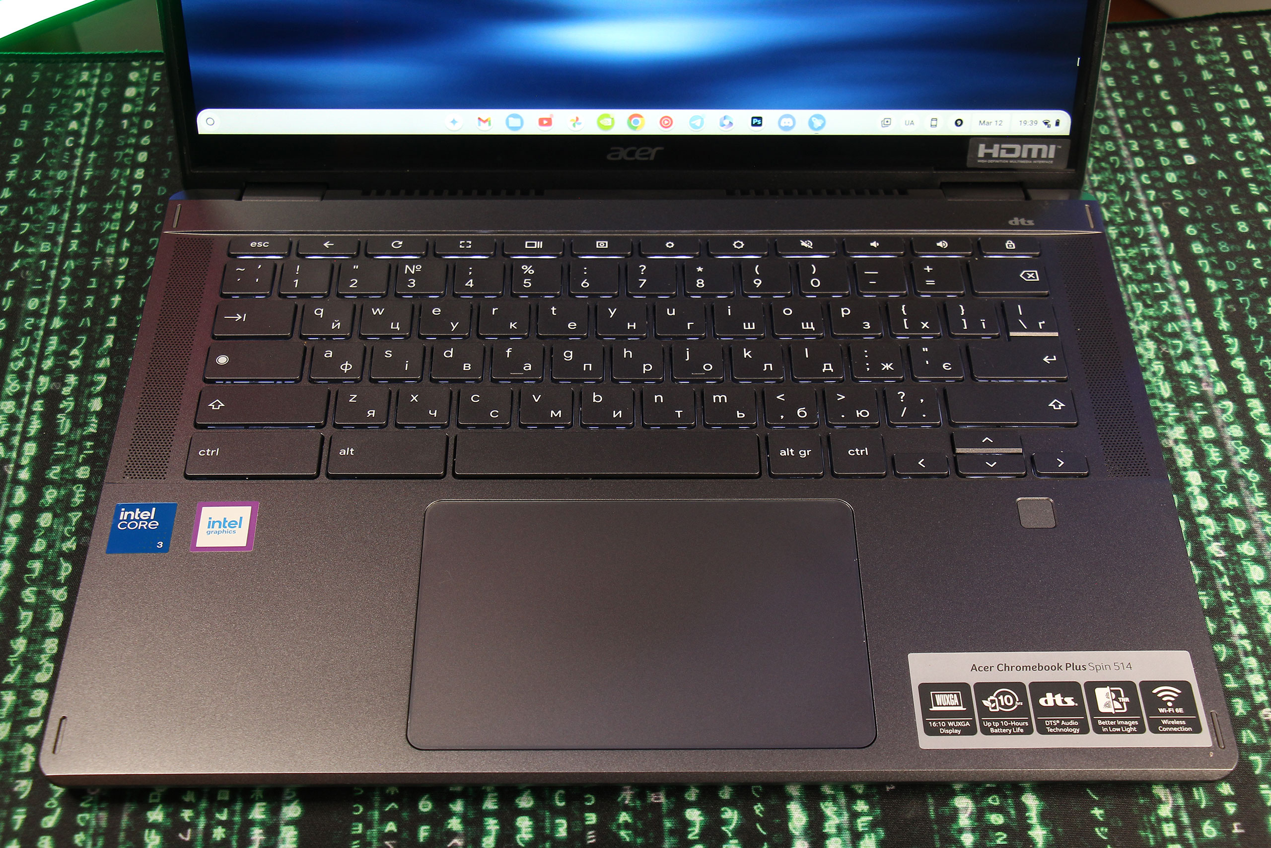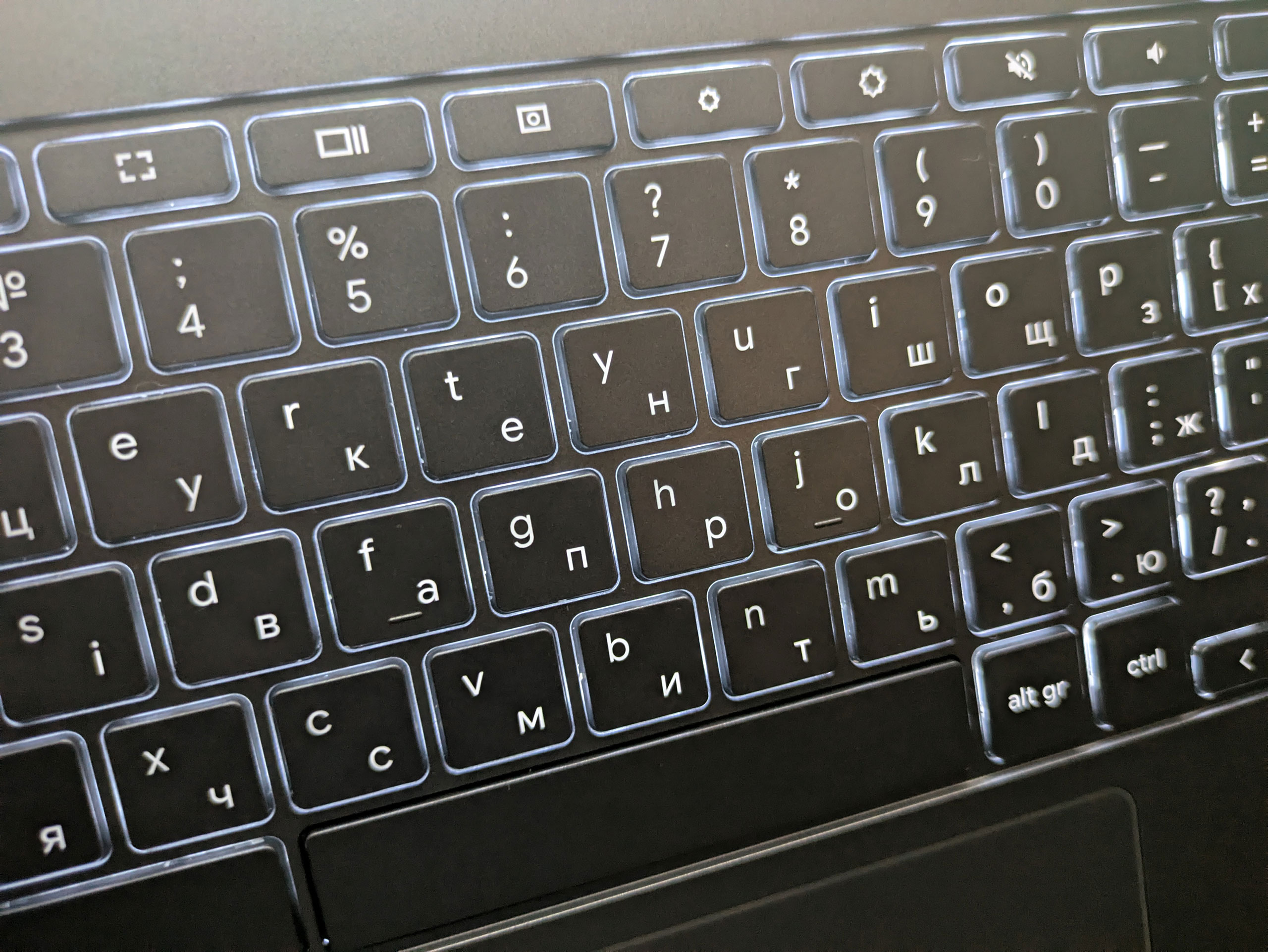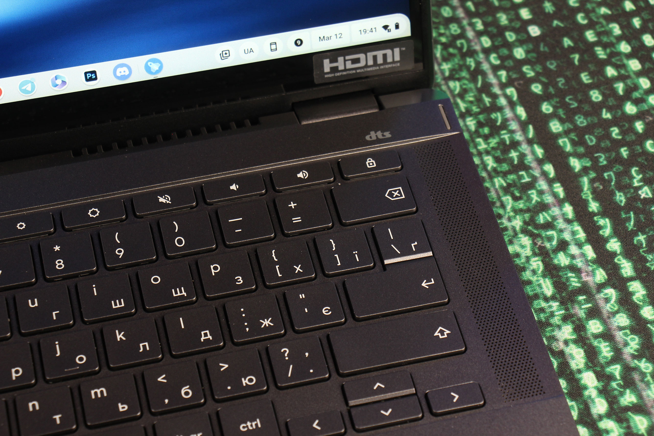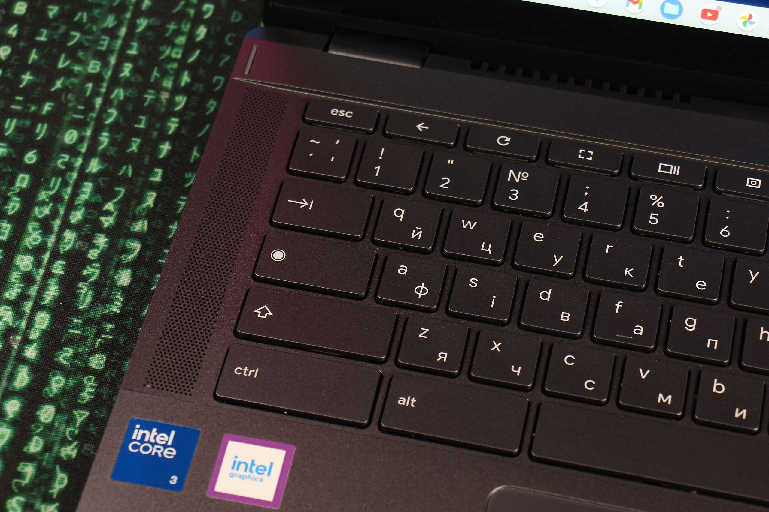 Клавиатура с белой подсветкой имеет пять уровней яркости. Легенды английского и украинского языков просвечиваются одинаково качественно и нанесены аккуратным шрифтом строчными буквами, как и остальные надписи. Клавиши островного типа, он же chiclet. Подсветка равномерная также вокруг каждой клавиши, не только самих букв. В целом раскладка типичная для хромбуков с их специфическими функциональными клавишами вместо F‑строки — по пиктограммам можно понять назначение каждой. Никаких дополнительных блоков, кроме стрелочек, нет. Ход клавиш средний, с приятным тактильным откликом. Тайпинг комфортный и не слишком громкий, что оценят пользователи, которые много печатают.