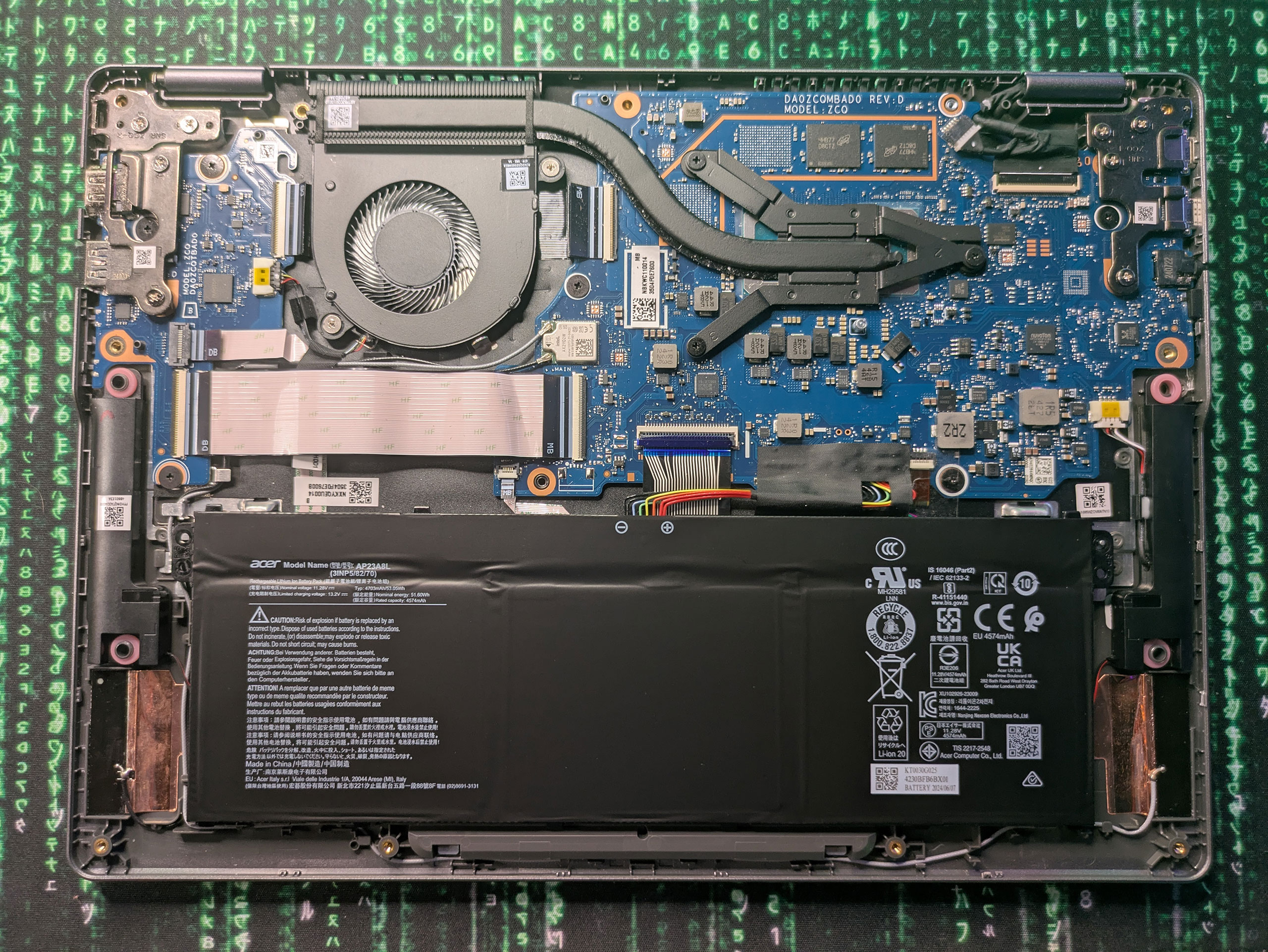 Система охлаждения в Spin 514 оптимизирована для обеспечения комфортной работы в любом режиме, включая планшетный. Воздух забирается через решетку снизу, а выходит через отверстия возле шарниров. В режиме планшета часть вентиляционных отверстий может быть перекрыта, но это не приводит к критическому перегреву. Система охлаждения состоит из одной тепловой трубки, радиатора и одного вентилятора. Такая конфигурация позволяет эффективно отводить тепло от процессора, сохраняя устройство прохладным даже во время интенсивного использования. В большинстве сценариев вентилятор остается выключенным, что обеспечивает бесшумную работу.