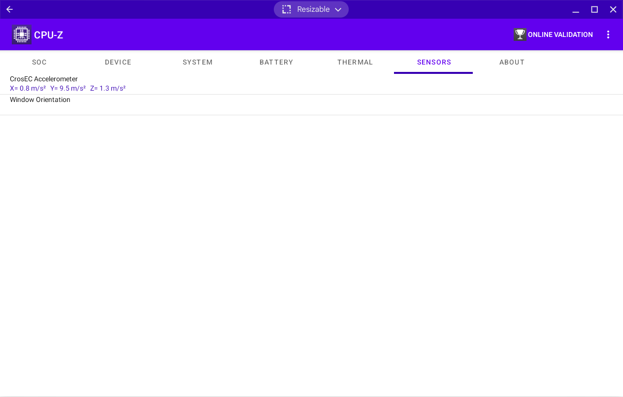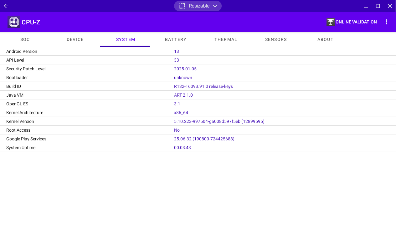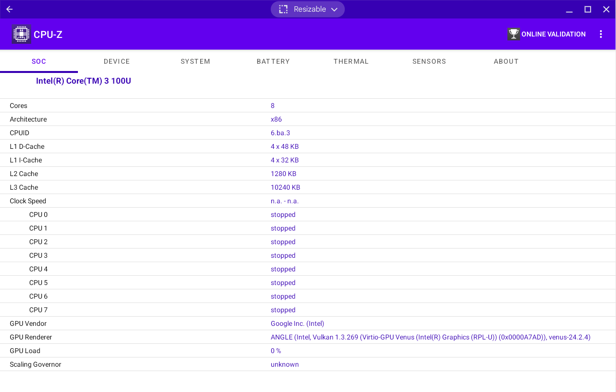 Поскольку привычный CPU‑Z не работает под ChromeOS, для диагностических целей пришлось использовать Android-версию приложения, а также встроенное средство операционной системы: