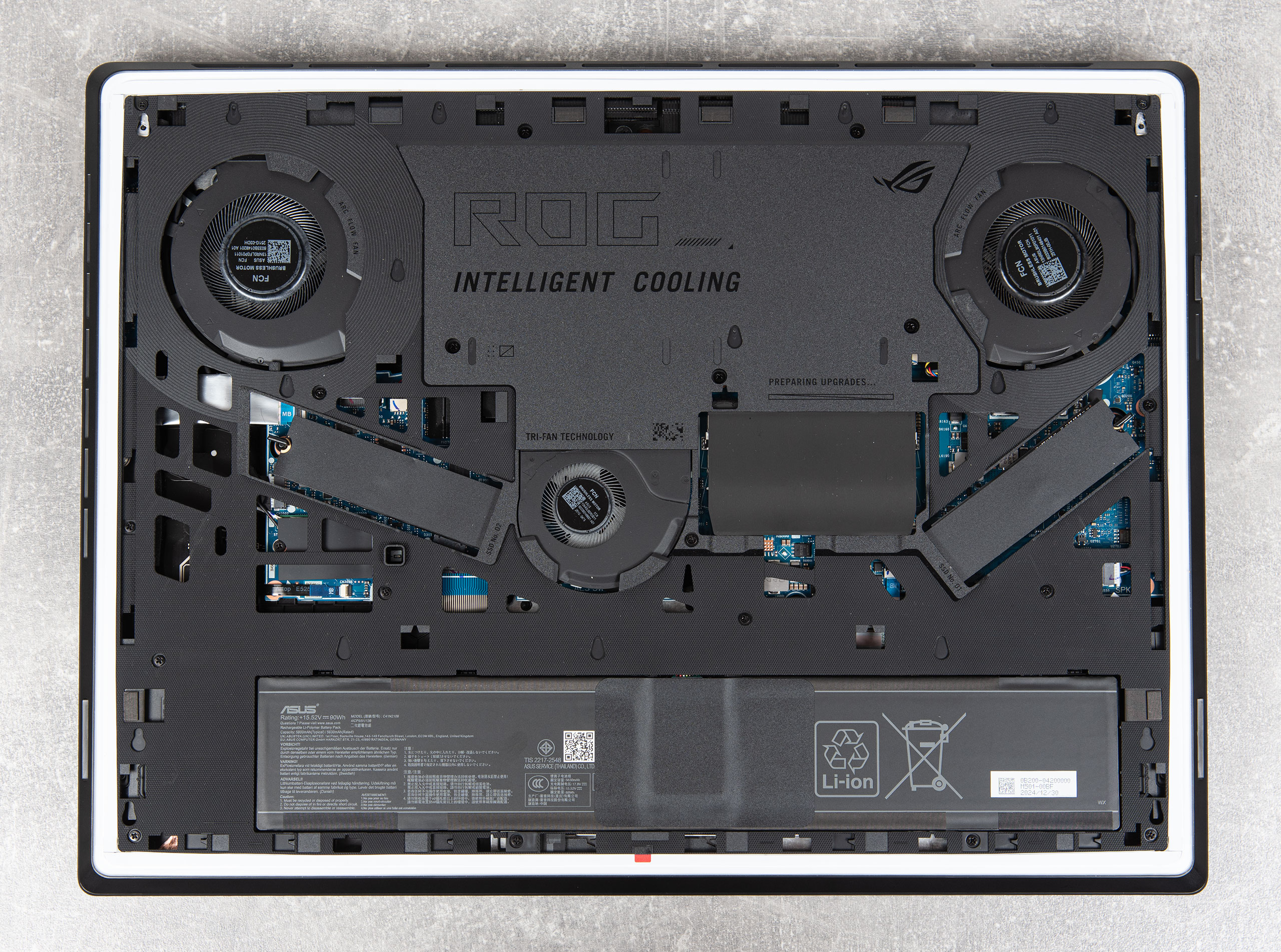 Но 18 дюймов и мощные компоненты имеют свою цену и ноутбук получился габаритным и тяжелым. И хотя в нем установлена соответствующая батарея, полный рабочий день без подзарядки аккумулятора он точно не протянет. Имеющийся 2.5Gb Ethernet так и намекает на стационарное использование, а брать лэптоп в дорогу лучше эпизодически. Кроме проводной сети новинка оснащена всеми современными портами и интерфейсами, включая Thunderbolt 5, Wi-Fi 7 и Bluetooth 5.4. Есть также 1080p веб-камера с поддержкой Windows Hello. Ну и наконец интересная идея со съемной крышкой, которая позволяет любому разобрать ноутбук, прочистить его от пыли, при этом не волноваться, что что-то может пойти не так.