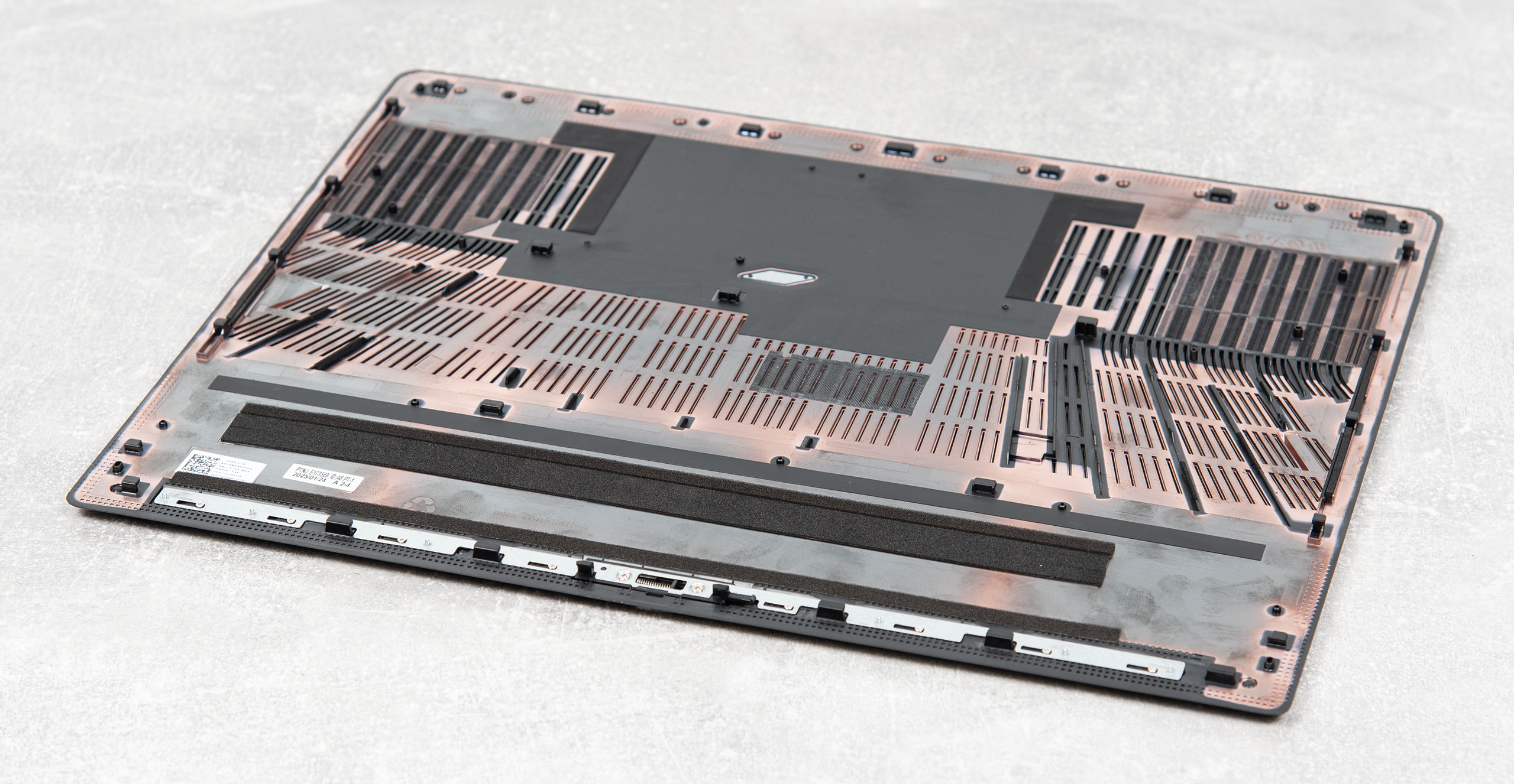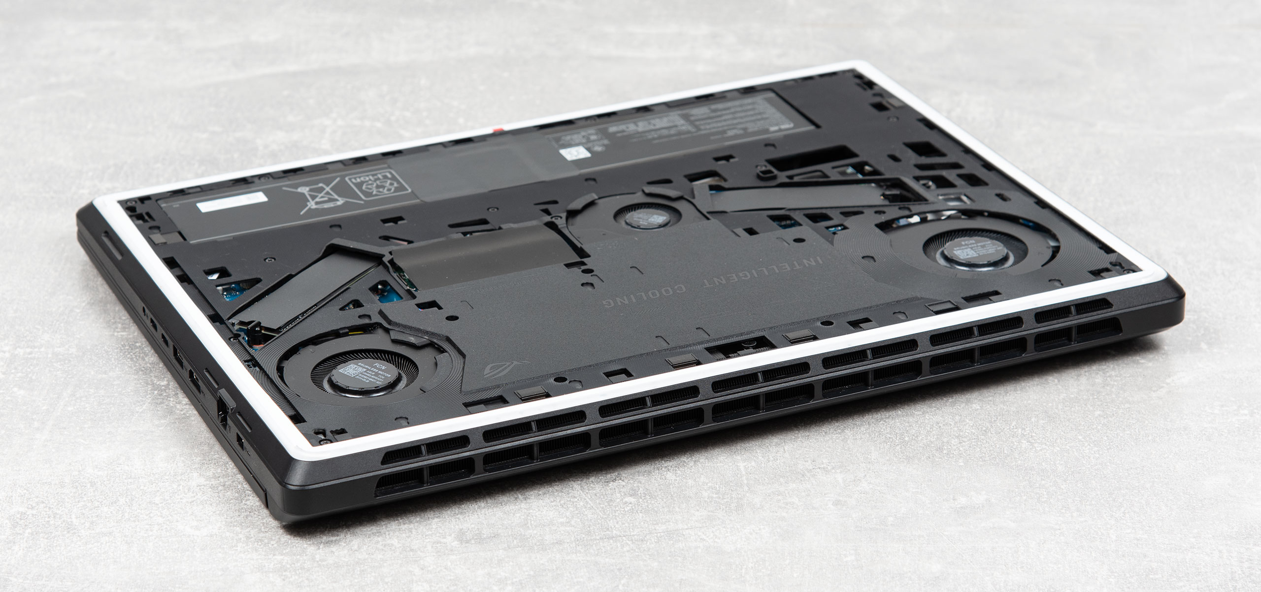 Нижняя крышка почти плоская, имеет решетку в виде продолговатых прорезей и надпись ROG STRIX. Резиновые ножки, которые немного приподнимают корпус над поверхностью, сплошные, лишь на переднем краю она разделена на две части. Также по бокам расположены прорези для динамиков.