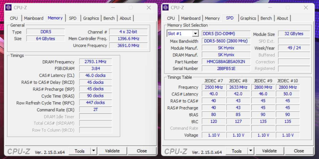 Память работает в двухканальном режиме и имеет общий объем в 64 Гбайт. Установлено два модуля HMC88AGBSA092N стандарта DDR5-5600 и производства SK Hynix.