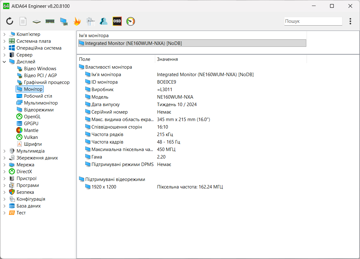 Матрица типа IPS обеспечивает широкие углы обзора без искажения цветов. Частота обновления 165 Гц при разрешении 1920×1200 пикселей является оптимальной для возможностей GeForce RTX 5050: в киберспортивных дисциплинах GPU легко заполняет этот лимит, а в AAA-проектах запас частоты позволяет Frame Generation работать эффективно. Время отклика 3 мс минимизирует шлейфы за быстрыми объектами, а поддержка NVIDIA G‑Sync (о чем сообщает наклейка справа внизу от экрана) устраняет разрывы изображения.