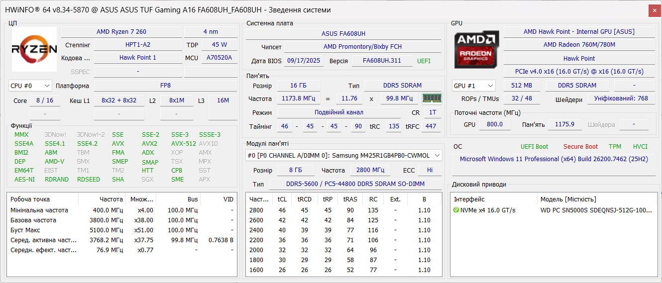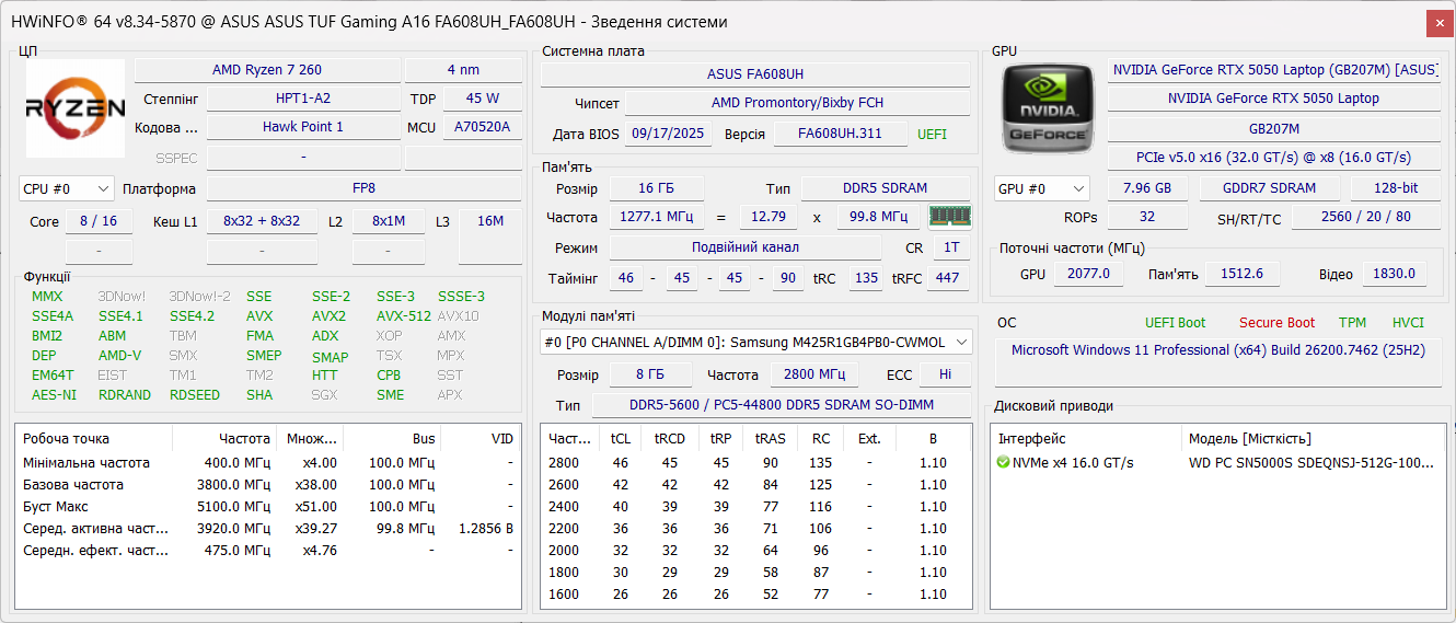 Диагностические программы отображают протестированную конфигурацию ASUS TUF Gaming A16 (2025) следующим образом: