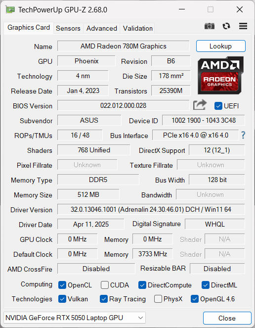 Также присутствует встроенная графика Radeon 780M и, к счастью, нужна она только для оптимизации энергопотребления в 2D-режиме, ведь графический адаптер NVIDIA GeForce RTX 5050 на архитектуре Blackwell (кристалл GB207) является главной особенностью конфигурации.