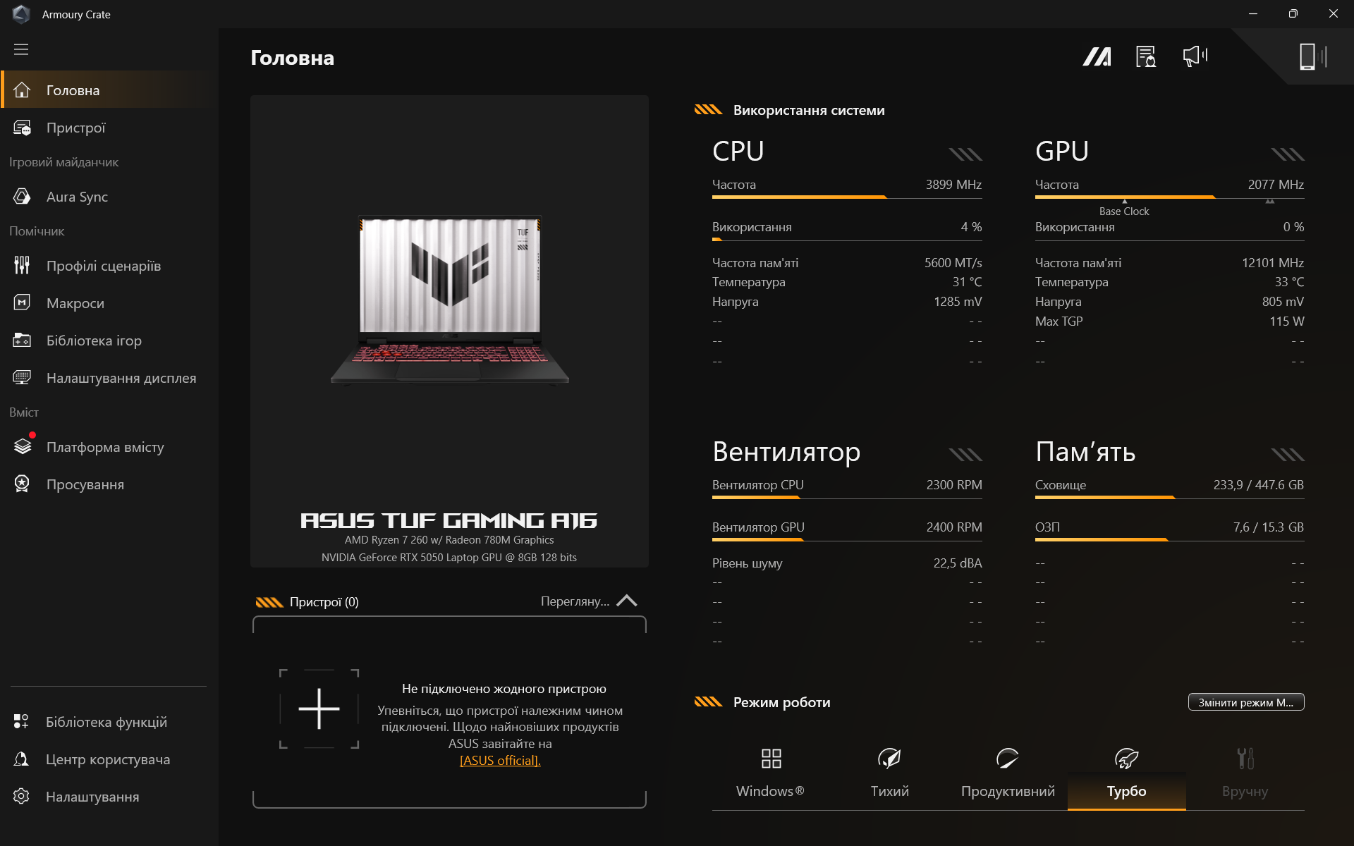 Armoury Crate предлагает три режима работы: «Тихий» для минимального шума с пассивным охлаждением при легких задачах, «Производительный» как баланс между быстродействием и комфортом, и «Турбо» для максимальной производительности. При работе от батареи турборежим недоступен, а два других демонстрируют несколько иное быстродействие, чем от сети. Такое поведение является типичным для современных ноутбуков кроме наиболее энергосберегающих конфигураций и ASUS TUF Gaming A16 (2025) по сравнению со многими другими еще очень консервативен в снижении параметров — результаты падают не так критично.