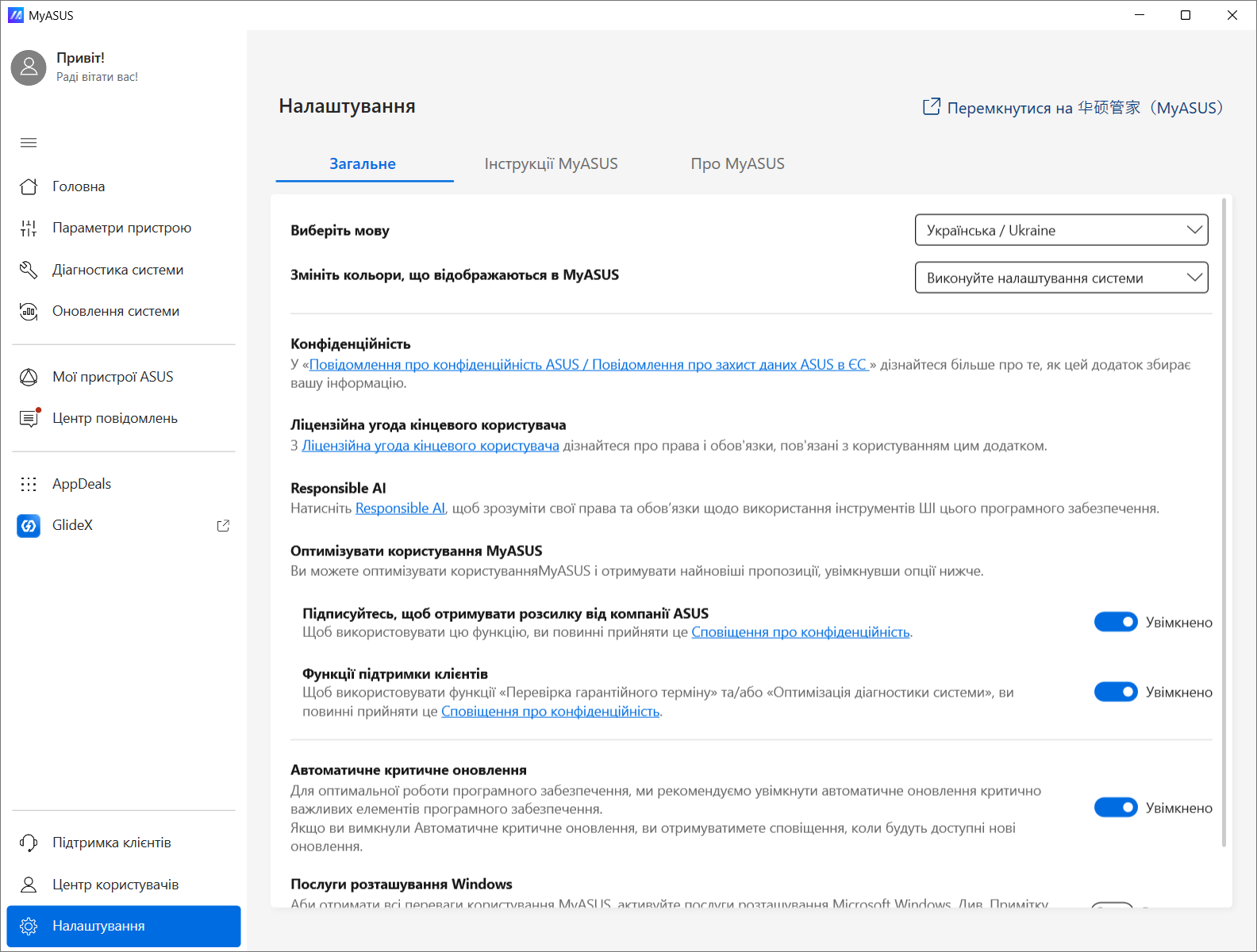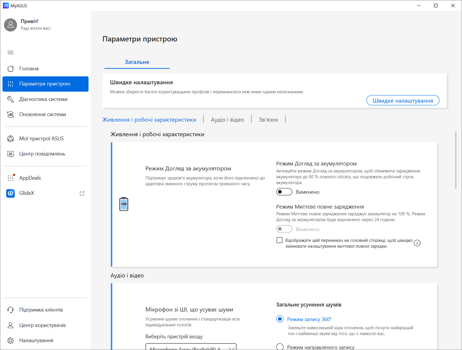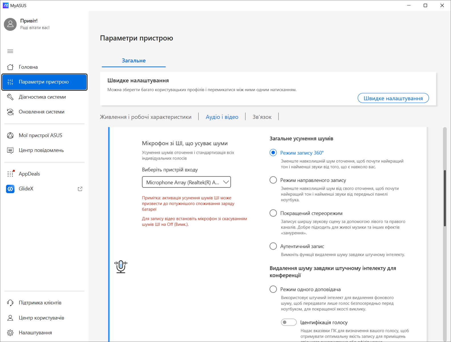 Некоторые возможности ноутбука также настраиваются через более распространенное приложение MyASUS — например, шумоподавление. Интересно, что в MyASUS есть ссылка на открытие Armoury Crate, но не наоборот, хотя обе утилиты выполняют разные функции и не пересекаются.