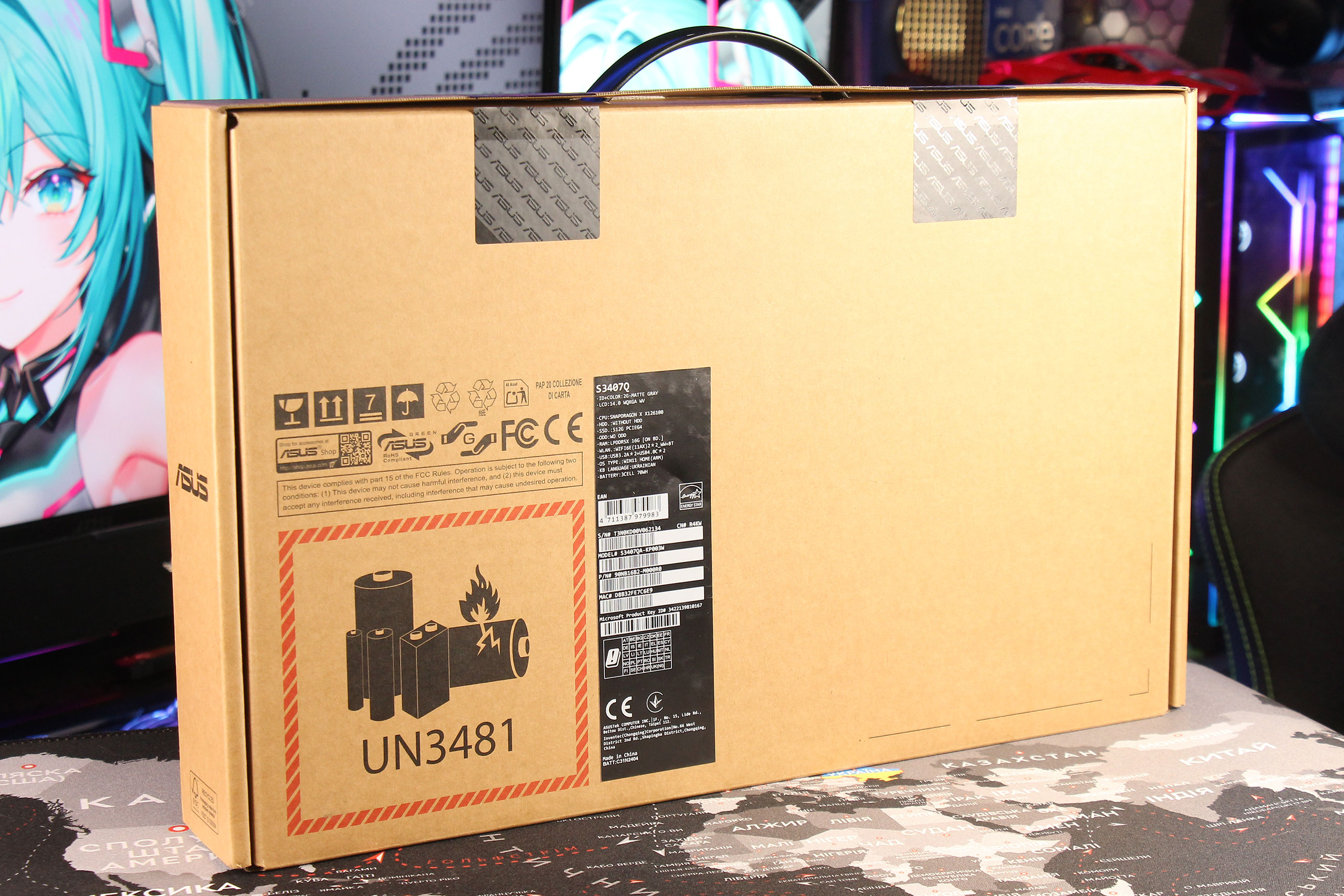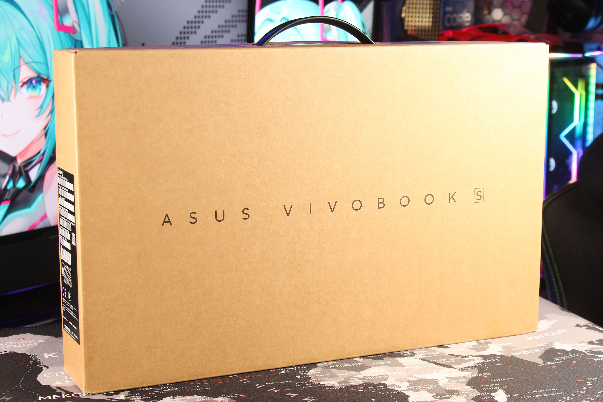 Ноутбук поставляется в стандартной картонной упаковке, характерной для линейки Vivobook. В отличие от премиальной серии Zenbook, здесь отсутствуют дополнительные декоративные элементы вроде внутренней «гламурной» коробки и это вполне соответствует более доступному позиционированию продукта.