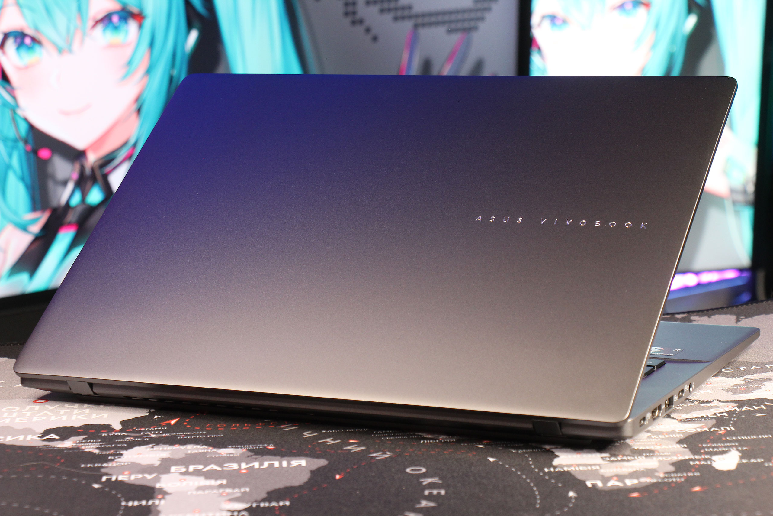Дизайн ASUS Vivobook S14 балансирует между современной эстетикой и практичностью. С учетом класса — вполне удачно. Корпус выполнен в металлическом дизайне с алюминиевыми панелями на крышке и нижней части, дополненный пластиковыми элементами для снижения веса и стоимости.