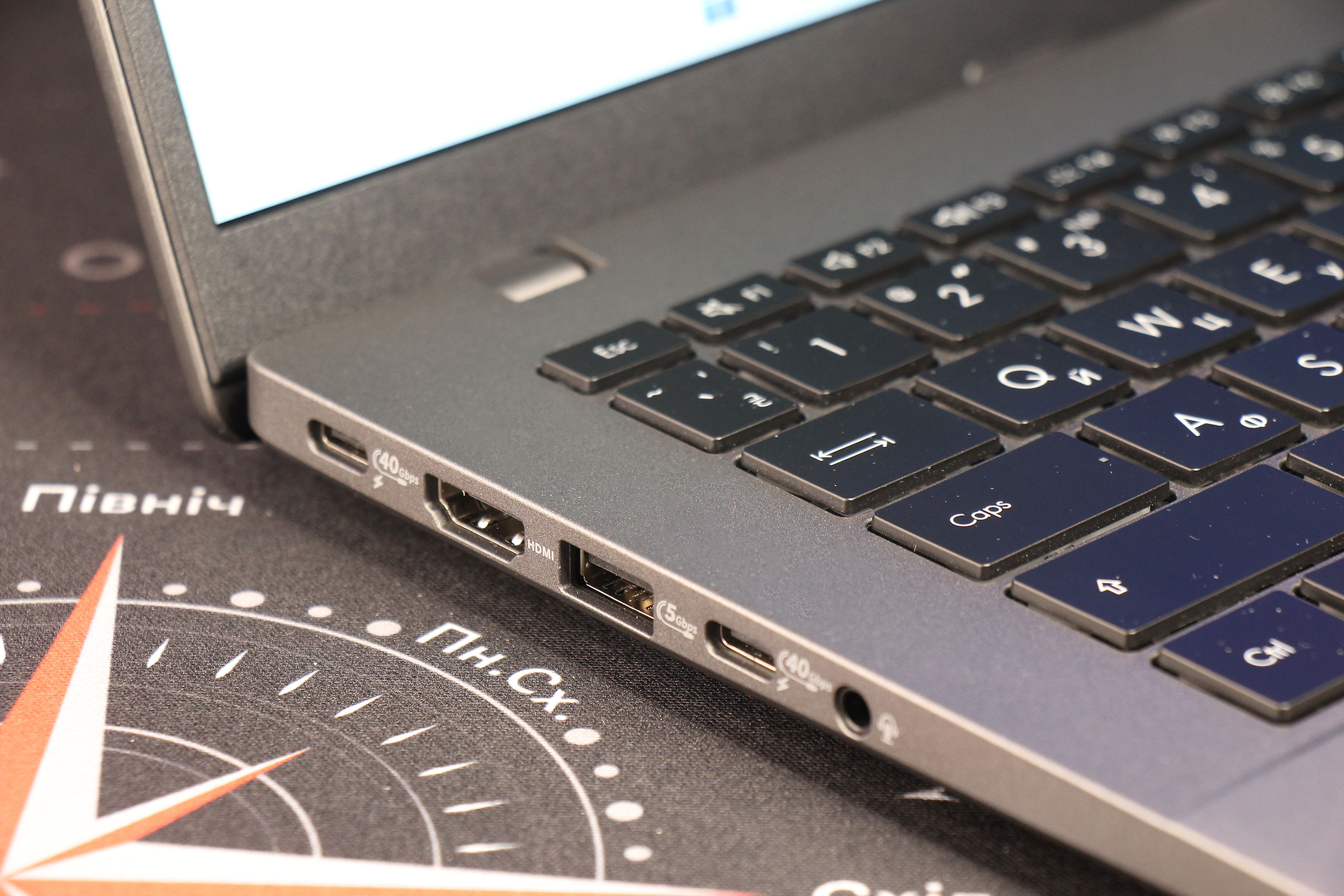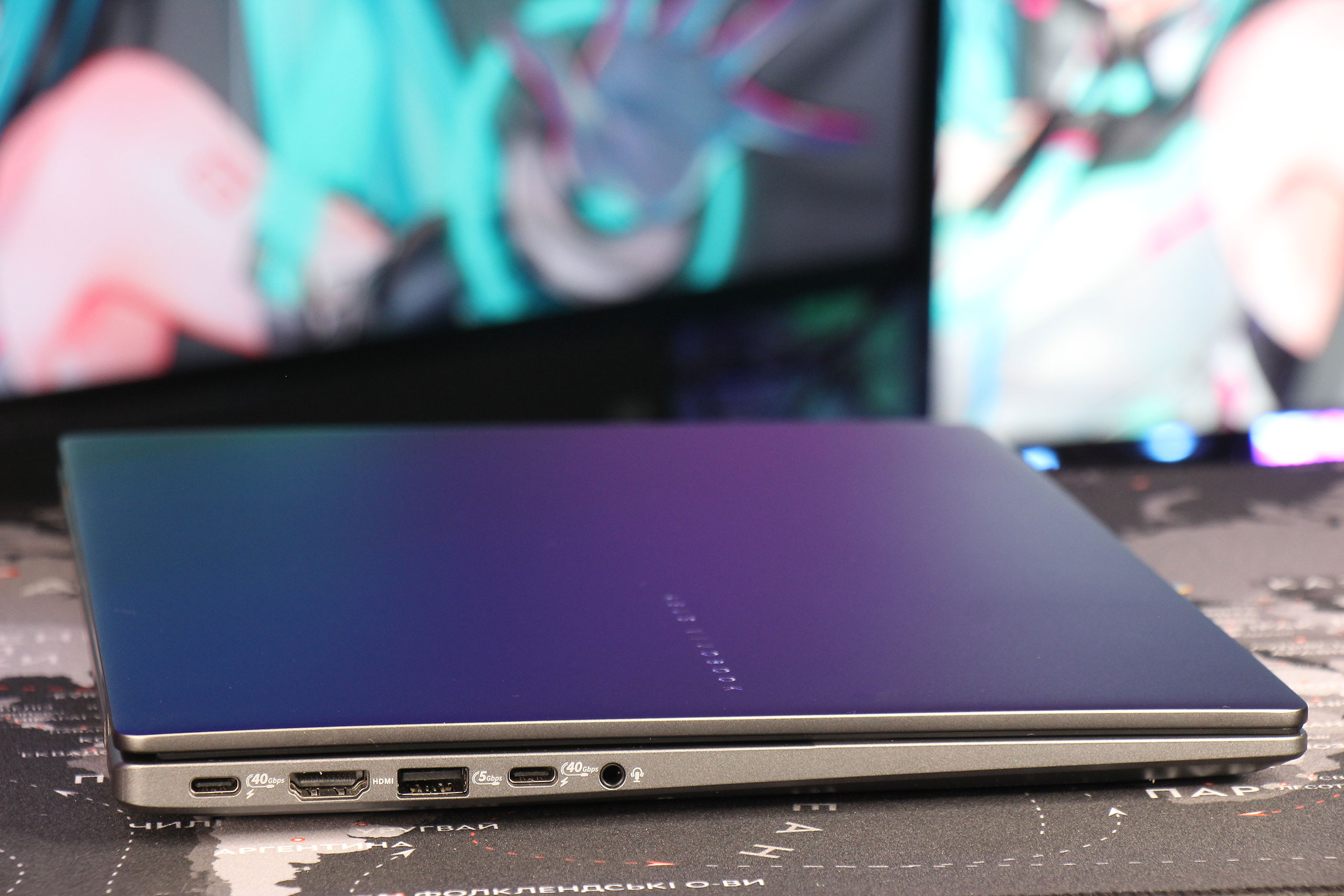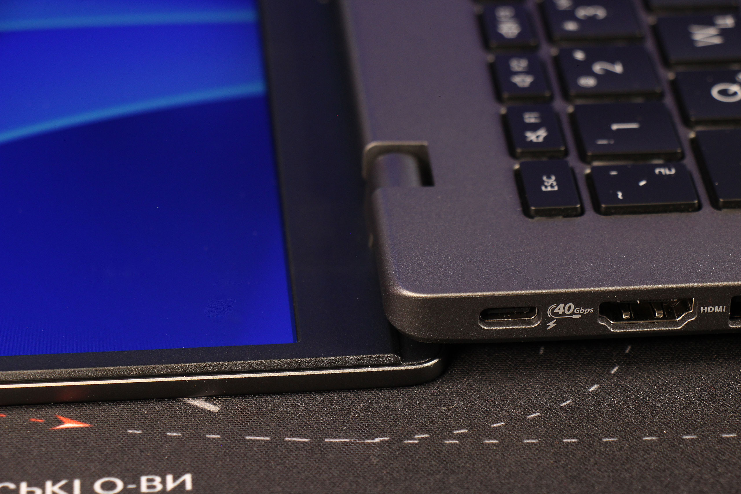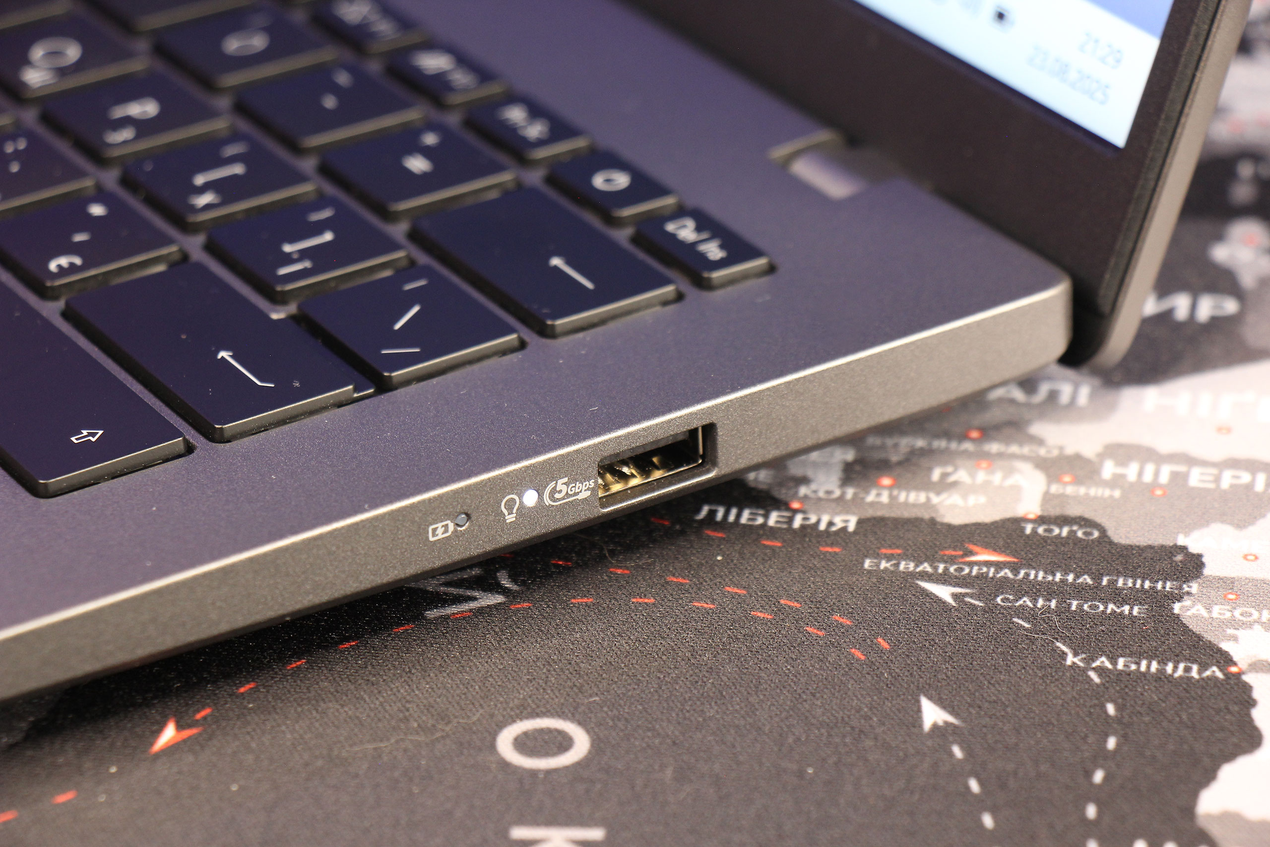Слева размещены два порта USB4 Type‑C с поддержкой 40 Гбит/с и Power Delivery, что позволяет заряжать ноутбук через любой из них. Там же находится полноразмерный HDMI 2.1, комбинированный аудио-разъем и один USB 3.2 Gen1 Type‑A. Справа расположен еще один USB 3.2 Gen1 Type‑A (удобно для подключения мыши).