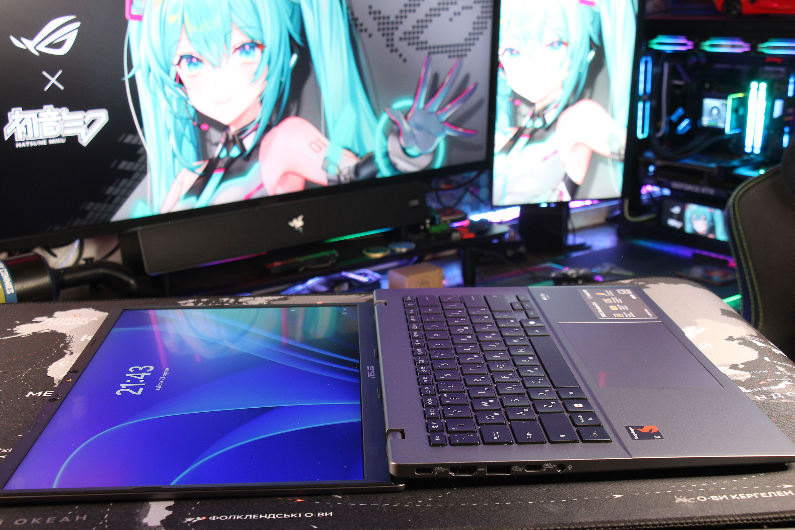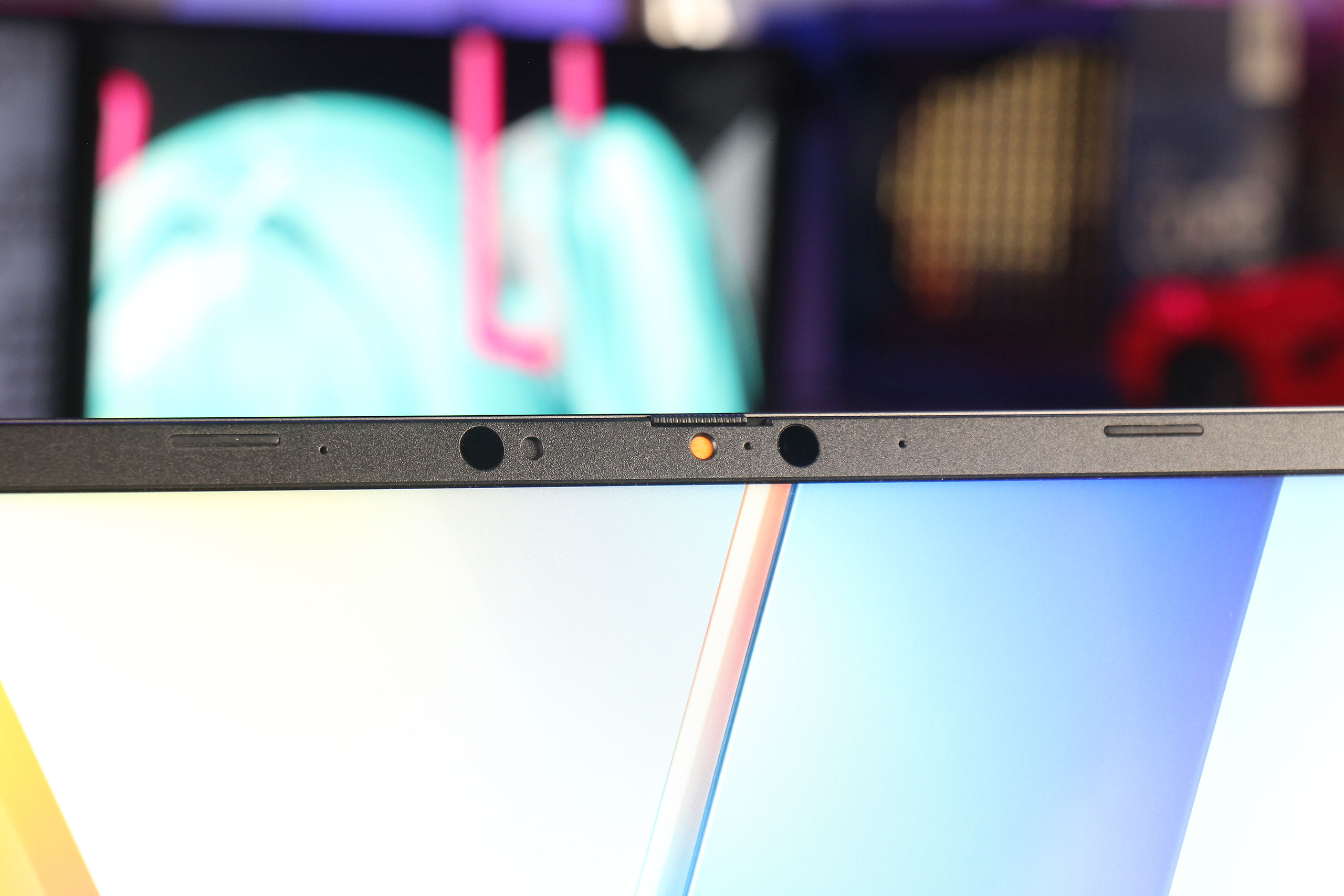 Над экраном размещена веб-камера с ИК-сенсором для Windows Hello и массив микрофонов. Что интересно — механическая шторка с магнитом прикрывает оба объектива. ASUS также уделяет довольно много внимания в маркетинге ИИ-функциям, связанным с веб-камерой.