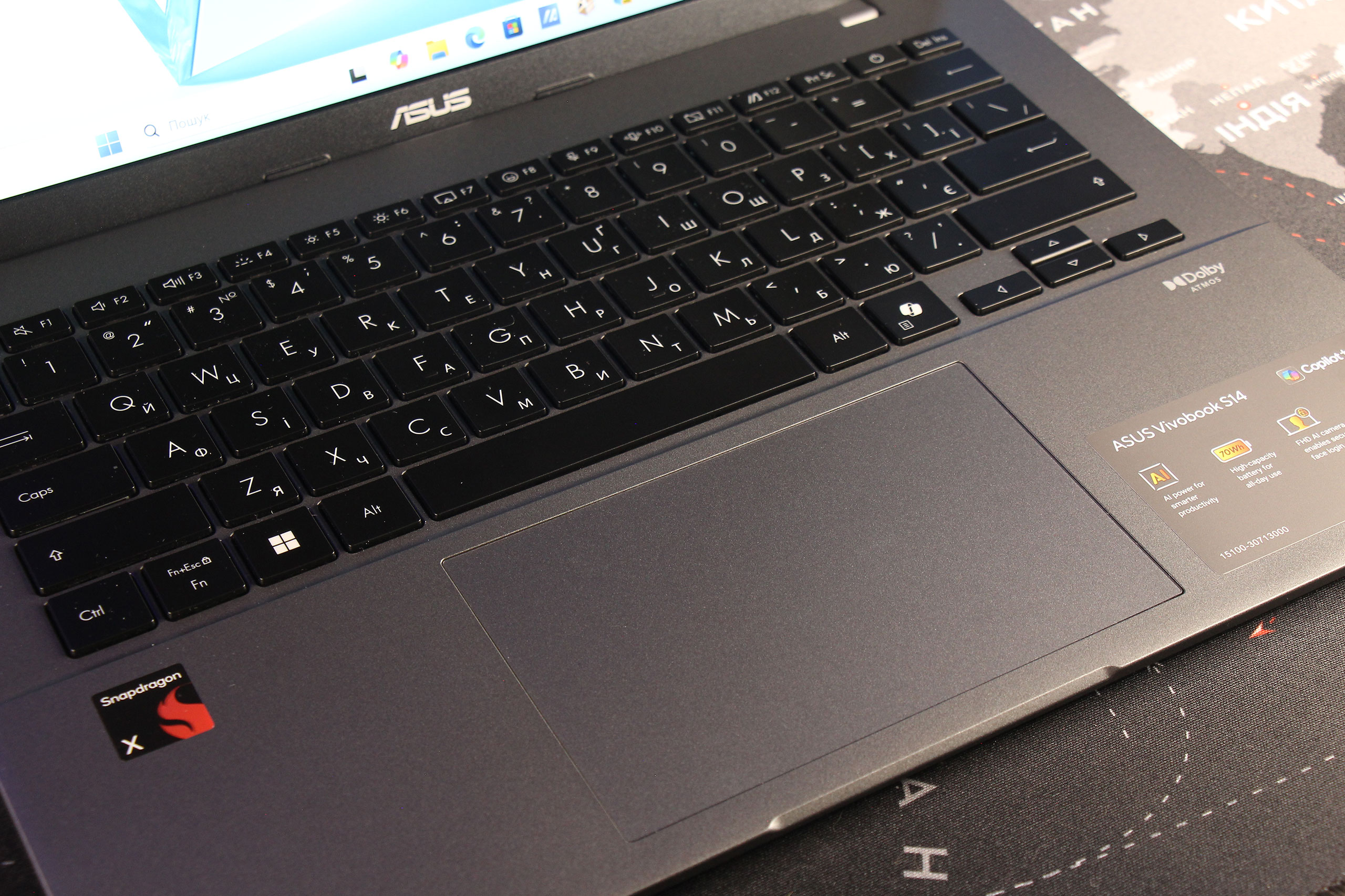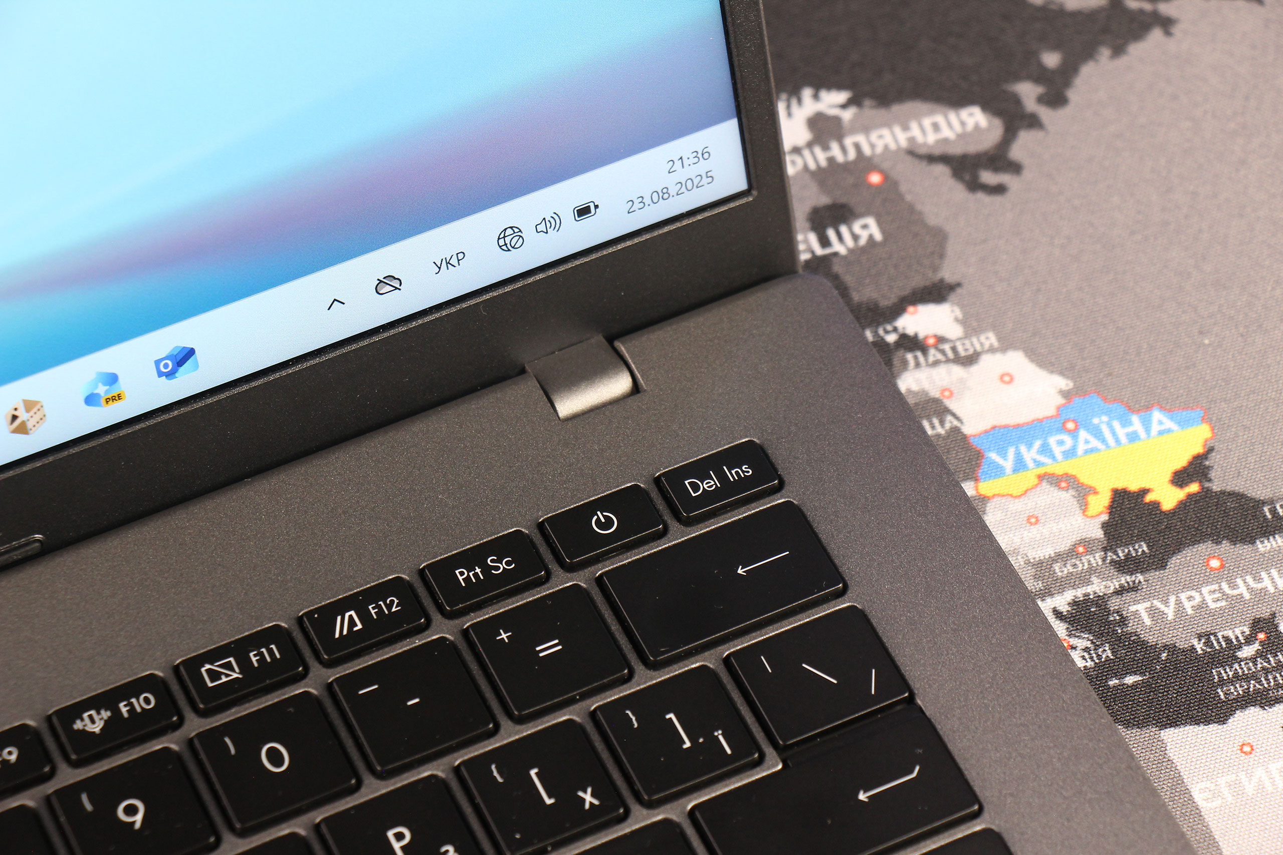 Большой тачпад поддерживает все жесты Windows 11 и обеспечивает точное позиционирование курсора. Поверхность гладкая с хорошим скольжением, щелчок четкий с умеренным ходом. Размеры тачпада оптимальны для 14-дюймового формата, оставляя достаточно места для ладоней во время набора текста. А еще его пропорции 16:10 соответствуют дисплею.
