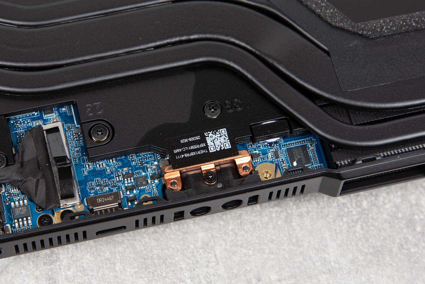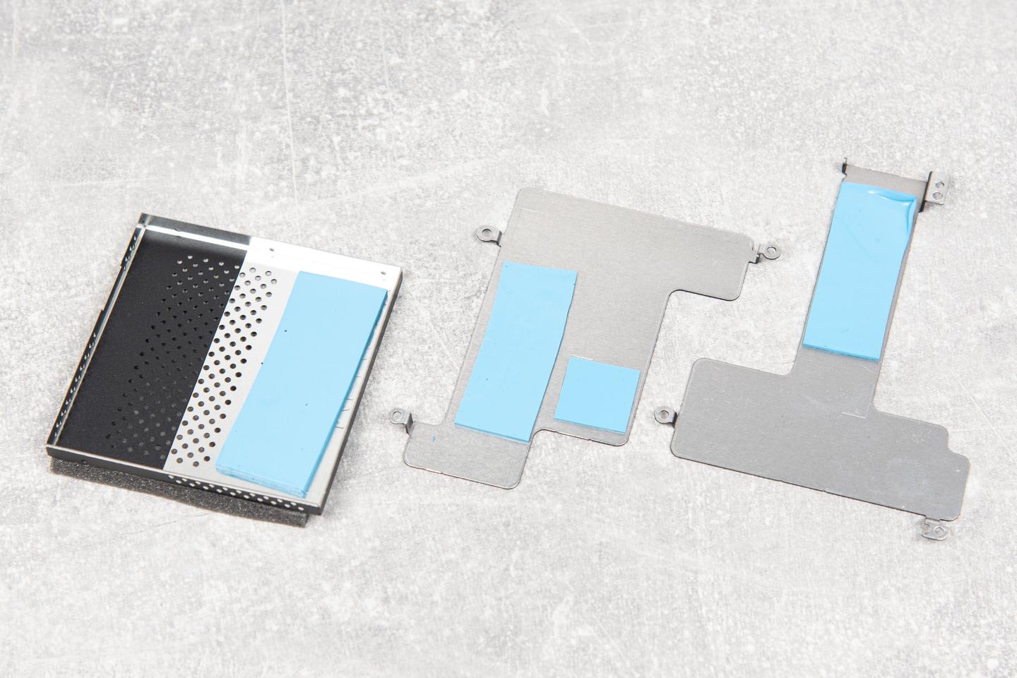Как уже отмечалось выше, накопители и память накрыты защитными крышками, которые также служат радиаторами для охлаждения. На пластинах имеются соответствующие термопрокладки, которые улучшают передачу тепла от компонентов.