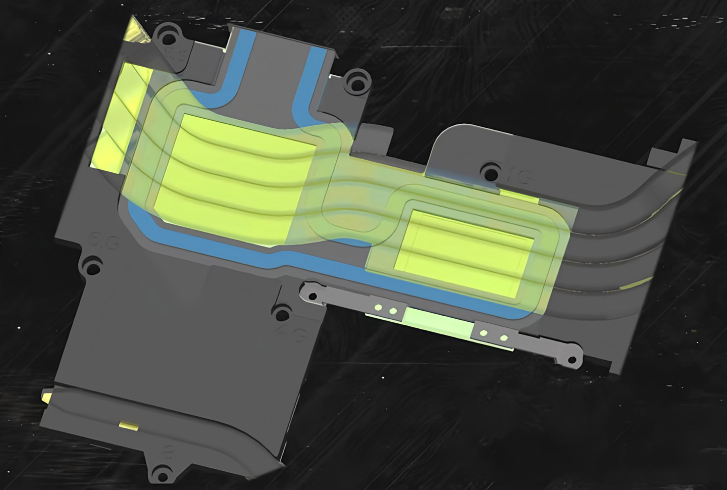 В отличие от RX4090-17UA28 здесь канал для жидкости выполнен не обычной трубкой, которая проходила поверх теплосъемников, а полностью фрезерован внутри пластины, накрывающей процессор и графический чип. Такая конструкция должна обеспечить лучшую передачу тепла от горячих компонентов наружу. Воздушное охлаждение никуда не делось, но его улучшили, одну тепловую трубку сделали толще и добавили еще один вентилятор для охлаждения горячей зоны графической части платы. Кроме того, Dream Machines изменила темоинтерфейс и вместо жидкого металла теперь используется Honeywell PTM7958.