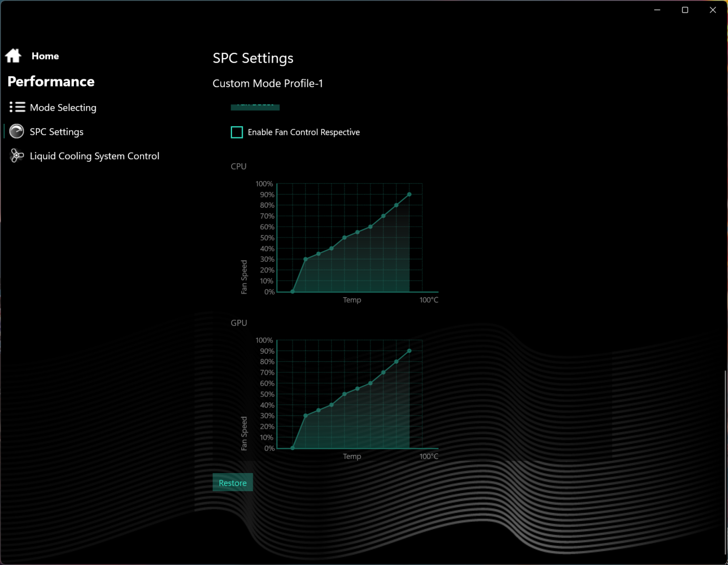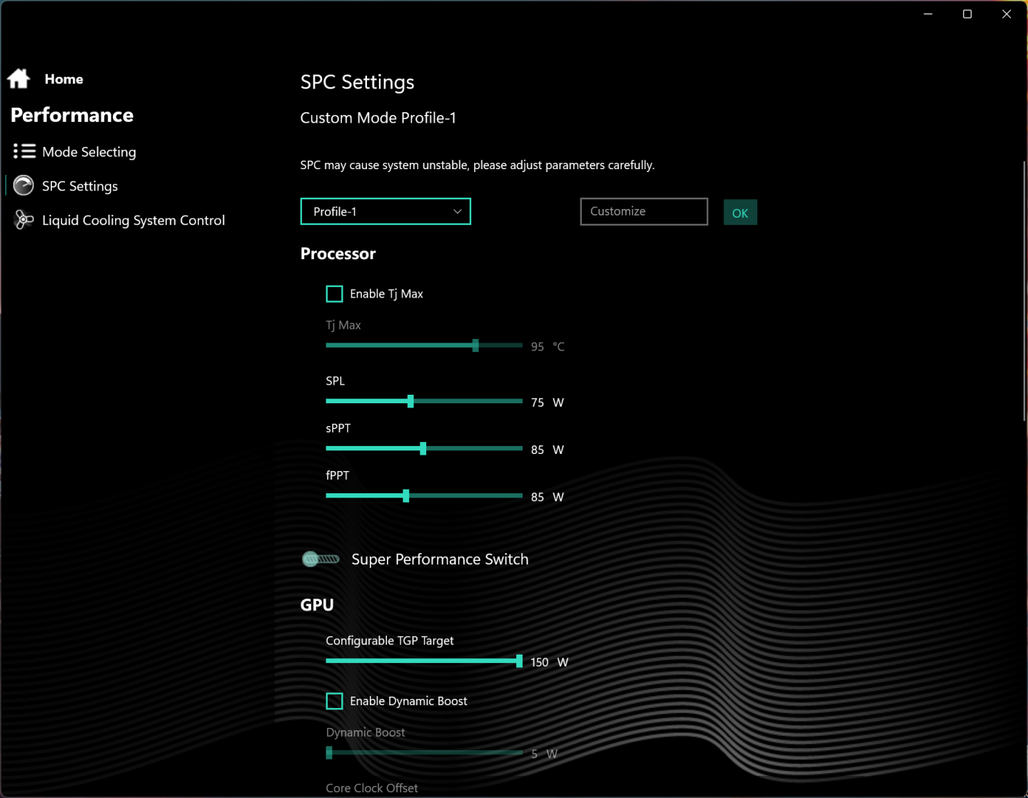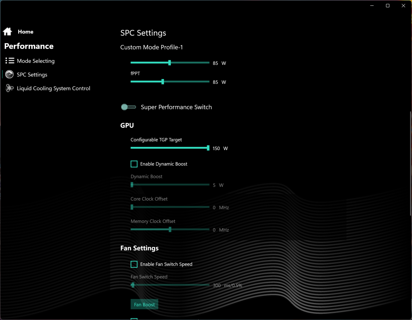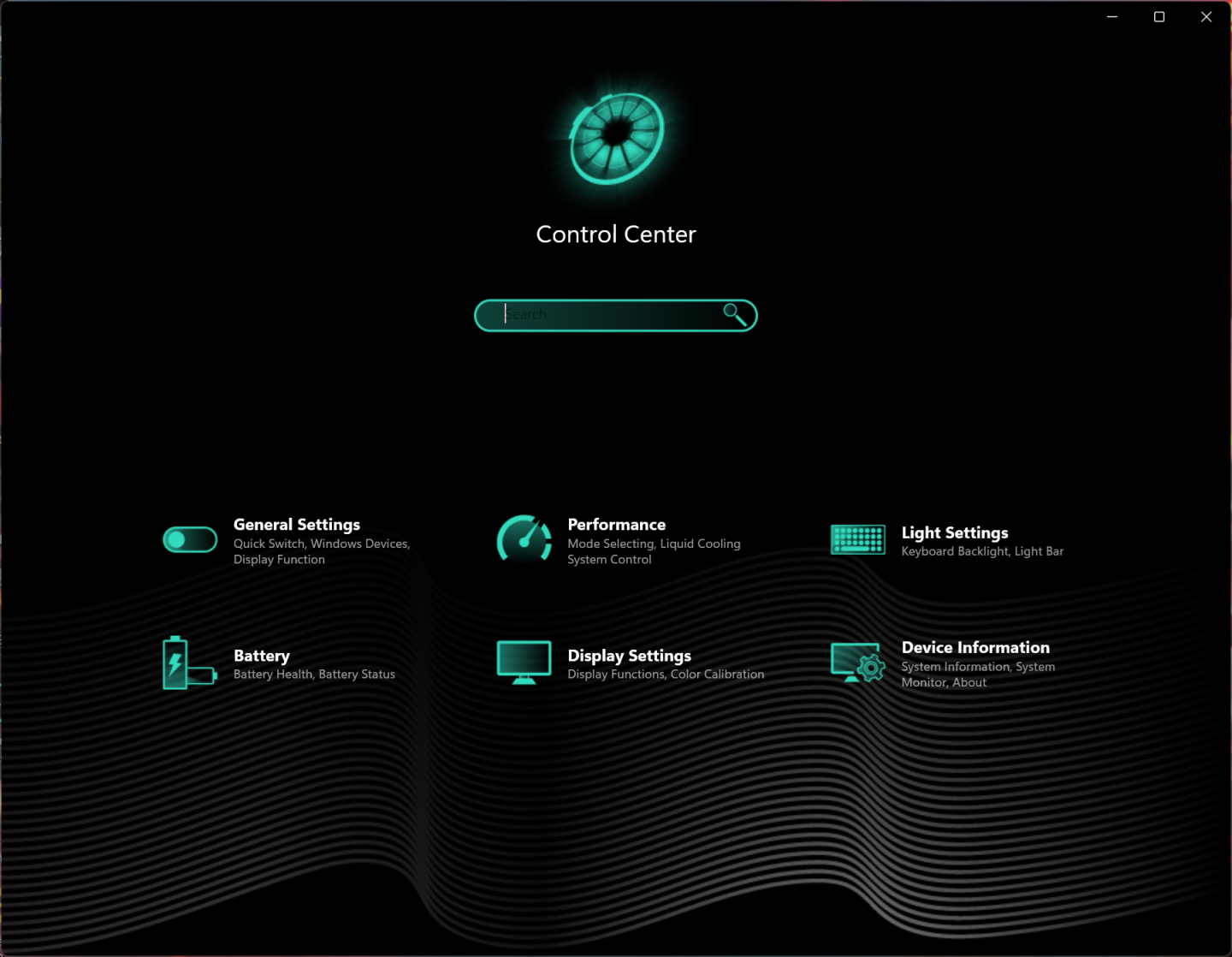С ноутбуком поставляется программа Control Center, с помощью которой можно осуществить настройку и контроль за лэптопом. Имеется управление клавиатурой и коммуникационными интерфейсами, можно выбрать режим работы графической системы и ноутбука в целом. Присутствует возможность разгона, а также доступны параметры функционирования системы жидкостного охлаждения. В ней можно настроить подсветку клавиатуры, корпуса и внешнего блока жидкостного охлаждения. Есть раздел с режимами работы экрана и настройкой его параметров. Также можно настроить батарею, получить информацию по установленным компонентам и провести их мониторинг.