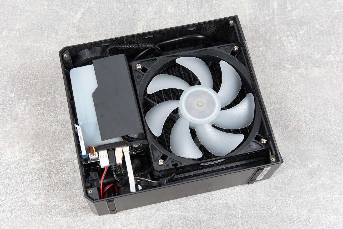 А вот внутреннее строение внешнего блока нисколько не изменилось. Имеем радиатор со 120-мм вентилятором, помпу, датчик протока и плату управления. При необходимости вентилятор можно заменить на любой другой с ШИМ-управлением и адресной подсветкой.