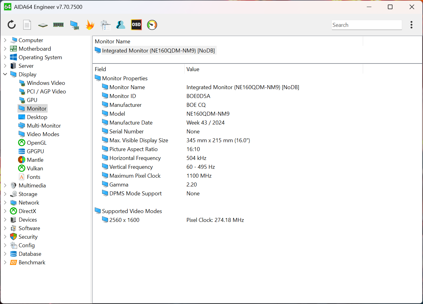 Установлена панель NE160QDM-NM9 производства BOE. Разработчик заявляет о 100% покрытии цветового пространства DCI-P3, отображении 1,07 млрд цветов и яркости на уровне 1250 кд/м² при контрастности 1200:1.