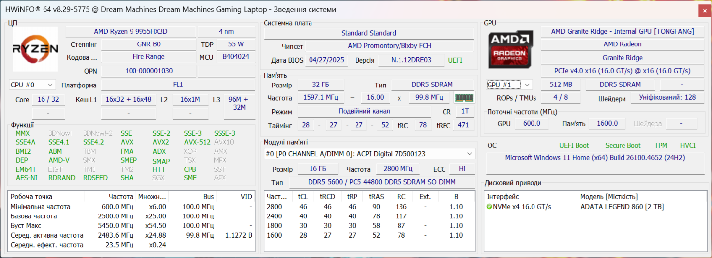 Установлена память стандарта DDR5-5600 в количестве двух модулей производства ACPI (Patriot) на чипах SK Hynix. При заказе на сайте Dream Machines их можно заменить на другие модели, включая объем (до 96 Гбайт суммарно).