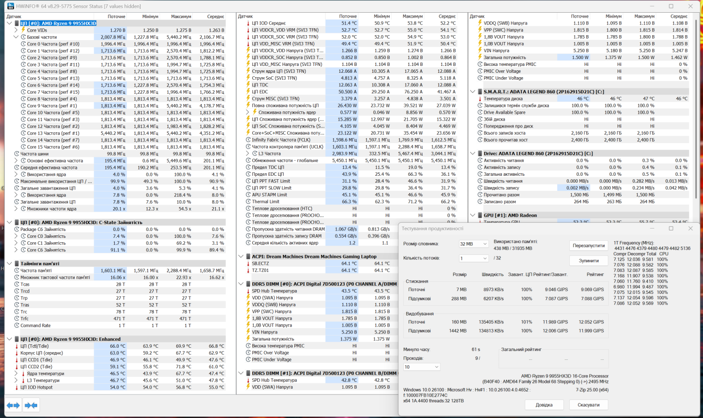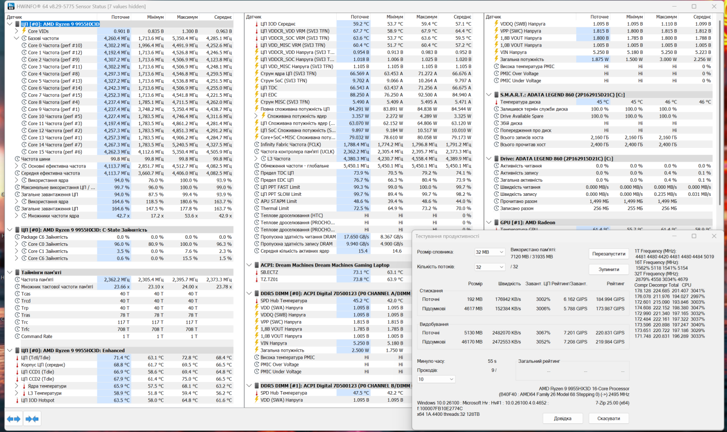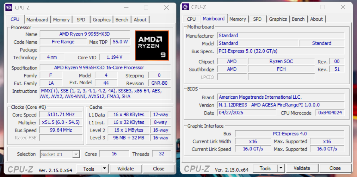 Устройство базируется на новейшем 16-ядерном процессоре AMD Ryzen 9 9 9955HX3D, способном обрабатывать 32 потока одновременно. Он выполнен по технологии 3D V‑Cache, то есть имеет дополнительную кэш-память третьего уровня с общим объемом в 128 МБ, что должно хорошо повлиять на игровое быстродействие. Конструктивно он аналогичен настольным чиплетным Ryzen и состоит из двух кристаллов CCD (4 нм) и одного IOD (6 нм). Базовая частота процессора лишь 2500 МГц, но благодаря технологии Precision Boost 2 он может ускоряться до 5400 МГц с максимальным TDP в 75 Вт.