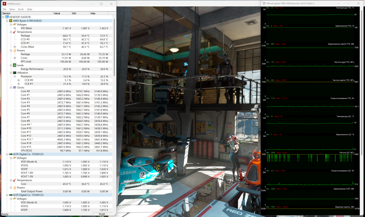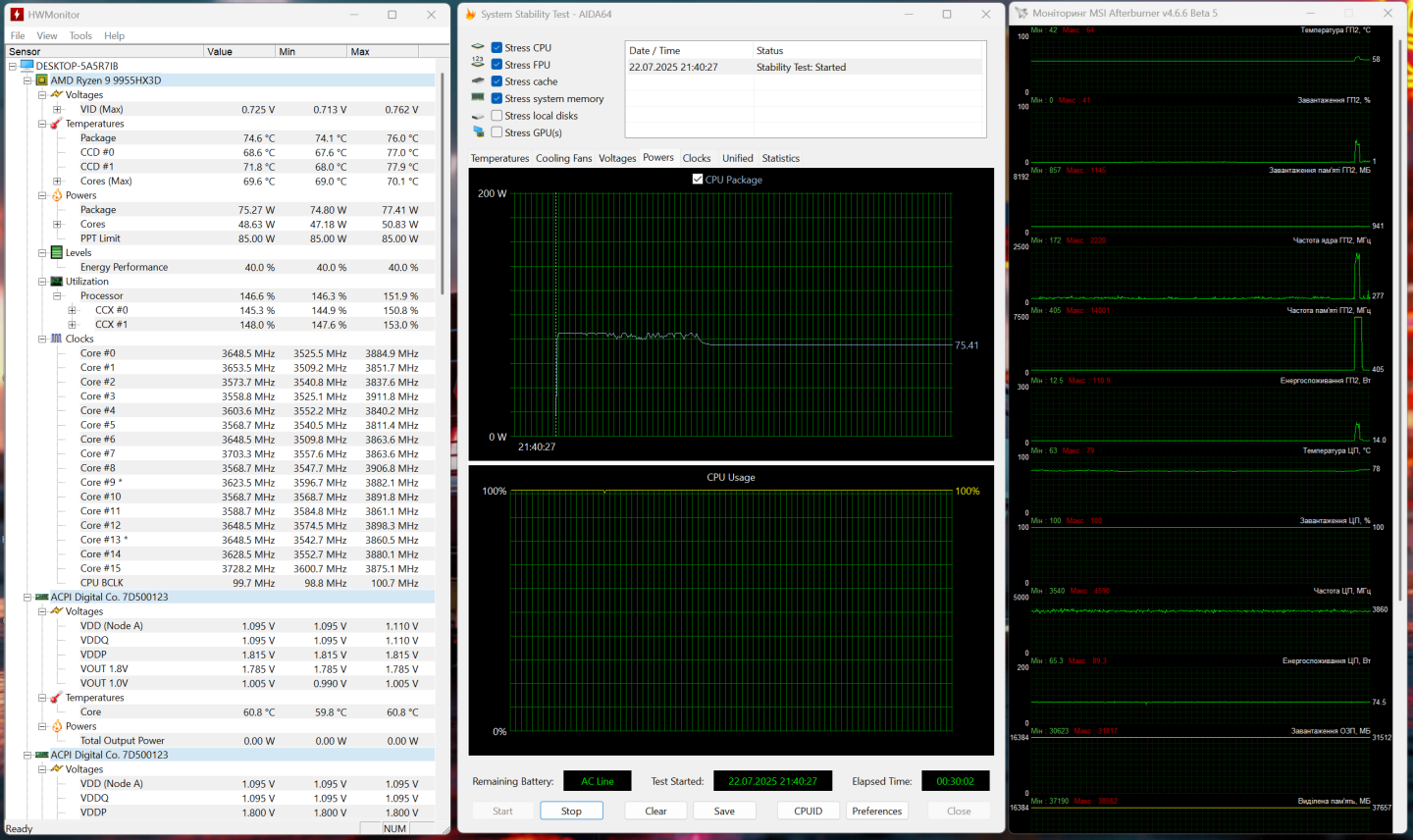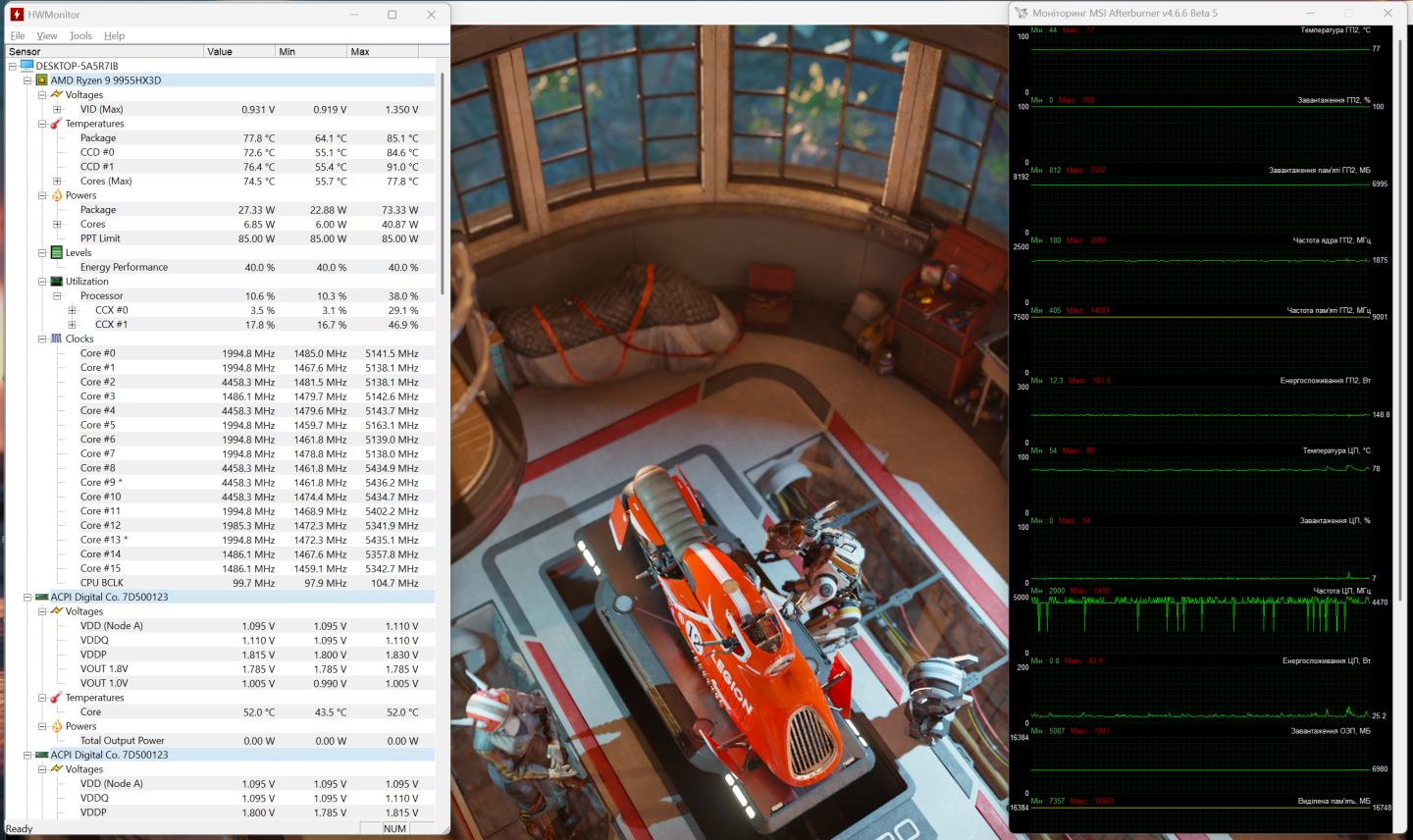Устройство базируется на новейшем 16-ядерном процессоре AMD Ryzen 9 9 9955HX3D, способном обрабатывать 32 потока одновременно. Он выполнен по технологии 3D V‑Cache, то есть имеет дополнительную кэш-память третьего уровня с общим объемом в 128 МБ, что должно хорошо повлиять на игровое быстродействие. Конструктивно он аналогичен настольным чиплетным Ryzen и состоит из двух кристаллов CCD (4 нм) и одного IOD (6 нм). Базовая частота процессора лишь 2500 МГц, но благодаря технологии Precision Boost 2 он может ускоряться до 5400 МГц с максимальным TDP в 75 Вт.