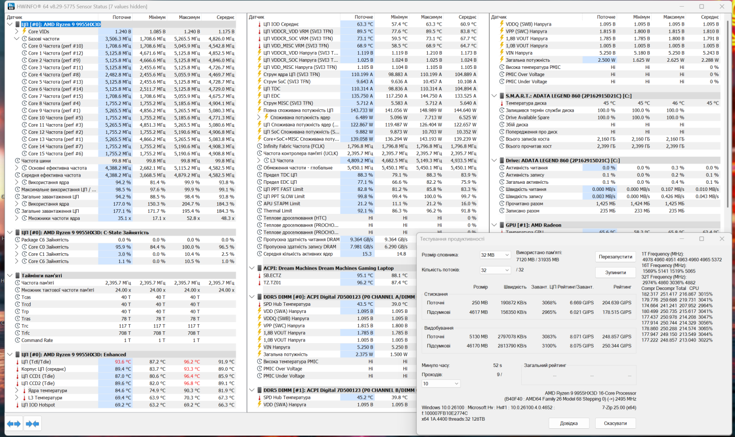 В реальности при однопоточной нагрузке его частота увеличивалась до 5450 МГц, а при задействовании всех потоков — до 5350 МГц или менее, если выбрать более производительный режим работы ноутбука, когда лимит TDP увеличивается и процессор работает на полную.