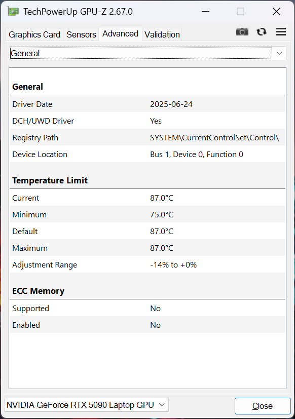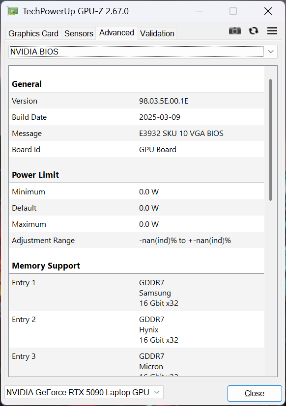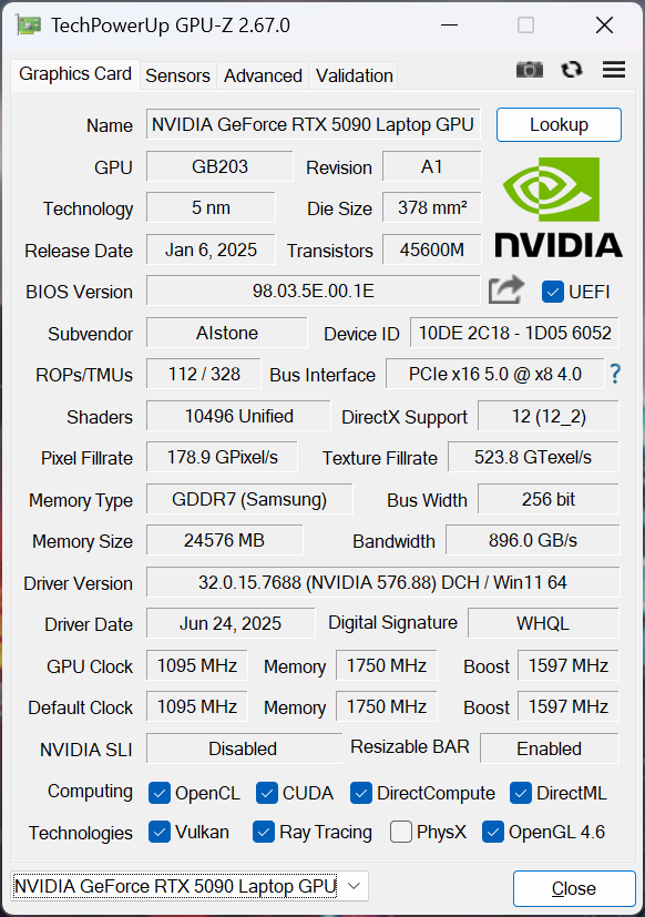 Дискретная видеокарта GeForce RTX 5090 работает на частоте 1095 МГц с ускорением до 1597 МГц, но все будет зависеть от нагрузки и температуры чипа и показатели могут быть значительно больше. TGP карты находится на уровне 175 Вт.