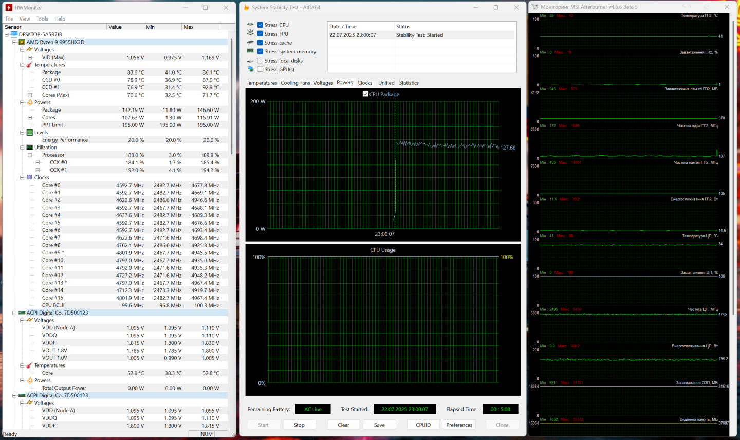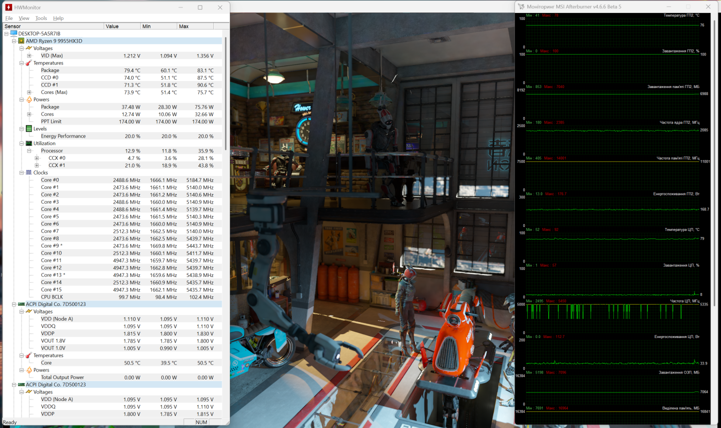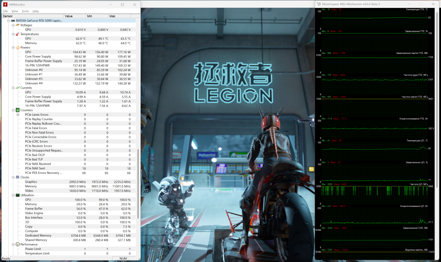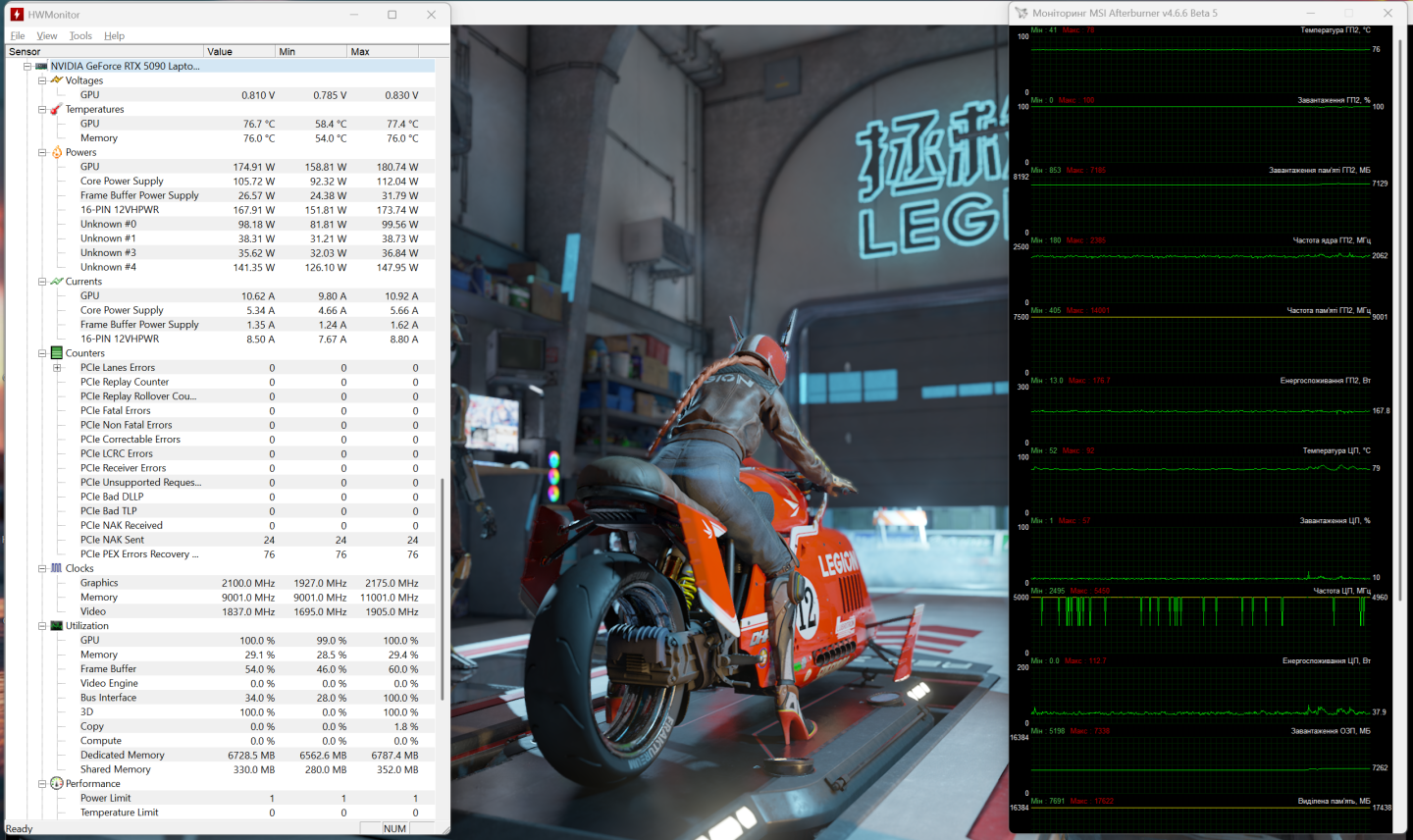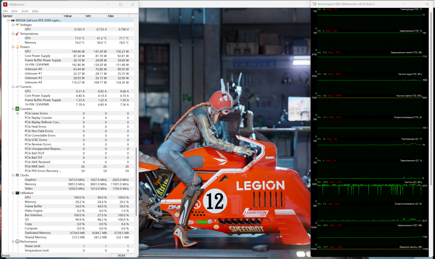 С жидкостным охлаждением все почти без изменений, но температуры стали намного лучше относительно воздушного охлаждения и составляют 95 °C максимум, а это на 13 градусов меньше! На самом деле охлаждение в таком режиме комбинированное и вентиляторы никуда не делись, но они вращаются на меньшей скорости, из-за чего общий уровень шума не превышает 45 дБ(А) и это очень неплохо при такой нагрузке.
