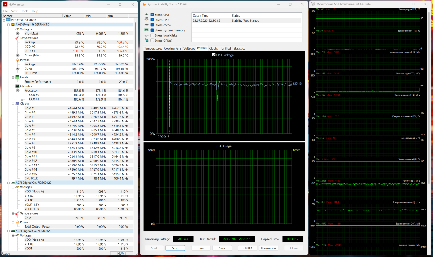Форсированный режим уже снимает лимиты и максимальная мощность процессора составляет 145 Вт при старте тестирования, а после нормализуется на 130 Вт в среднем. Теперь и температуры доходят до 108 градусов при 22 °C в помещении. Уровень шума — 50,9 дБ(А).