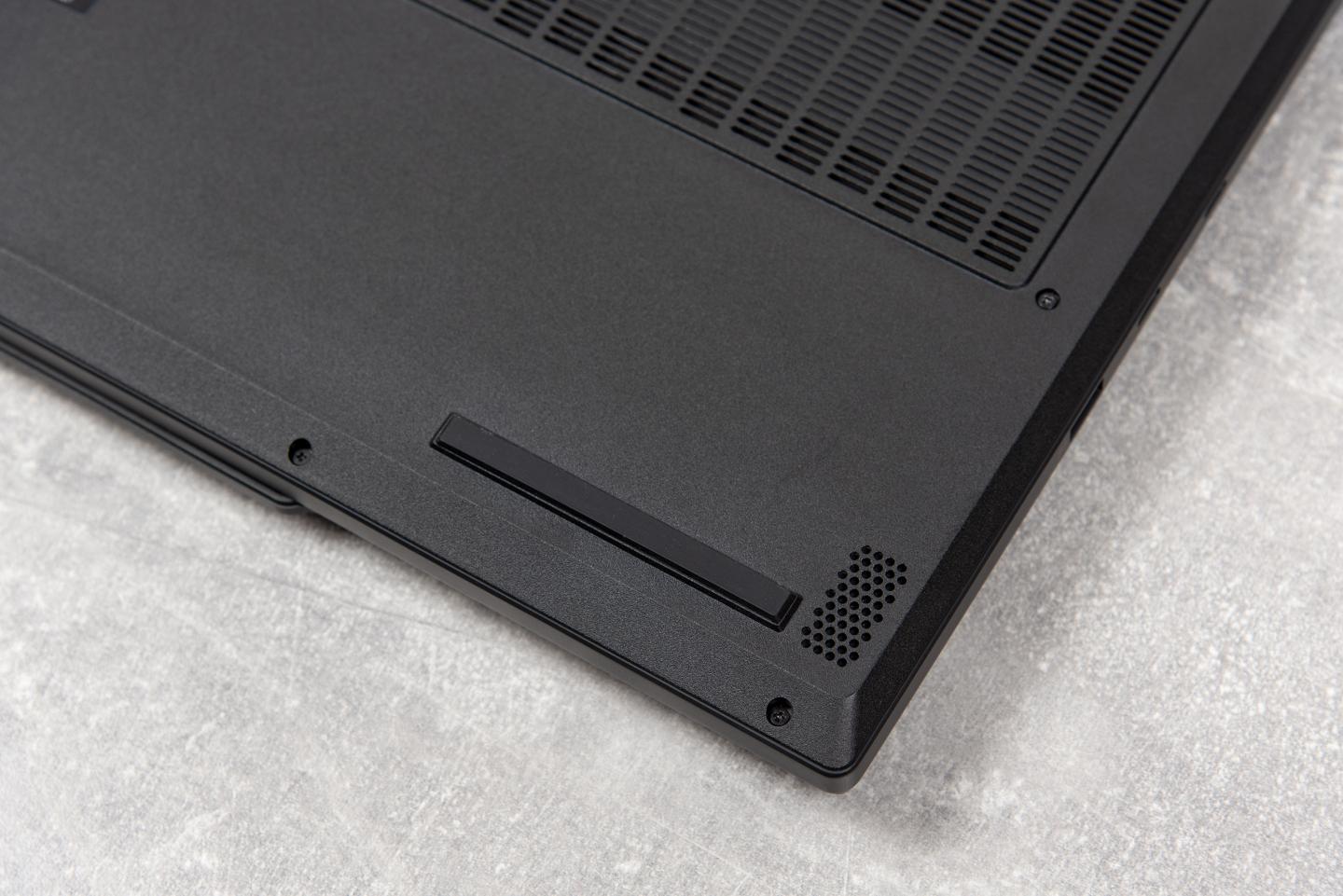 Размеры ноутбука составляют 344,9×255,35×19,95~21,54 мм при весе 1,9 кг, что делает его довольно компактным среди игровых мобильных продуктов. Верхняя крышка выполнена из металла, на которой присутствует лишь название серии устройств, тогда как все остальные детали корпуса пластиковые. Большая часть площади нижней крышки имеет решетку, но отверстия в ней присутствуют лишь в необходимых для хорошей вентиляции местах. Резиновые ножки здесь тонкие и длинные, задняя вообще сплошная по всей длине корпуса. Снизу в передней части присутствуют решетки для динамиков, а надпись audio by HARMAN на рабочей поверхности намекает на более-менее качественный звук.
