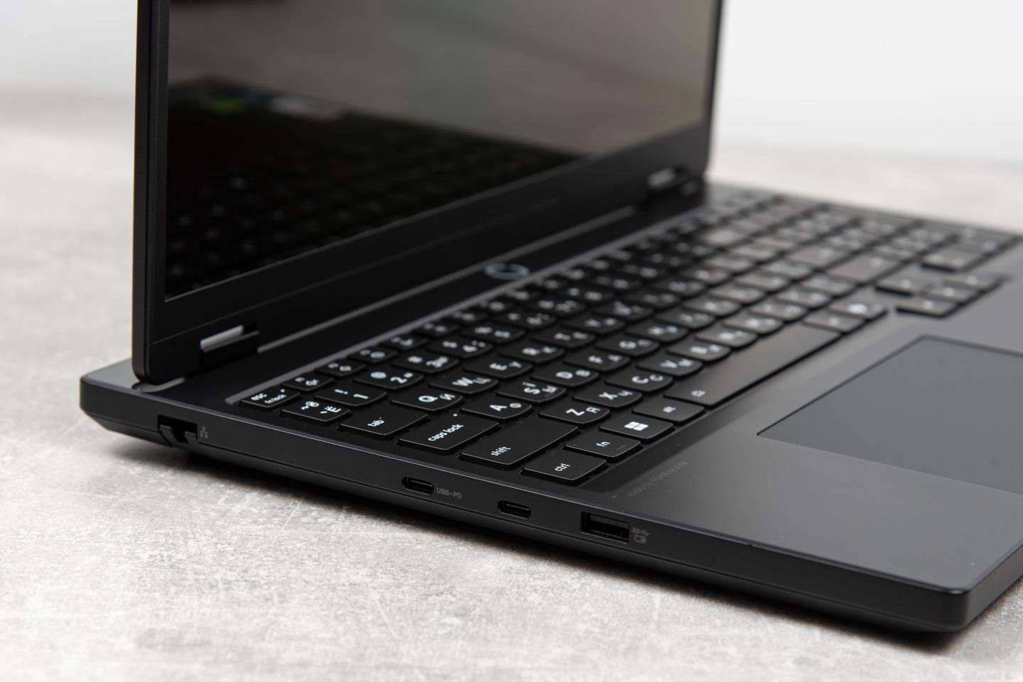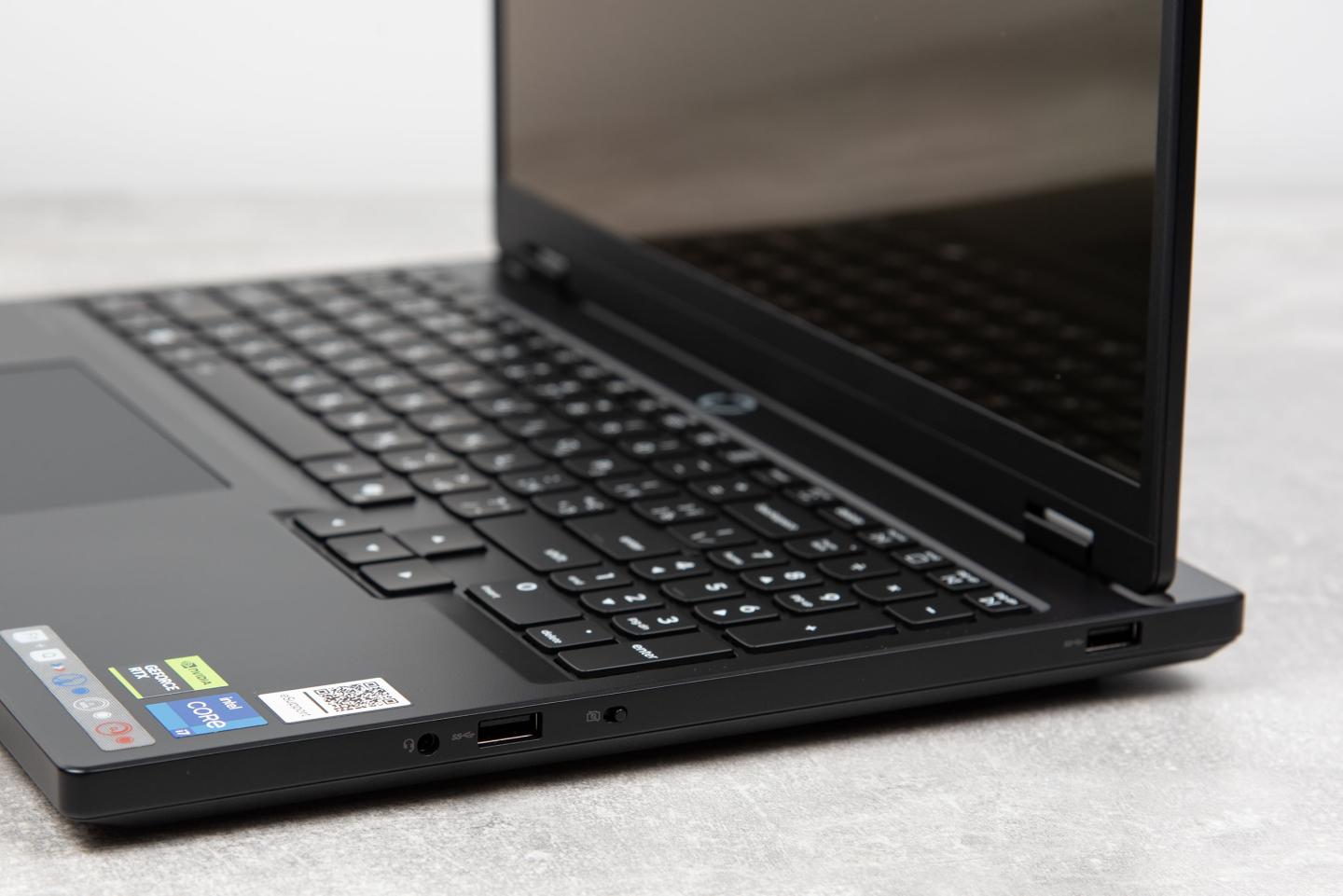 Количество портов и разъемов здесь довольно большое: слева присутствуют один USB‑A, два USB‑C с поддержкой DisplayPort (один даже с Power Delivery до 100 Вт), разъем Ethernet, а с правой стороны есть два USB‑A, комбинированный 3,5‑мм разъем для гарнитуры, а рядом с ними — переключатель электронной шторки веб-камеры. Также в задней части лэптопа, среди сопел для выхода горячего воздуха, размещены один HDMI и разъем питания, то есть, пользователь может подключить к ноутбуку несколько мониторов, клавиатуру, мышь и еще останется для «флешки» и USB-хаба или еще для чего-либо.