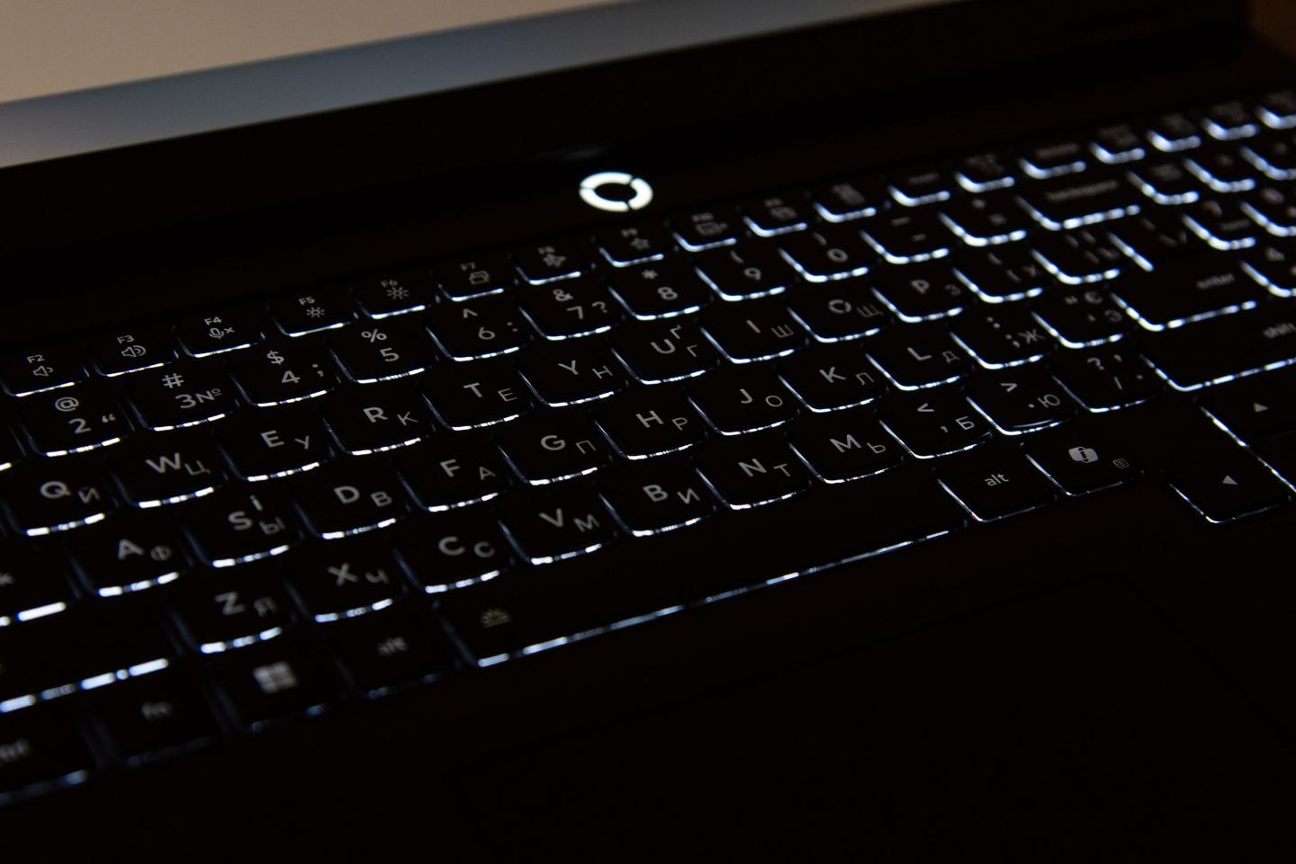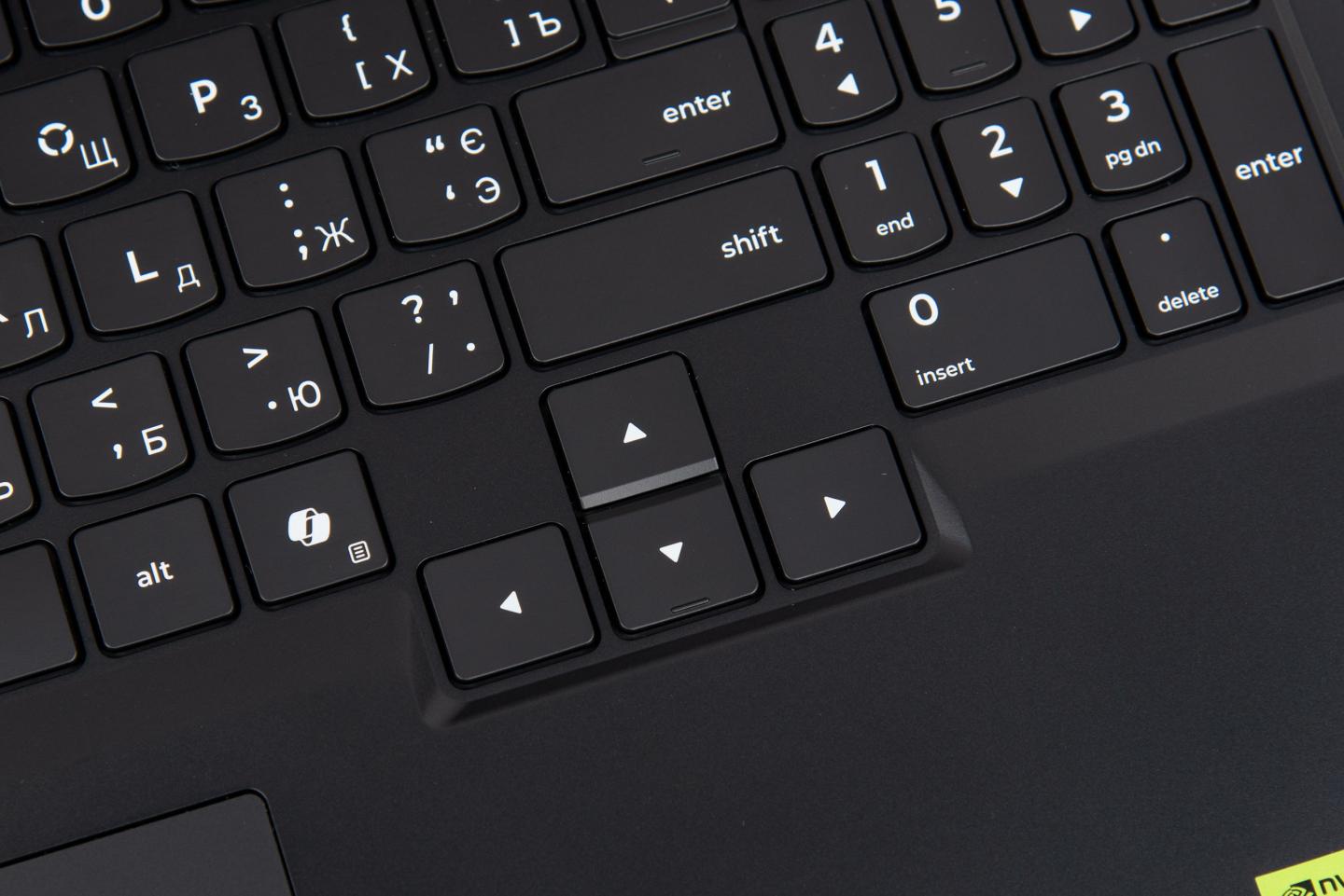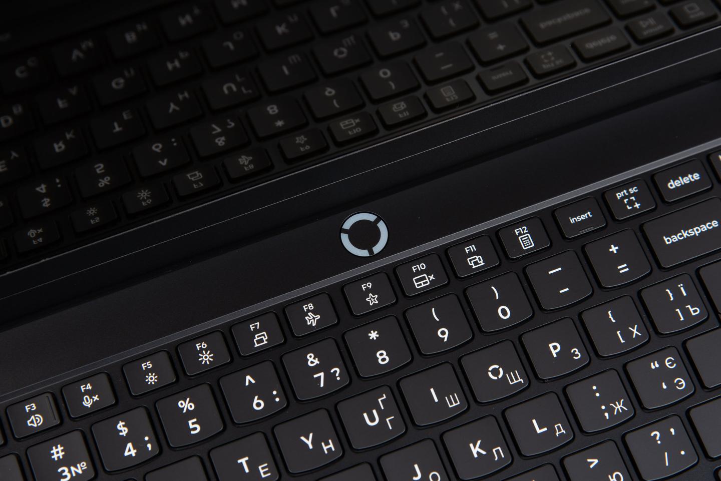 Используется клавиатура Legion TrueStrike островного типа с цифровым блоком, что понравится тем, кто работает с большим количеством данных. Клавиши имеют ход в 1,6 мм и мягкое нажатие. Кнопки стрелок большие и находятся ниже других клавиш, блок WASD стандартный и ничем не отличается от других кнопок. Есть функция управления проигрывателем, а кнопка включения отделена от остальных и находится над клавиатурой по центру. Вокруг нее присутствует световой индикатор в виде фирменной буквы «O», который соответствующим цветом сигнализирует о режиме работы ноутбука.