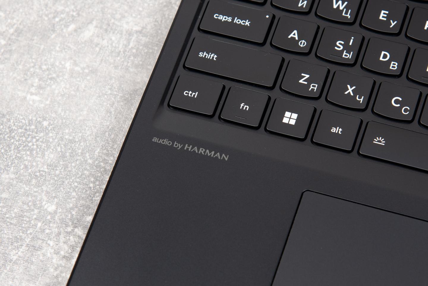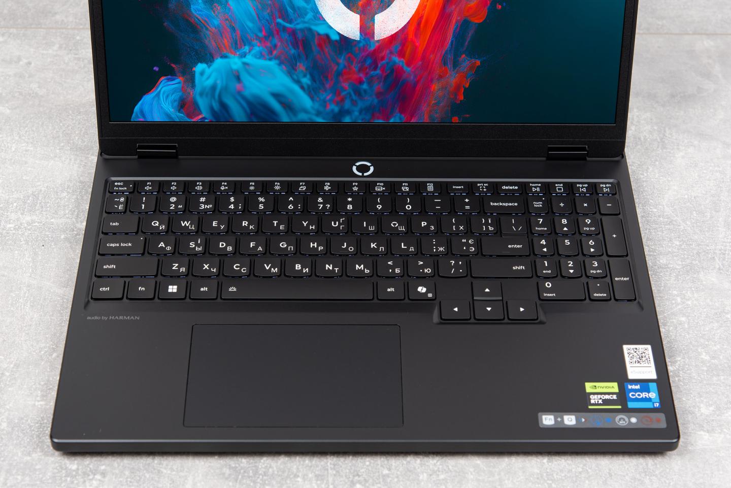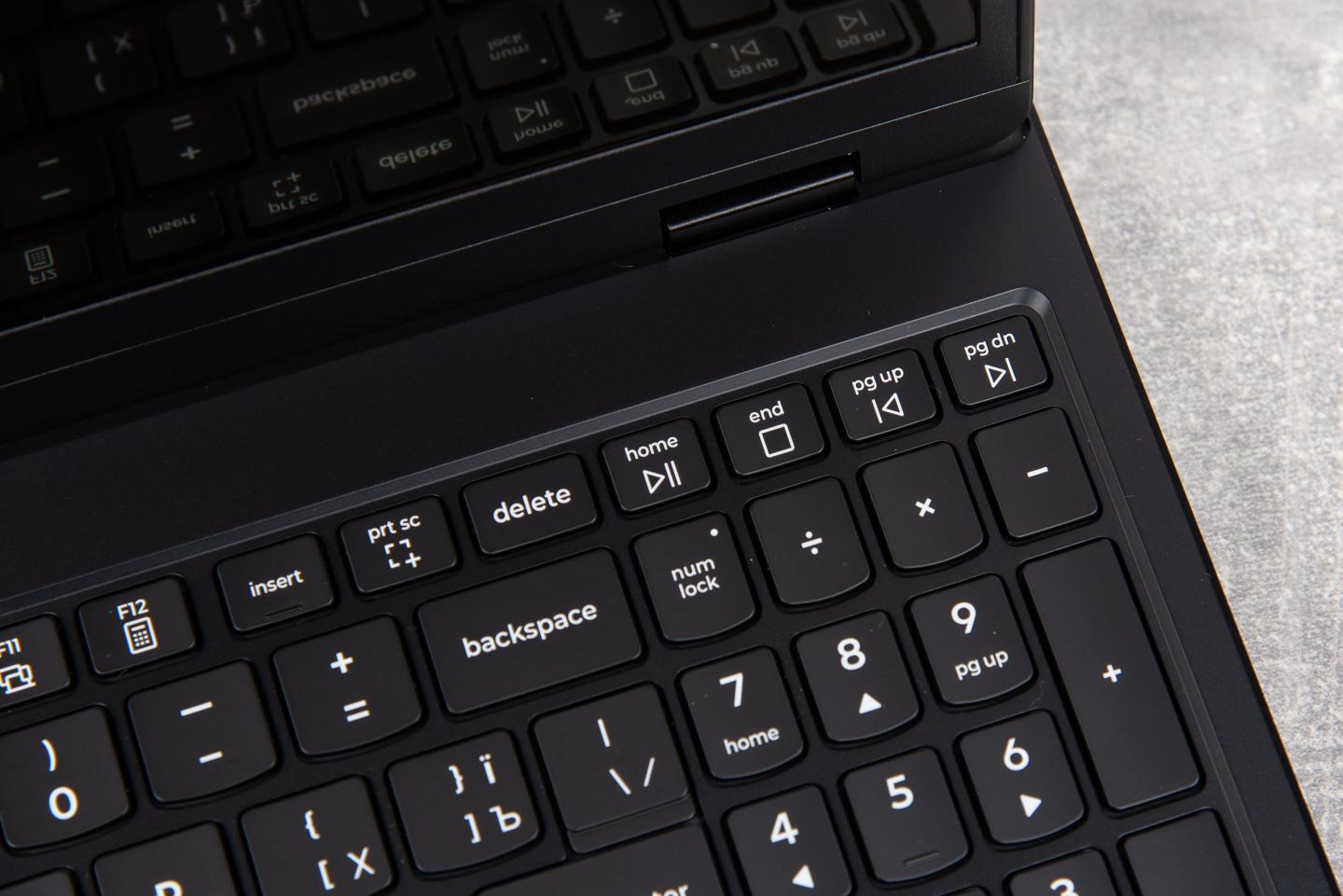 Используется клавиатура Legion TrueStrike островного типа с цифровым блоком, что понравится тем, кто работает с большим количеством данных. Клавиши имеют ход в 1,6 мм и мягкое нажатие. Кнопки стрелок большие и находятся ниже других клавиш, блок WASD стандартный и ничем не отличается от других кнопок. Есть функция управления проигрывателем, а кнопка включения отделена от остальных и находится над клавиатурой по центру. Вокруг нее присутствует световой индикатор в виде фирменной буквы «O», который соответствующим цветом сигнализирует о режиме работы ноутбука.