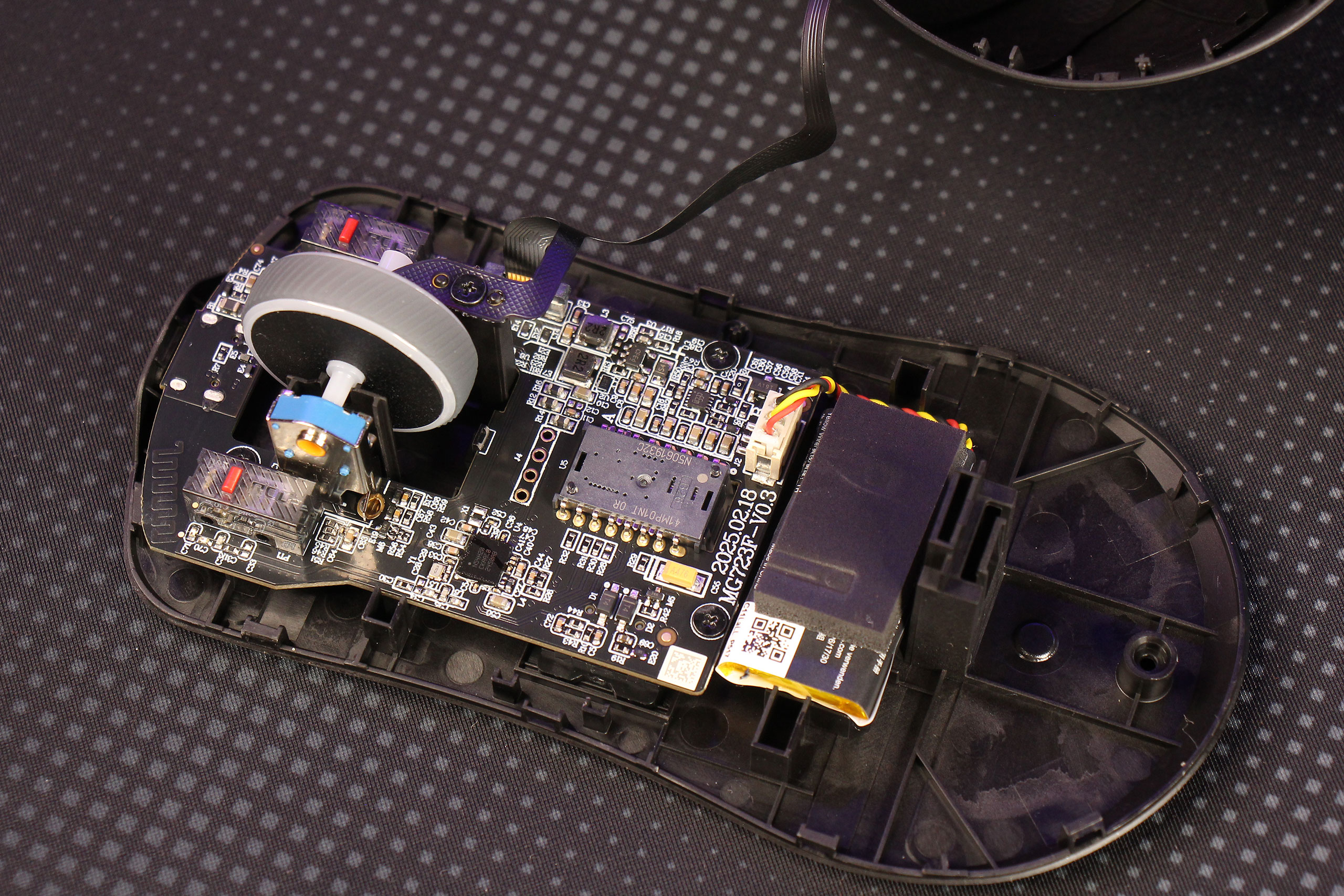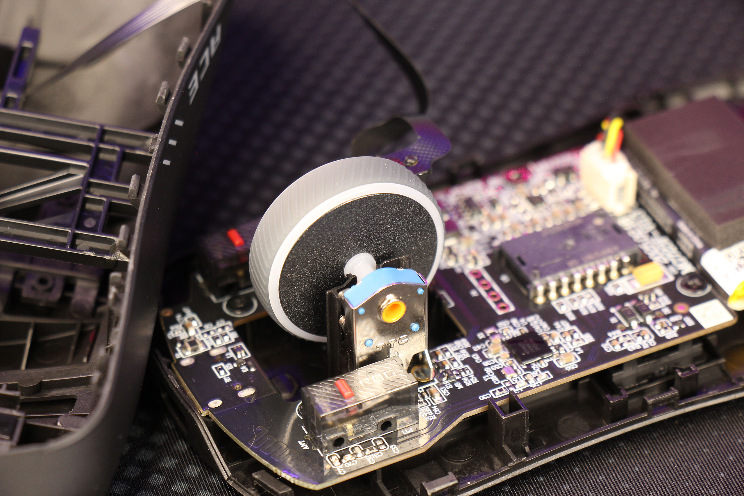 Энкодер колесика — механический, производства TTC. Рядом видны распаянные переключатели ASUS ROG 100M для основных кнопок.