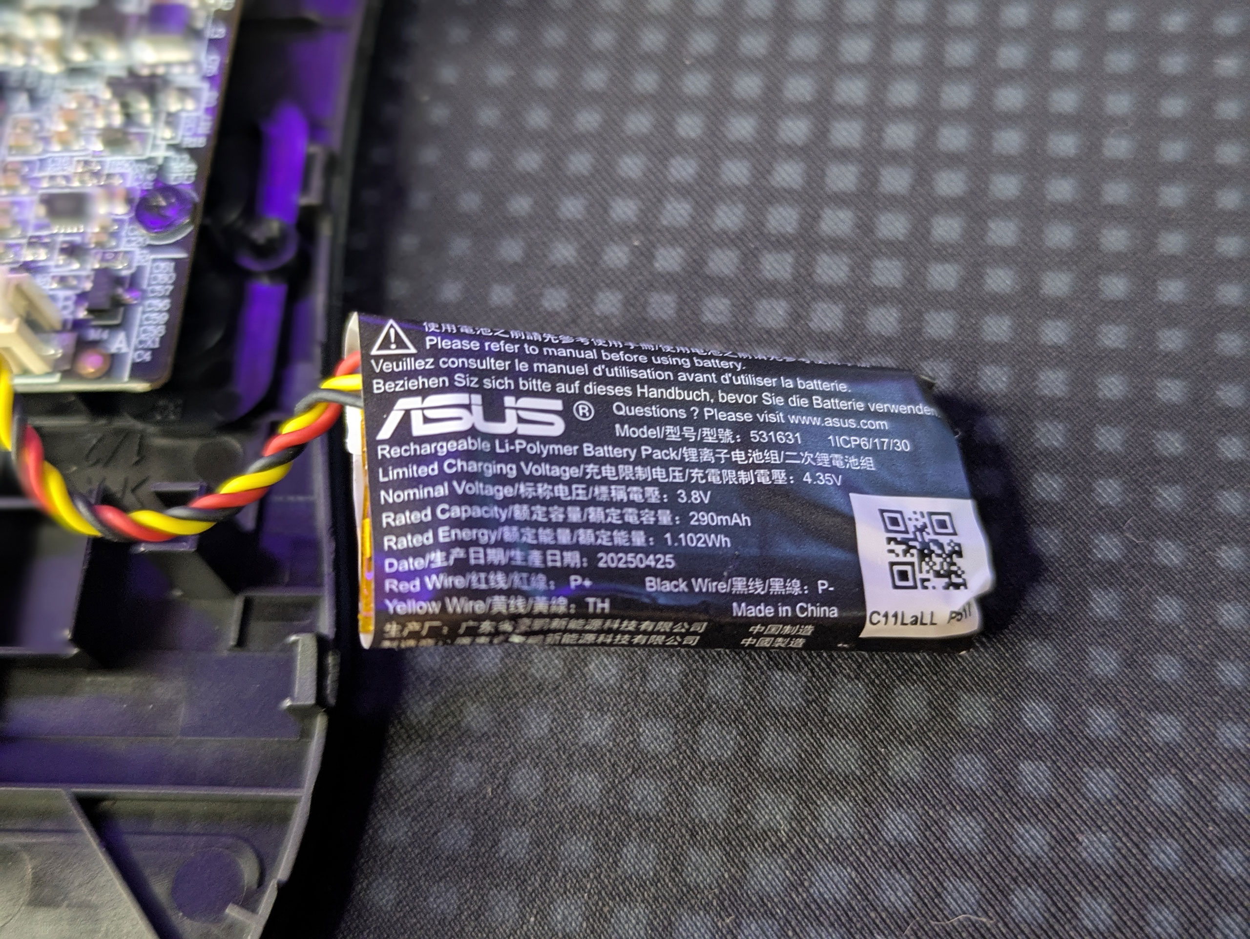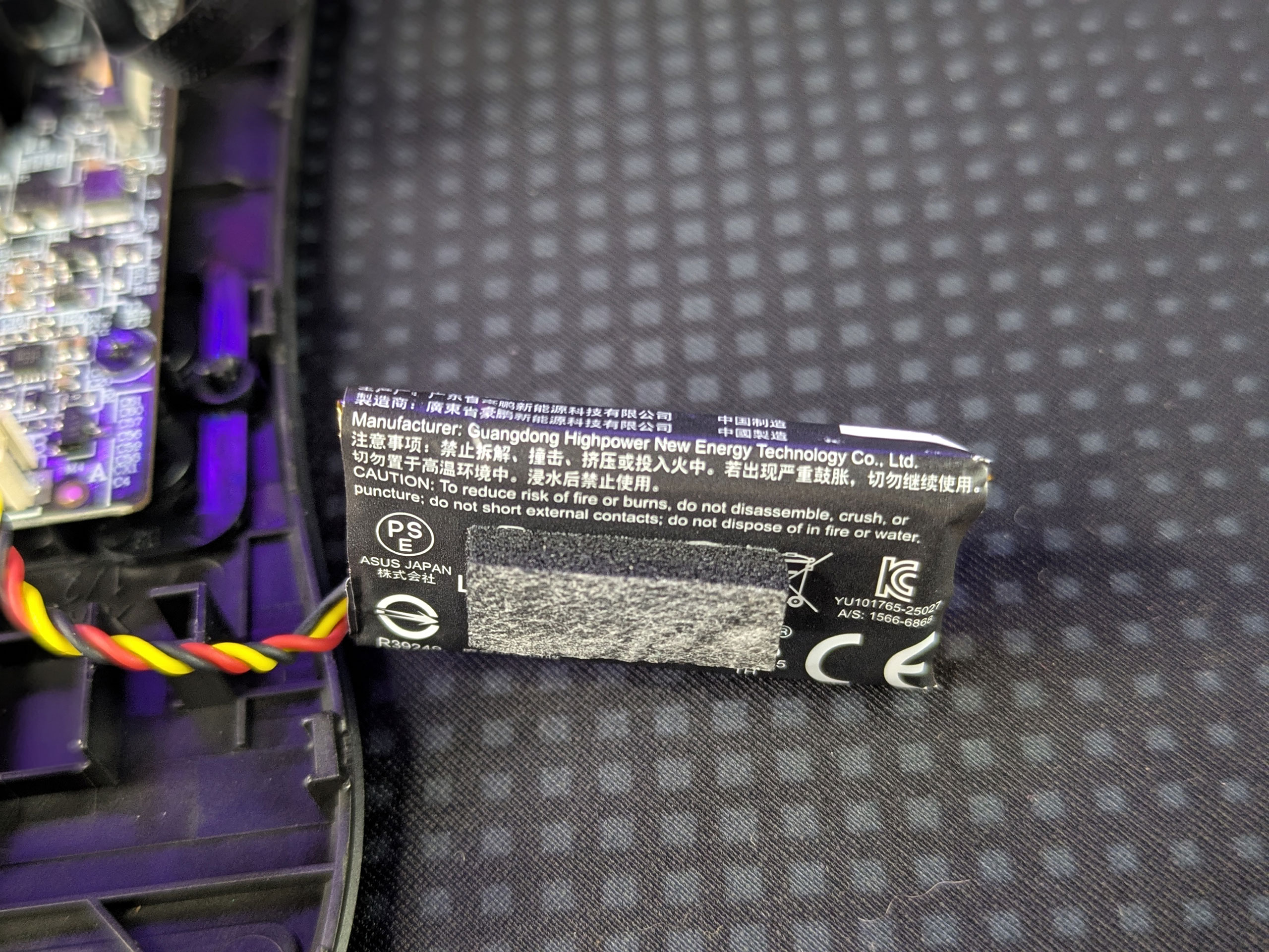 Литий-полимерная батарея емкостью 1,102 Вт⋅ч (290 мАч, 3,8 В) производства Guangdong Highpower New Energy Technology, хоть и с большой эмблемой ASUS, по своему весу и емкости находится на нижней границе того, что позволяют себе ставить известные производители.