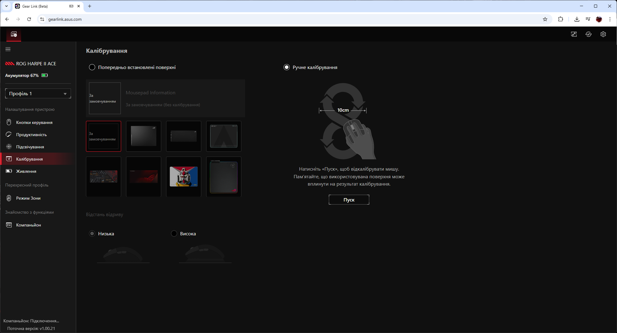 - Калибровка под поверхность (включая возможность выбрать настройки под ROG Sheath).