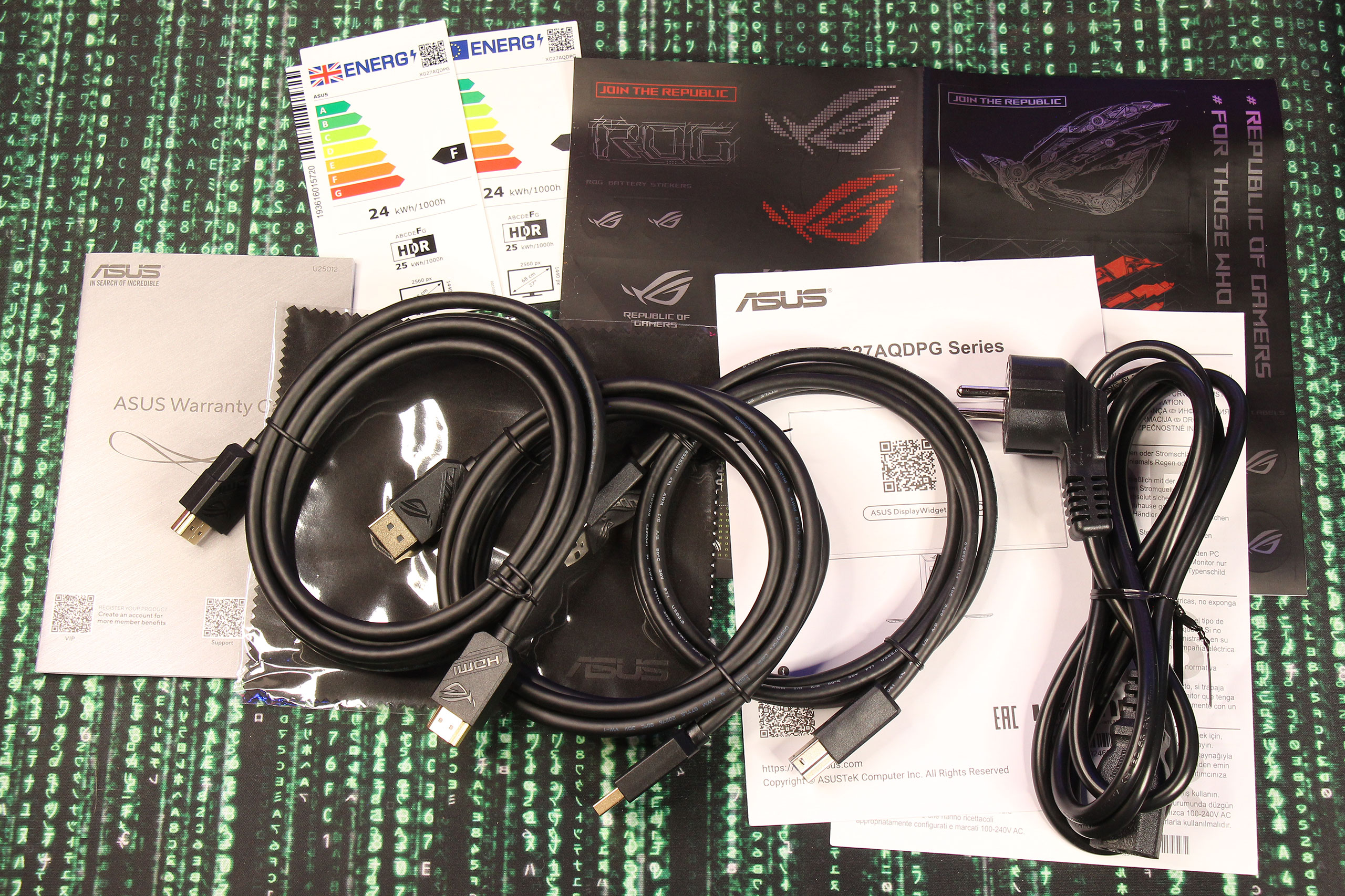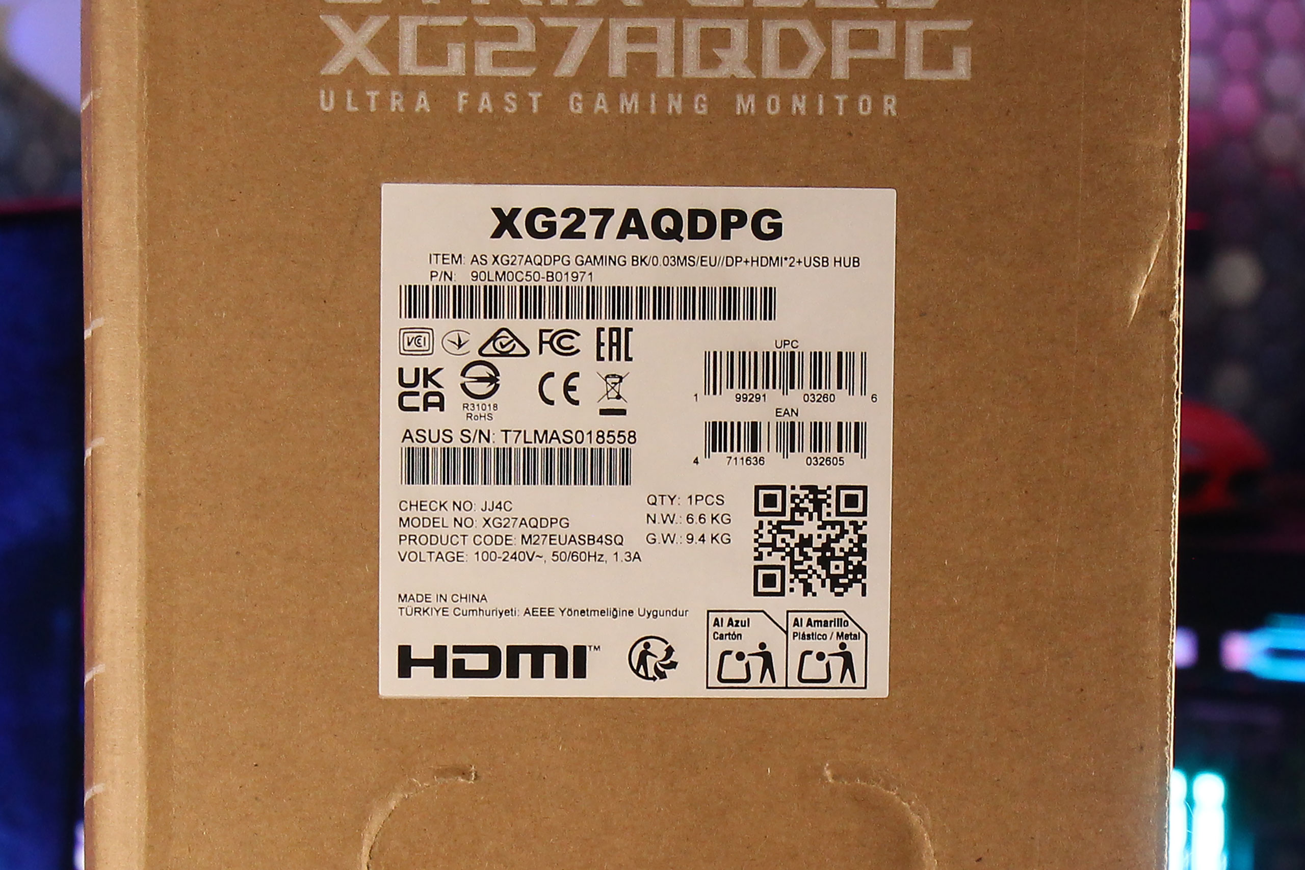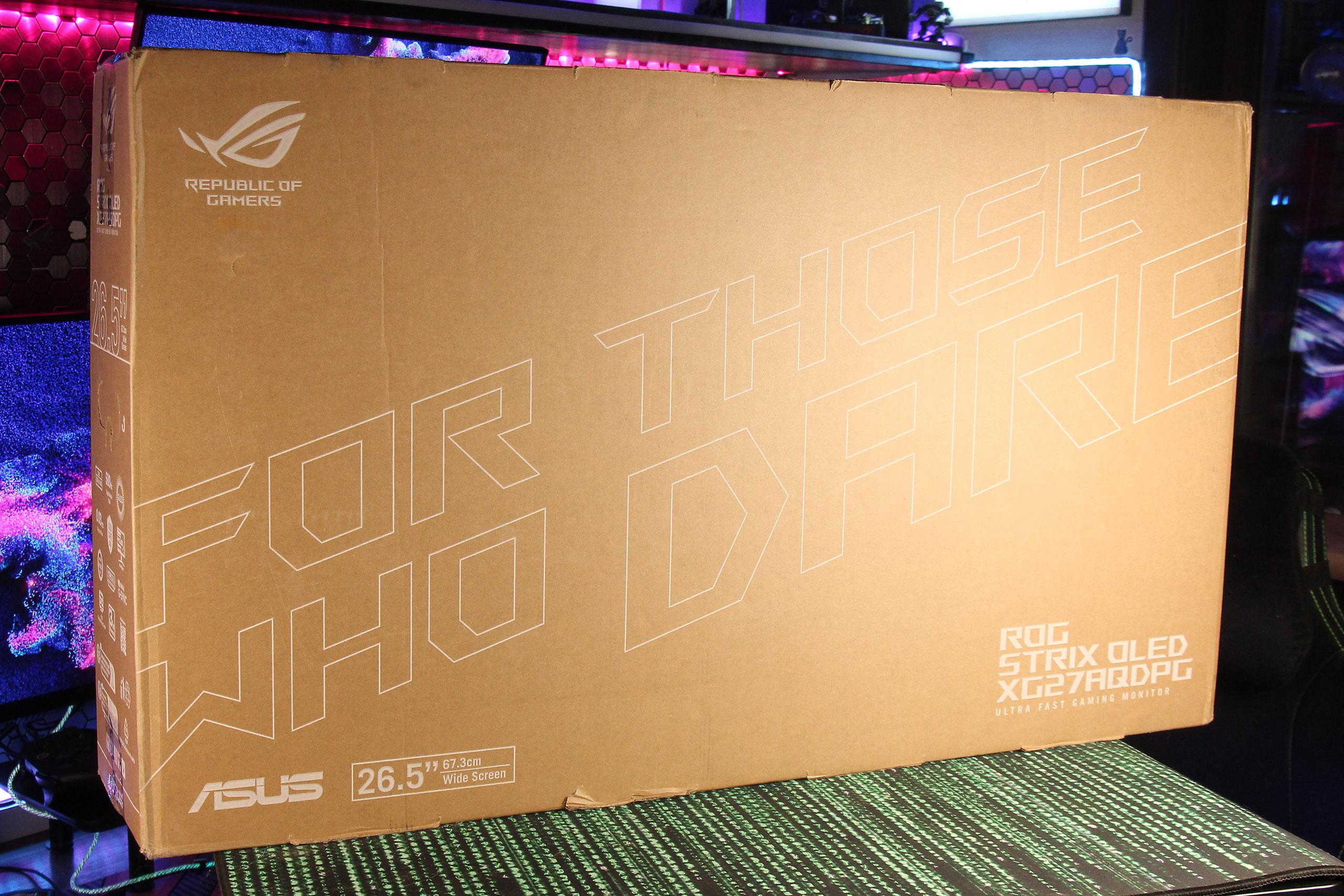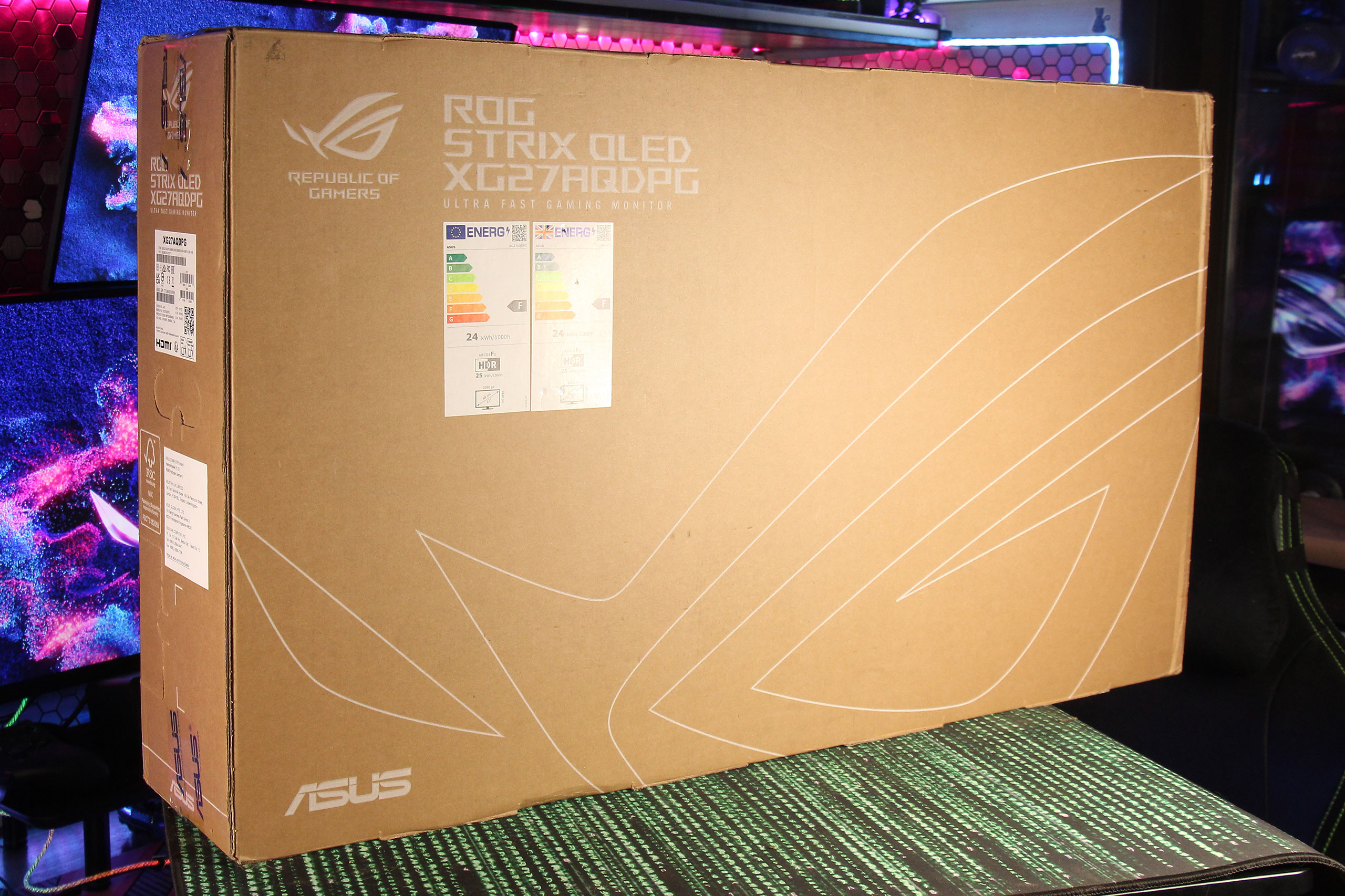 ASUS ROG Strix OLED XG27AQDPG поставляется в большой, как для 27-дюймовой модели, картонной коробке. Все компоненты размещены в отдельных секциях с надежной защитой.