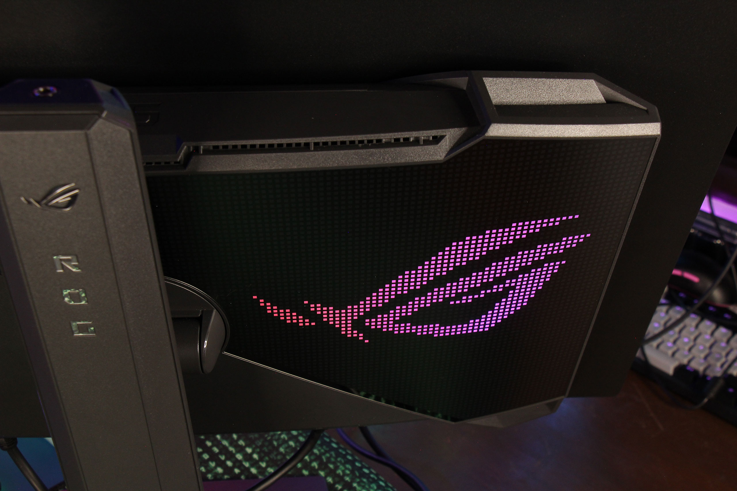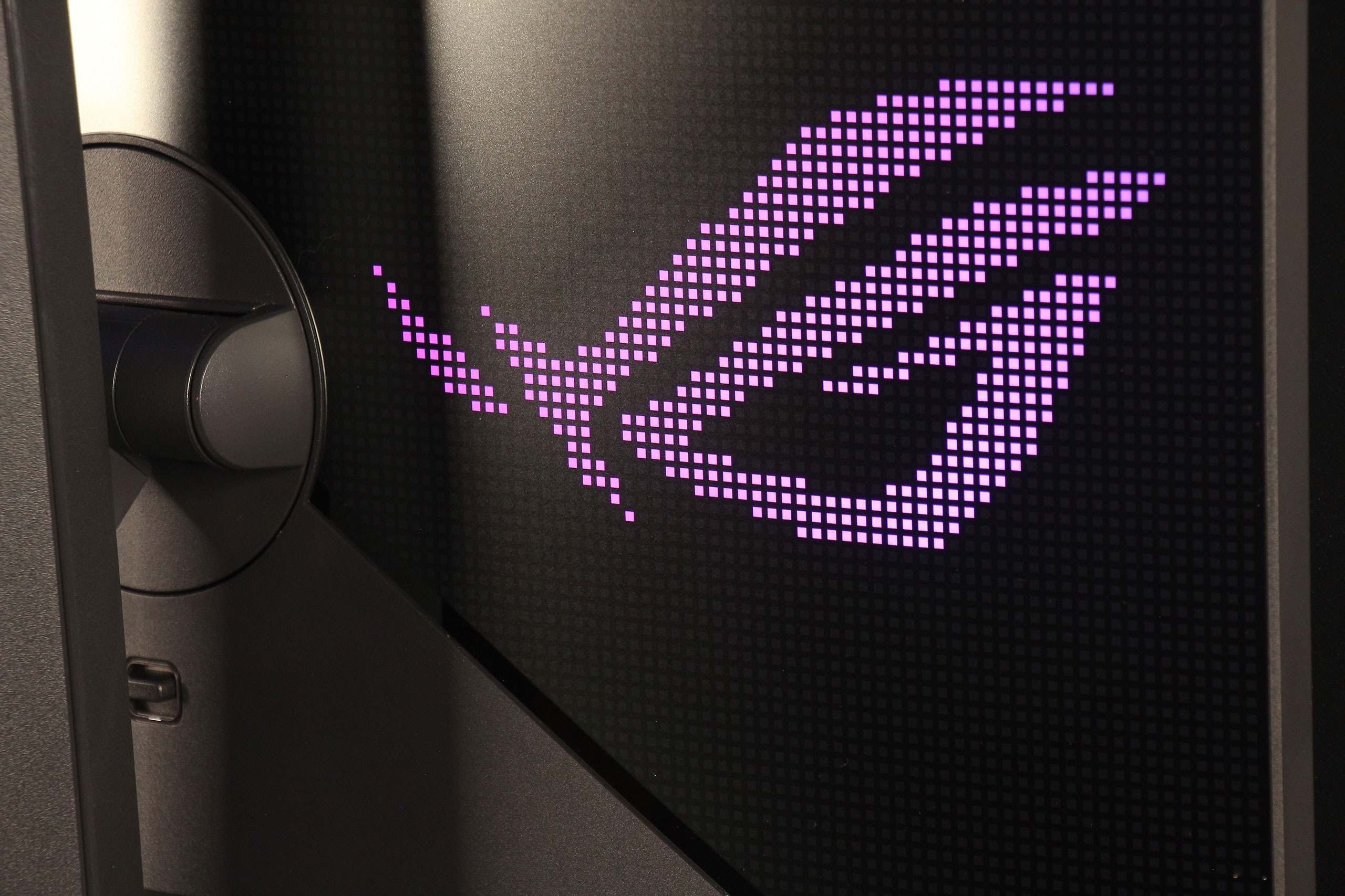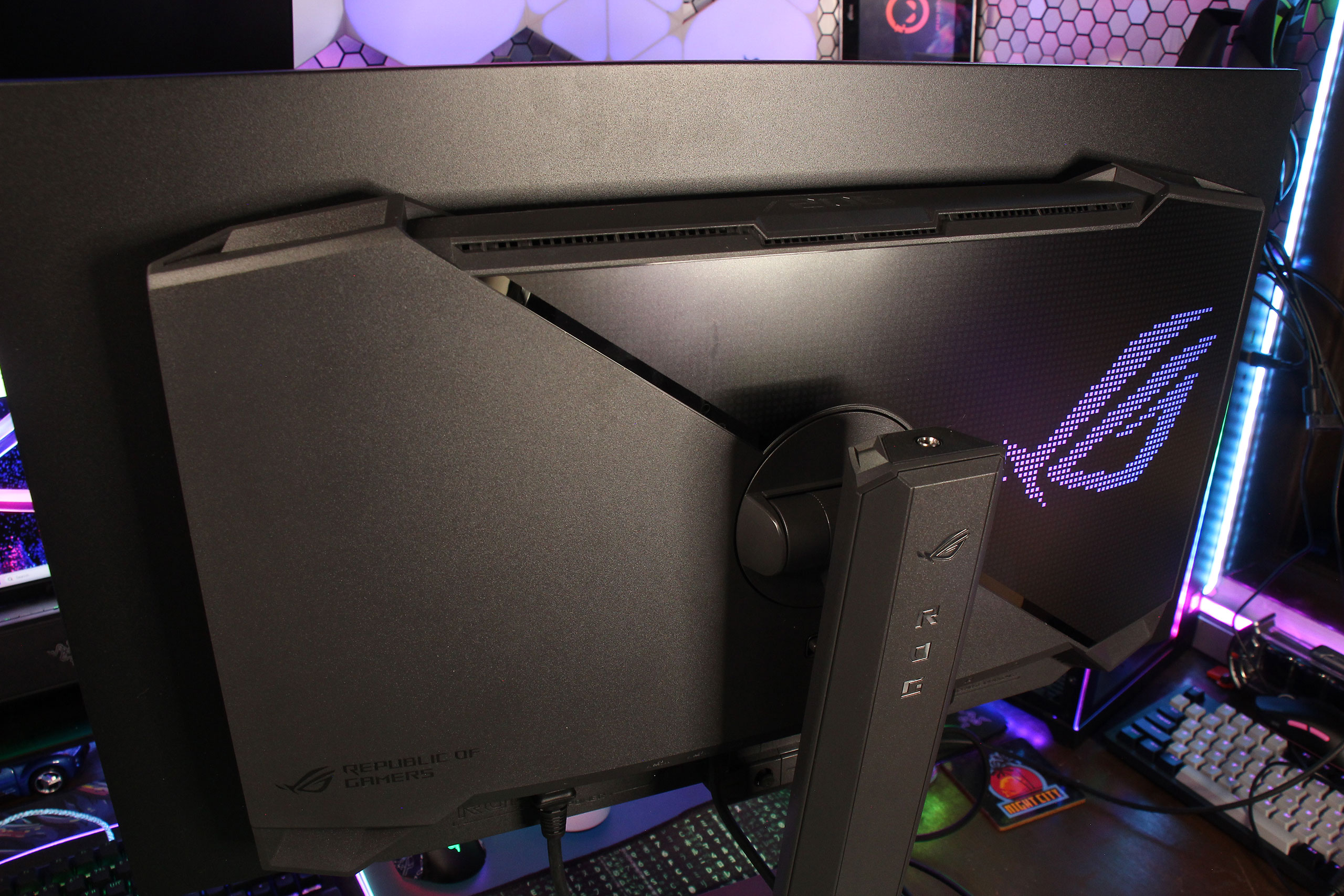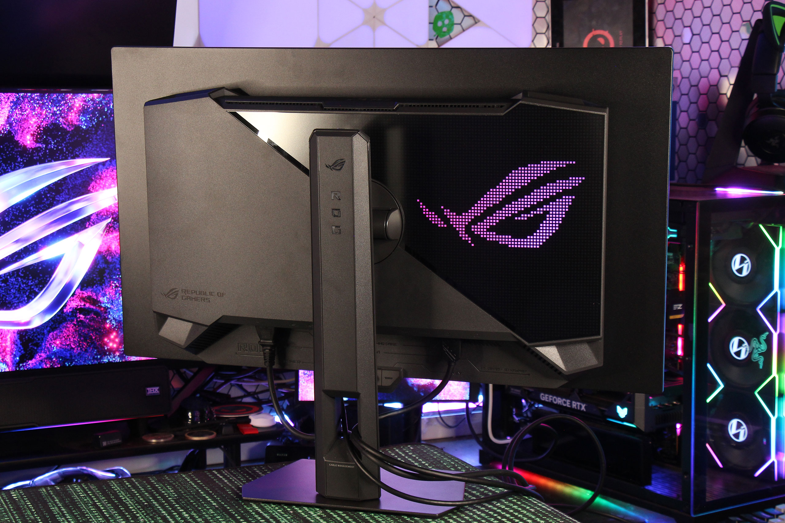 Задняя панель оформлена в киберпанковом (слова производителя!) стиле с футуристическими узорами и RGB-подсветкой Aura Sync в виде эмблемы Republic of Gamers, синхронизирующейся с другими устройствами экосистемы ASUS. Вентиляционные отверстия оптимизированы для эффективного отвода тепла от QD-OLED панели.